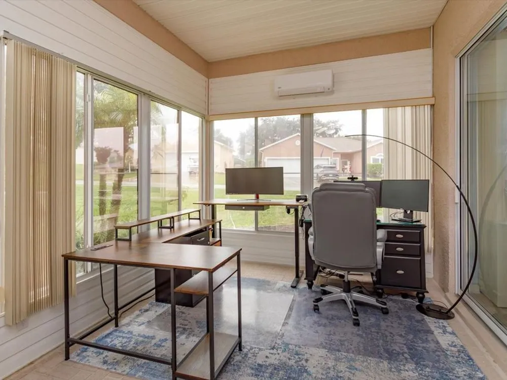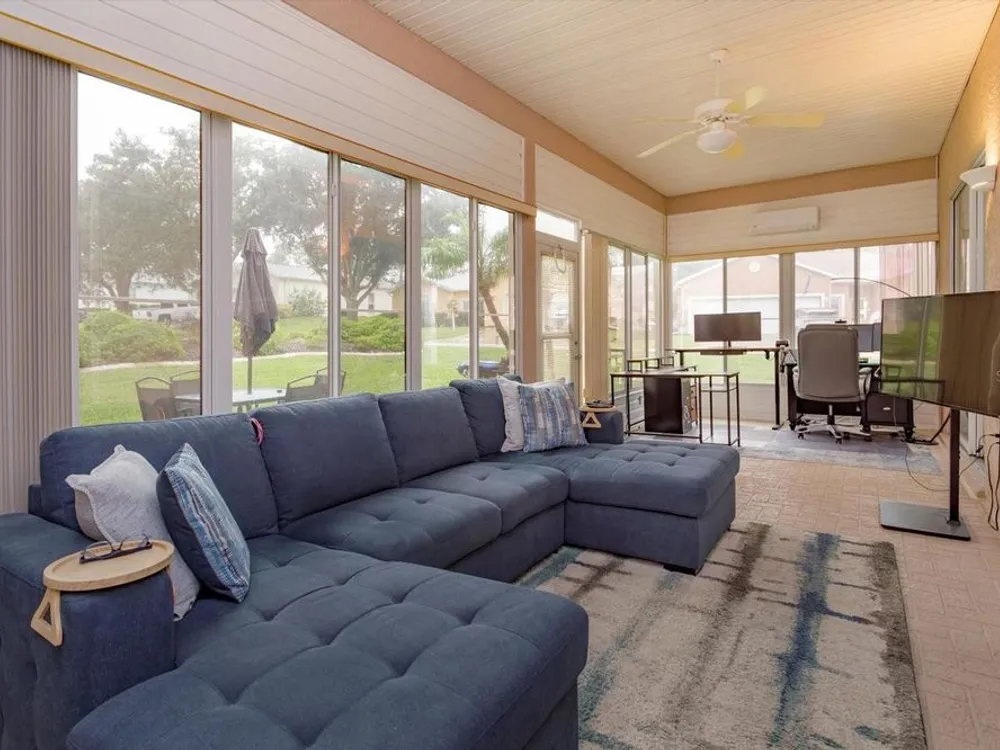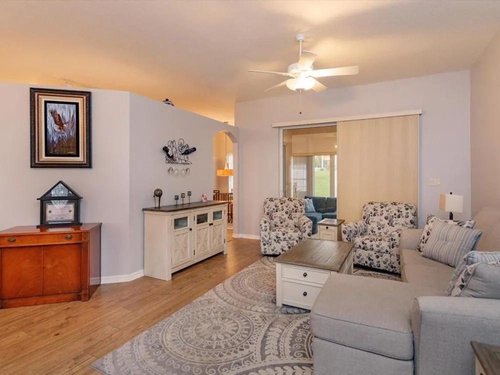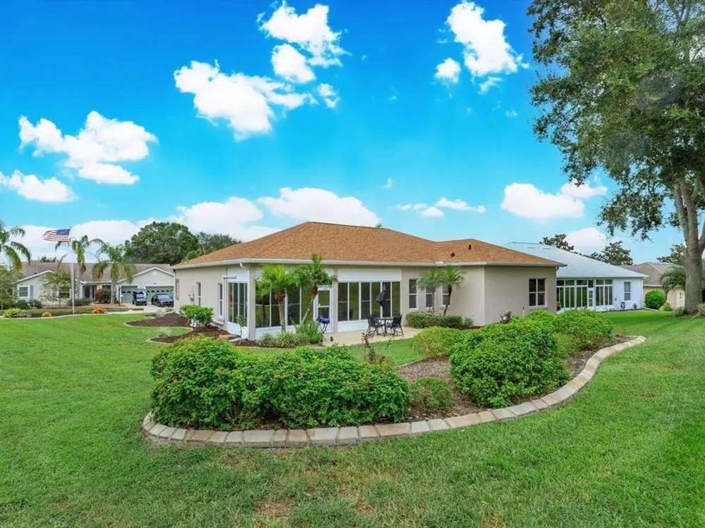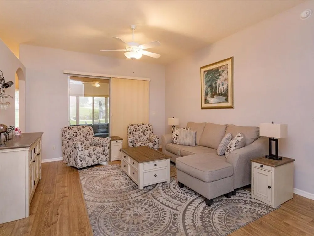 This beautiful home was built in 2001 but with the modern features it feels like a new home. Located on a gorgeous corner lot with a decorative driveway. The Enclosed Lanai can be used year round as a mini/split has been added to provide comfort and is accessible from the Kitchen, Living Room or Primary Bedroom. The windows have been upgraded to THERMAL PANE TINTED WINDOWS. This home has two Primary Bedrooms with ensuite bathrooms. The closets throughout the home have been upgraded with closet organizers to provide maximum storage! The Corian countertops and solid wood cabinets make the kitchen classic and beautiful. There is a large indoor laundry room that provides additional storage as well as a half bath. The garage is oversized at 690 sf. It has added overhead storage racks and is bigger than most of the other garages in the community. There is an electric roll down privacy screen to provide a nice breeze while working on projects in the garage. The gutters on this home have been upgraded to LEAF GUARDS, so you'll enjoy drainage without the clean out. *Roof 2017*HVAC High Efficiency 14.5s TRANE Located in the beautiful Plantation at Leesburg, in Sawgrass Village, a 55 plus community offers two full size golf courses, 3 clubhouses; all with heated pools, tennis, pickleball, pool tables, darts and more! There is an on-site restaurant so you can take a quick golf cart ride to enjoy food and live music with friends!