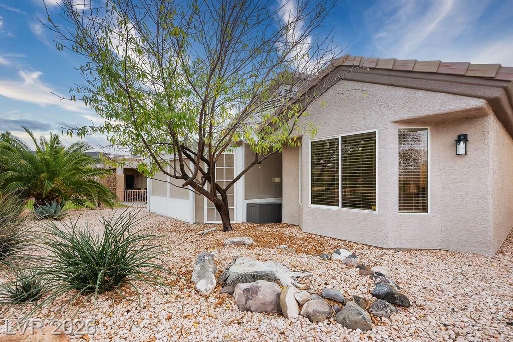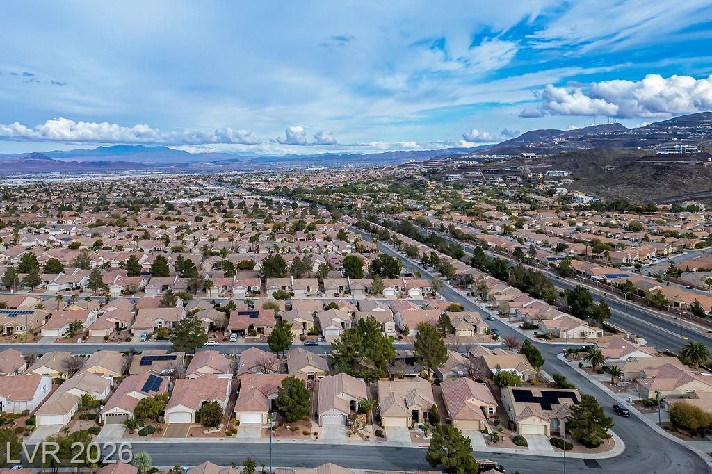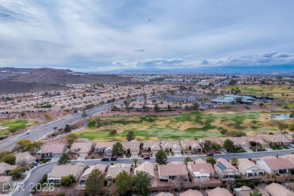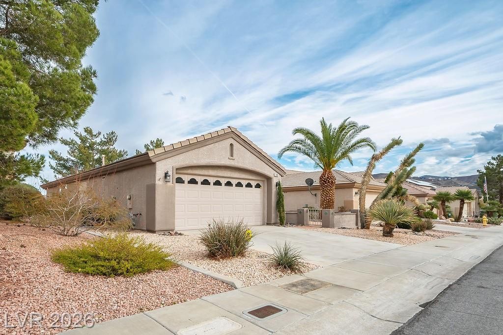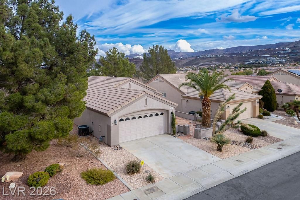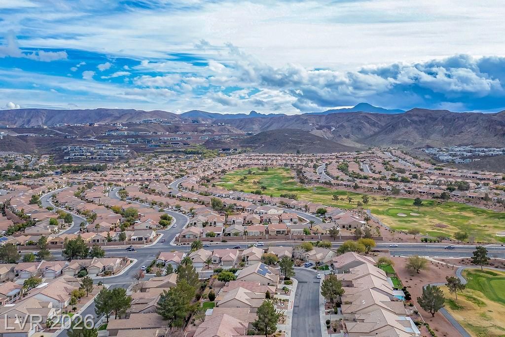 Beautiful, move-in ready home in Sun City MacDonald Ranch, offering sweeping sunrise and mountain views on an elevated lot—55+ community living at its best. Designed to feel light, airy, and effortlessly elegant, with over $40K in upgrades. The open-concept great room is filled with natural light and flows seamlessly to a screened-in patio, ideal for peaceful retreats, relaxing in tranquil desert scenery, or social entertaining.The spacious kitchen boasts stainless steel appliances, a serving bar, and an adjacent breakfast or flex room. The east-facing primary suite features a bay window overlooking views, a custom walk-in closet, and a walk-in shower with seating. Additional highlights include a separate office, courtyard entry, and laminate wood flooring throughout. Residents enjoy one of Henderson’s premier 55+ communities, featuring golf, pickleball, a resort-style clubhouse, Desert Willow Restaurant, and a vibrant calendar of social activities.