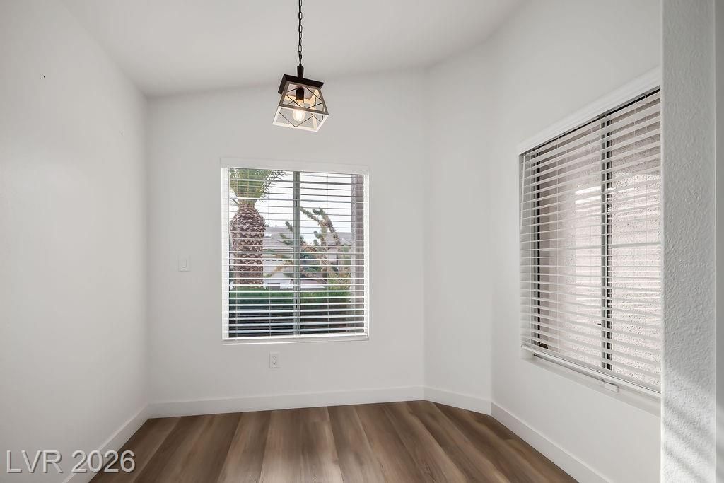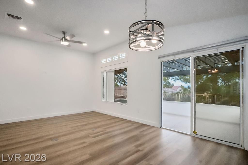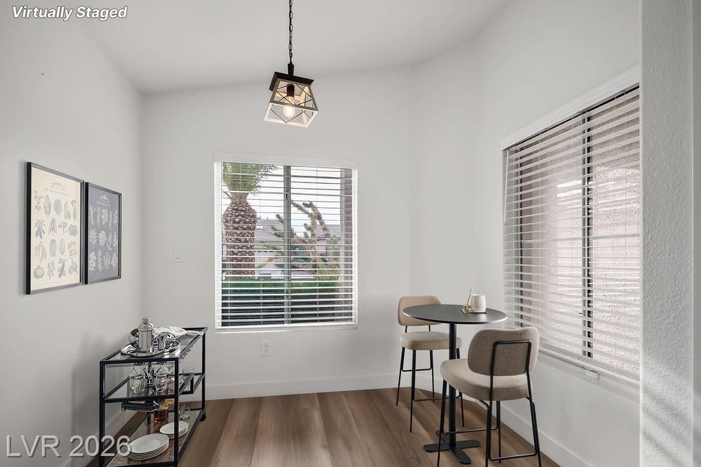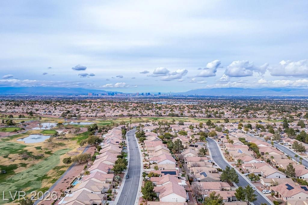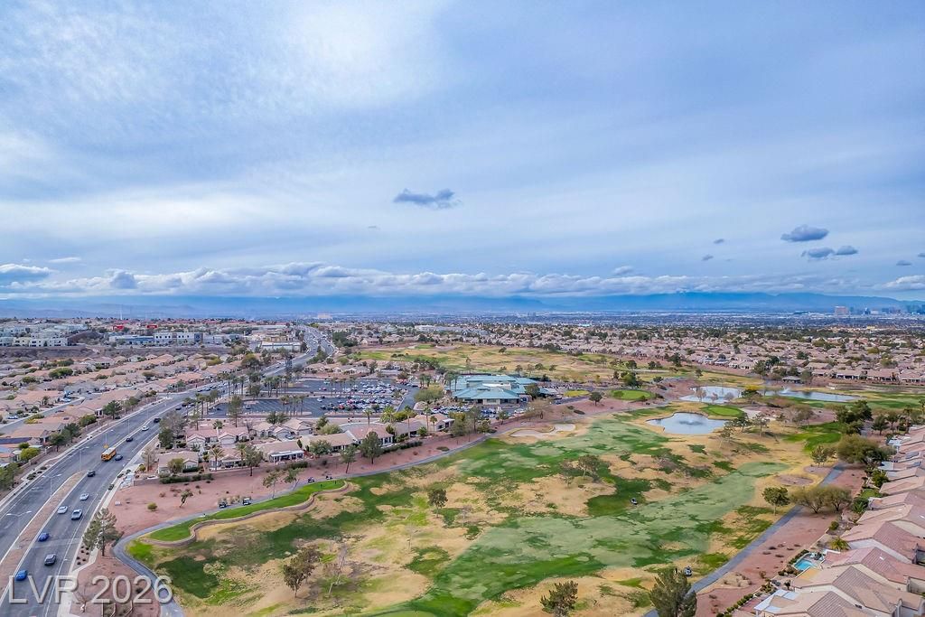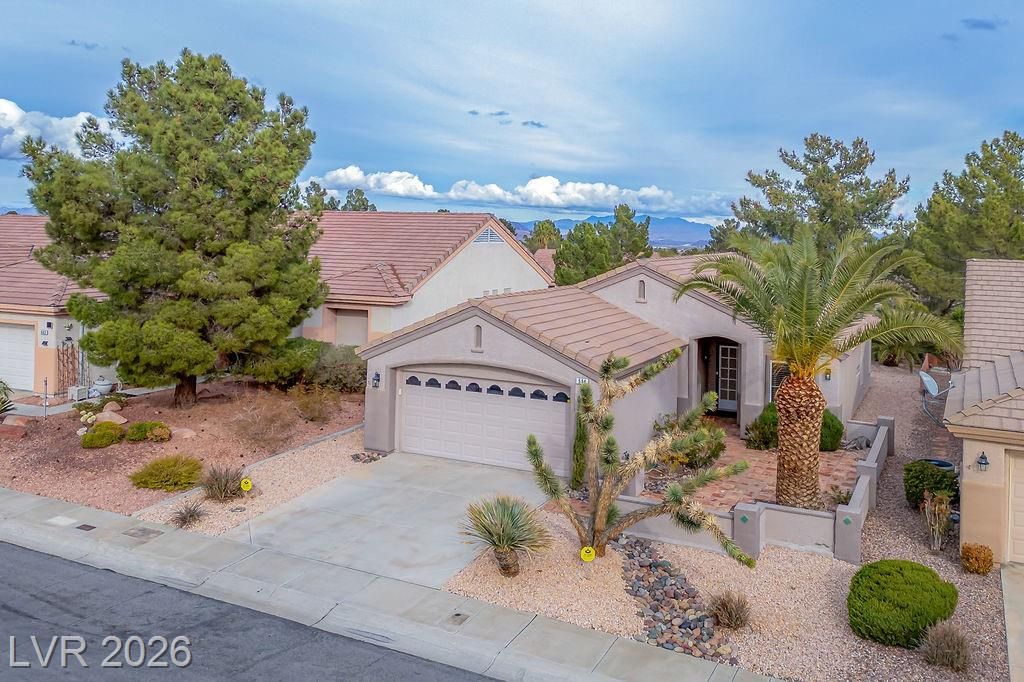 Beautiful, move-in ready home in Sun City MacDonald Ranch, offering sweeping sunrise and mountain views on an elevated lot—55+ community living at its best. Designed to feel light, airy, and effortlessly elegant, with over $40K in upgrades. The open-concept great room is filled with natural light and flows seamlessly to a screened-in patio, ideal for peaceful retreats, relaxing in tranquil desert scenery, or social entertaining.The spacious kitchen boasts stainless steel appliances, a serving bar, and an adjacent breakfast or flex room. The east-facing primary suite features a bay window overlooking views, a custom walk-in closet, and a walk-in shower with seating. Additional highlights include a separate office, courtyard entry, and laminate wood flooring throughout. Residents enjoy one of Henderson’s premier 55+ communities, featuring golf, pickleball, a resort-style clubhouse, Desert Willow Restaurant, and a vibrant calendar of social activities.