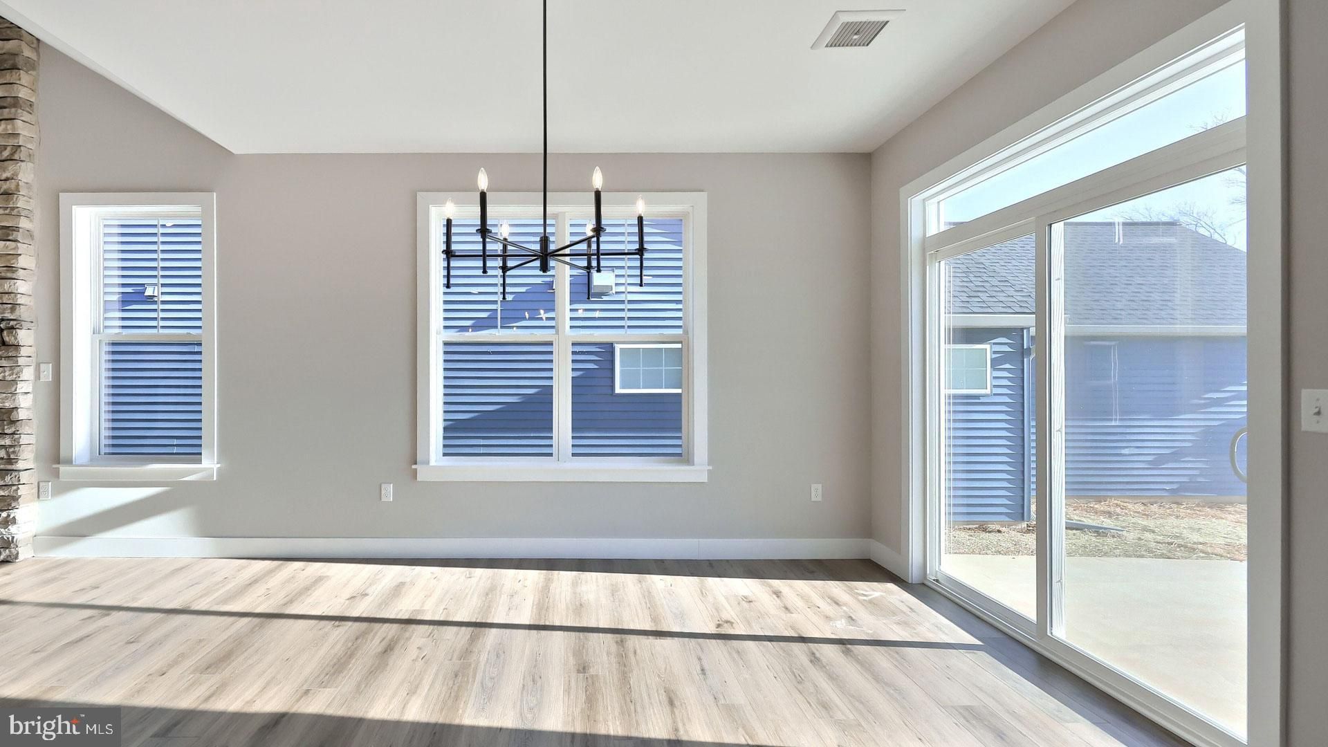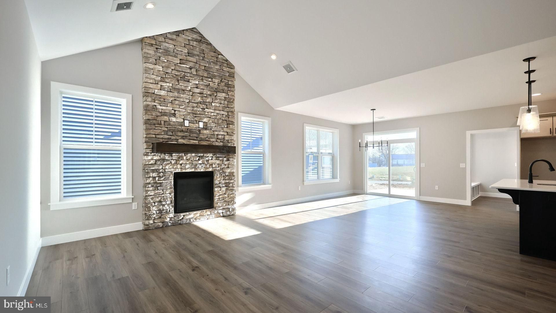 This charming 1-story home in our Winding Creek 55+ community includes a welcoming front porch, 9’ ceilings, and an unfinished bonus room on the 2nd level. The 2-car, rear-load garage opens to a mudroom complete with a built-in bench and large pantry. At the front of the home, there are 2 bedrooms and a full bathroom. Stylish vinyl plank flooring in the foyer extends throughout the main living areas. The living room boasts a cathedral ceiling and a cozy gas fireplace with floor to ceiling stone. The kitchen features stainless steel appliances, attractive cabinetry and quartz countertops with a tile backsplash. The sunny dining area provides sliding glass door access to the rear patio. Tucked quietly to the back of the home, the owner’s suite includes a private bathroom with a double bowl vanity, tile shower, and an oversized closet.