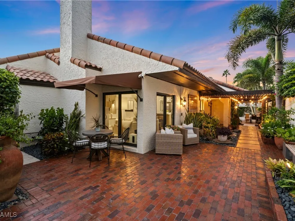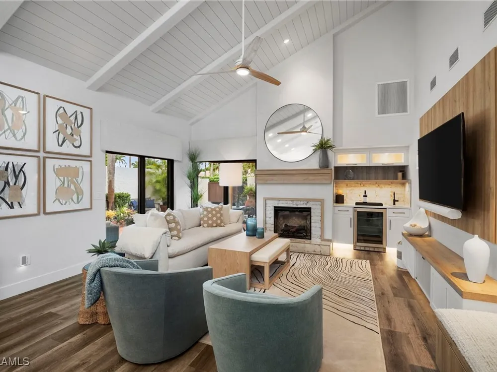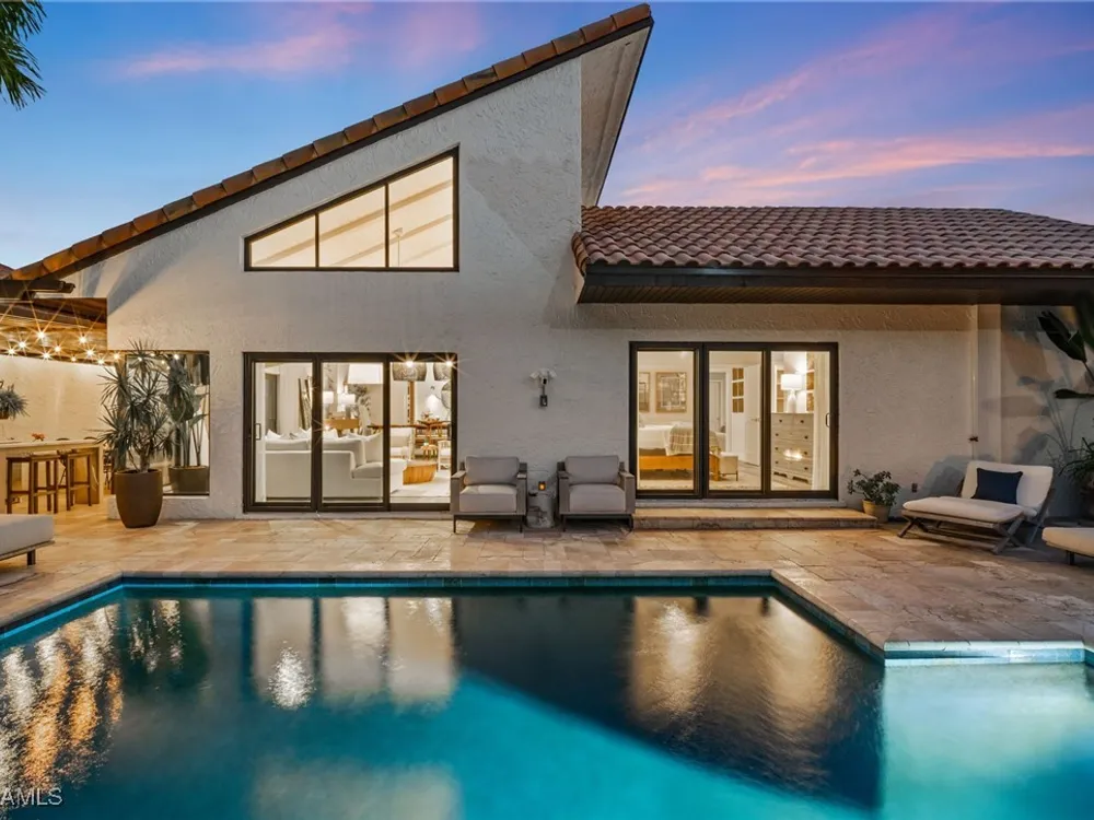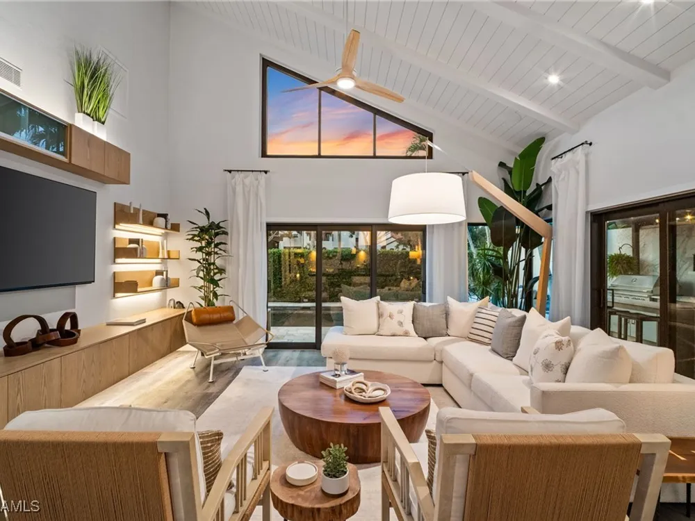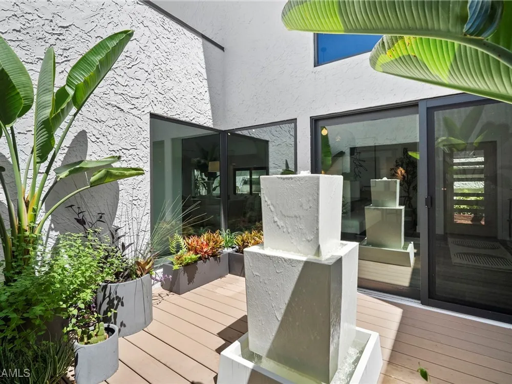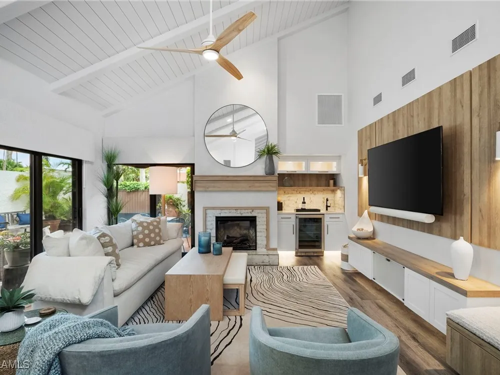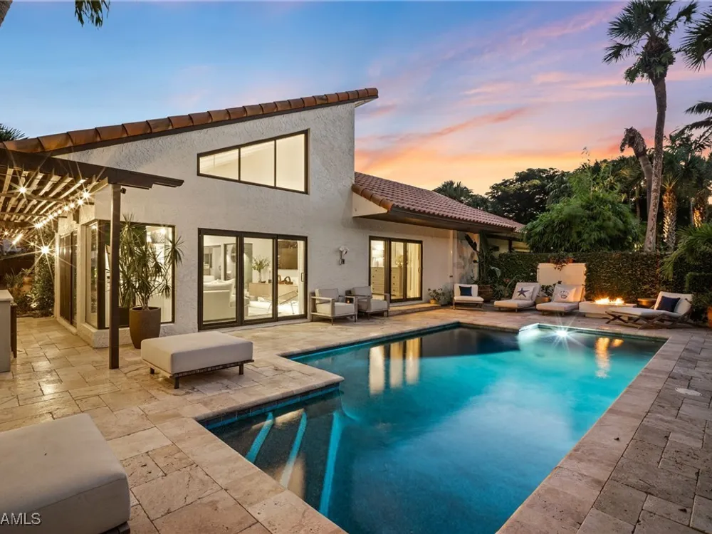 This exceptional, award-winning villa has undergone a complete, million-dollar transformation, seamlessly blending timeless charm with contemporary, luxury. Meticulously redesigned and remodeled by Bennett Design Group of Naples, every inch of this home exudes thoughtful design, quality, comfort, and coastal sophistication—perfectly suited for relaxed living in the heart of Naples. Beyond the private courtyard gate, a tropical oasis awaits. A serene water feature welcomes you into a lushly landscaped courtyard that serves as the heart of the home, complete with a newly installed outdoor kitchen, multiple entertaining areas, and a heated saltwater pool—capturing the true essence of Florida outdoor living. Boasting impeccable craftsmanship, custom finishes, and high-end details throughout, this residence truly stands apart. Inside, the home offers 3 bedrooms plus a den, 2.5 baths, and a spacious two-car garage. Vaulted, beamed ceilings, large windows and sliders, and an open layout welcome in the natural light. A unique interior atrium with a new fountain and a cozy fireplace adds a distinctive architectural touch. An expansive new kitchen opens to the casual den with multiple rooms having access to the courtyard. The home features all-new systems for peace of mind and investment confidence: new HVAC systems, a new water heater, new Halo water filtration system, new plumbing and piping, a new pool pump and heater, impact windows, sliders and doors and new automatic window treatments for modern convenience. Located in the highly desirable neighborhood of Tierra Mar within Pelican Bay, this home offers an unmatched lifestyle. You’re just a short walk to Artis–Naples, Waterside Shops, and pristine beach access close-by. Pelican Bay residents enjoy exclusive amenities, including private beachfront restaurants, beach services, tennis, fitness center, new pickleball courts, sailing, kayaking, canoes, beach trams, spa and wellness services, and a vibrant community center. Ideally located in X-500 flood zone with low HOA fees, this home is offered turnkey, with designer furnishings and accessories. This one-of-a-kind, move-in-ready villa presents a rare opportunity to enjoy luxury coastal living at its finest.