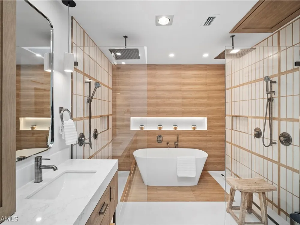 - Wet Bar, Breakfast Bar, Bedroom on Main Level, Bathtub, Dual Sinks, Fireplace, Kitchen Island, Living/Dining Room, Multiple Shower Heads, Main Level Primary, Separate Shower, Cable TV, Vaulted Ceiling(s), Bar, Walk-In Closet(s), Wired for Sound, Window Treatments, Atrium, High Speed Internet, Smart Home