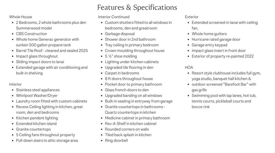 Impeccably maintained Summerwood model offering over 2,000 square feet of refined living space, featuring an extended lanai with serene lake and preserve views. This residence is enhanced by a thoughtful collection of upgrades, including impact-resistant glass and a whole-home generator for peace of mind. The extended garage provides ideal space for a workshop or additional storage. Located within the highly sought-after Lakes at Waterway Village, residents enjoy exceptional resort-style amenities, while the HOA conveniently includes cable, internet, and individual yard care.