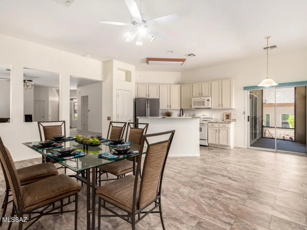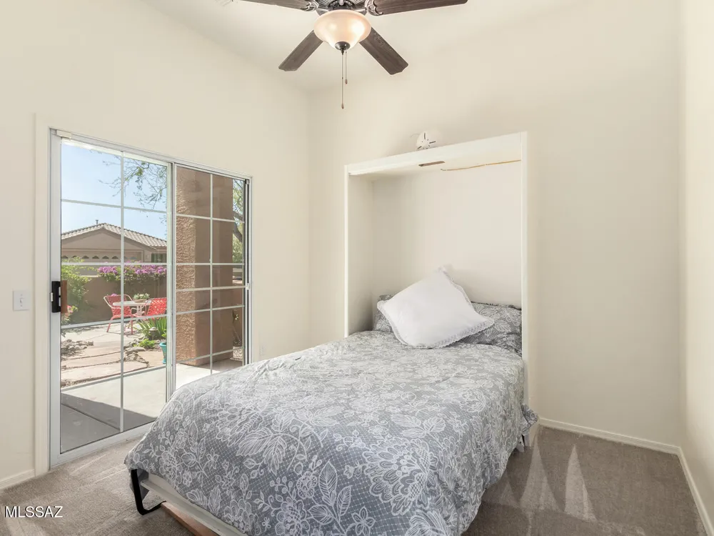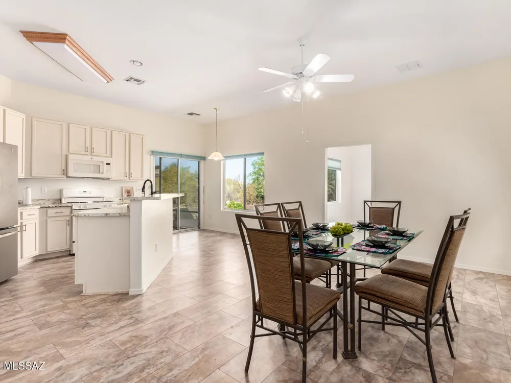 Front courtyard with views of the Catalina Mountains. Freshly painted with new carpet, this expanded Aurora model offers 1,705 sq. ft. The kitchen includes a gas stove, island with bar seating, pull-out cabinetry, pantry, eat in area and all appliances included. Primary suite has two walk-in closets, bathroom with double vanities plus a relaxing tub/shower combination while the versatile bonus room provides space for hobbies or an office. 2nd bedroom with Murphy bed Garage includes a utility sink built-in cabinetry for extra storage and outside you'll enjoy a screened-in patio and fully fenced backyard overlooking a desert wash. Located down the street from the clubhouse with golf, tennis, pickleball, pool, restaurant, social activities and much more! Close to hiking and biking trails.