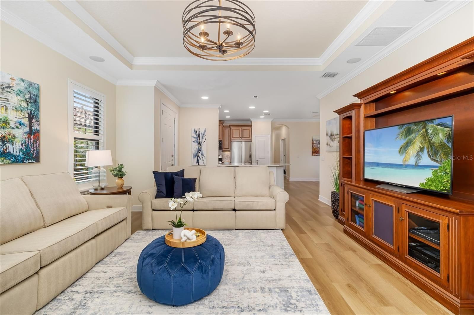 Pride of ownership defines this three-bedroom, two-bath Arezzo model residence in the desirable Esplanade Golf and Country Club. Impeccably maintained and extensively upgraded, this home reflects thoughtful design focused on comfort and quality. Set on a private homesite with a front water view, the property features an expanded lanai offering 375 square feet of outdoor living. The space includes new panoramic screening, remote-controlled storm screens, built-in dimmable Nebula lighting, and designer pavers for an elegant finish. The exterior has been freshly repainted and fitted with new impact-resistant windows, adding durability and peace of mind. Interior enhancements include a new HVAC system, whole-house water filtration, and luxury vinyl plank flooring in a neutral tone. The kitchen showcases new one-level quartz countertops, an on-trend sink and backsplash, and new refrigerator and dishwasher. Both baths have been updated with quartz countertops, new sinks, and lighting fixtures. The primary shower features ceiling-height tile and new fixtures for a clean, contemporary aesthetic. Additional features include Closet Tec custom systems, new washer and dryer, and plantation shutters throughout. This home has been thoughtfully prepared for its next owner. Esplanade offers residents exceptional resort-style amenities, including two large pools, the Bahama Bar, the Amenity Center, the Wellness Center, and the Clubhouse with restaurant and the Barrel House Bistro bar. Recreational opportunities include pickleball, tennis, and pay-to-play golf. A variety of clubs and resident-organized groups enhance the community’s lifestyle. Located just 40 minutes from Sarasota’s cultural attractions, fine dining, and the beaches of Siesta Key, Anna Maria Island, and Armands Circle, this residence provides an ideal blend of luxury and convenience. Lakewood Ranch continues to be recognized as the nation’s top-selling multigenerational community. Come and enjoy!