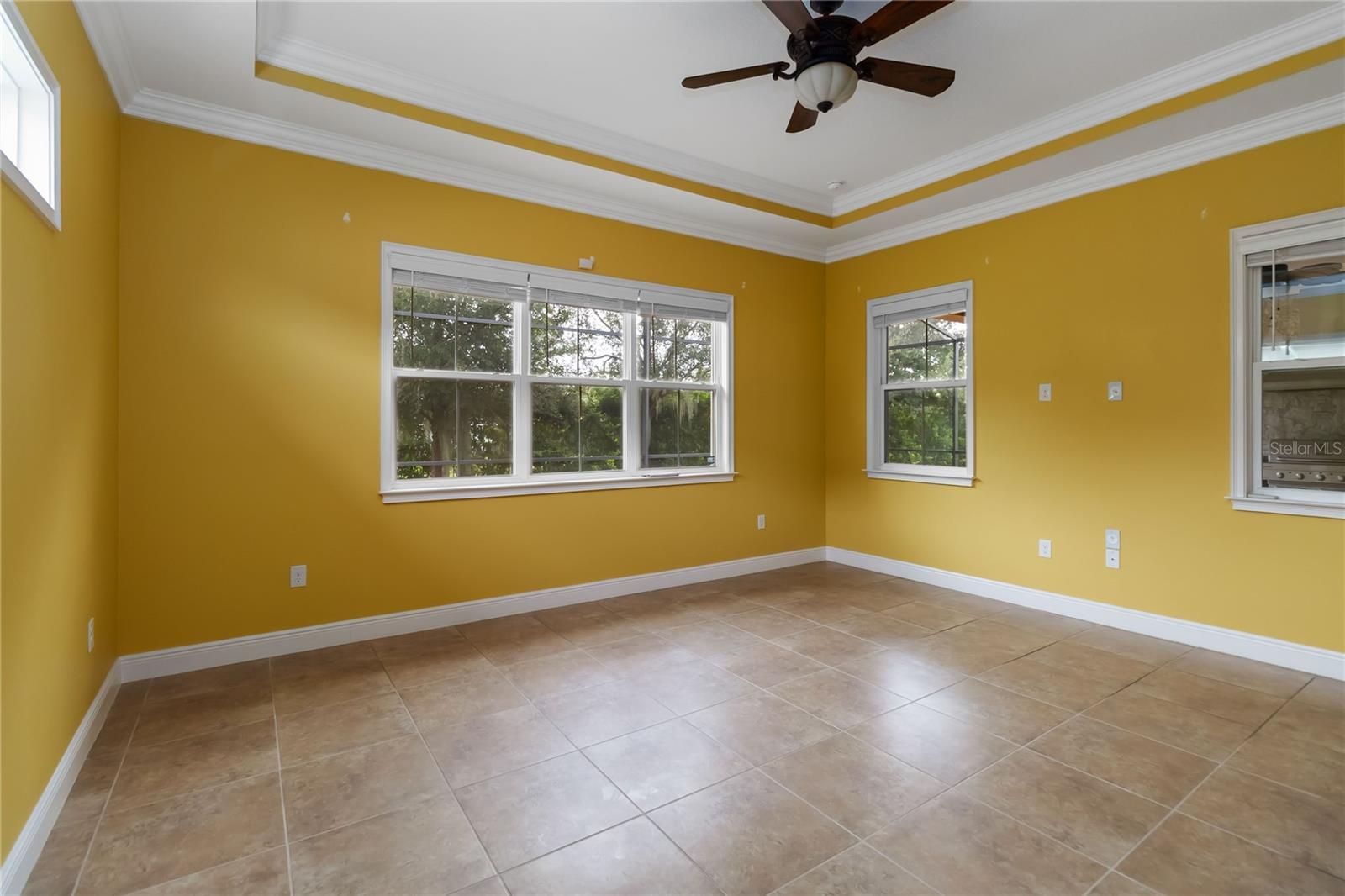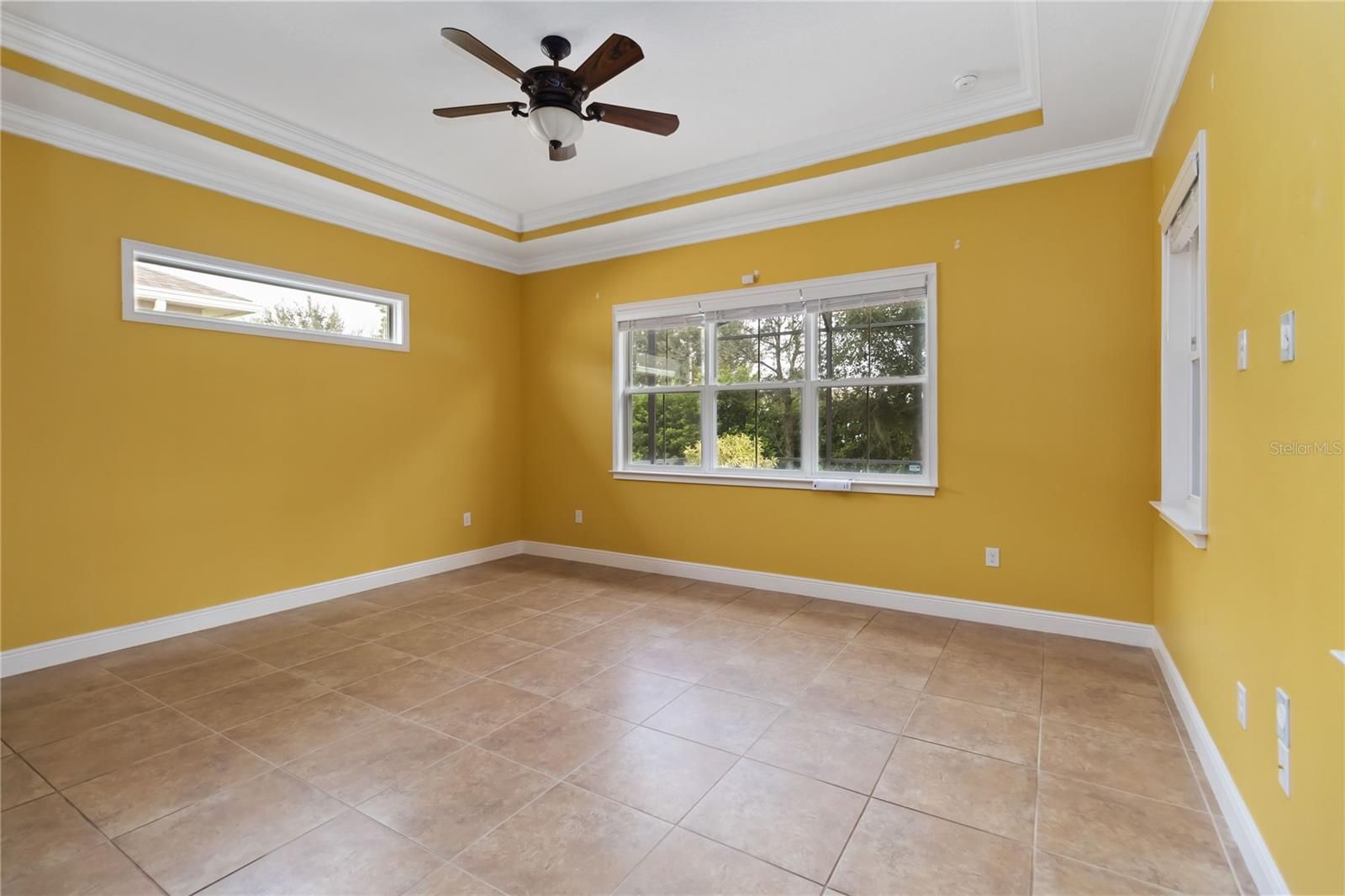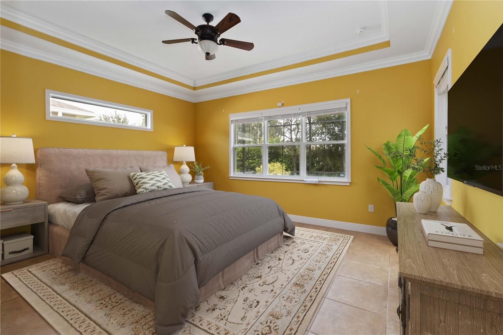 - Ceiling Fan(s), Central Vacuum, Crown Molding, High Ceilings, Living/Dining Room, Open Floorplan, Main Level Primary, Split Bedrooms, Thermostat, Tray Ceiling(s), Walk-In Closet(s), Window Treatments