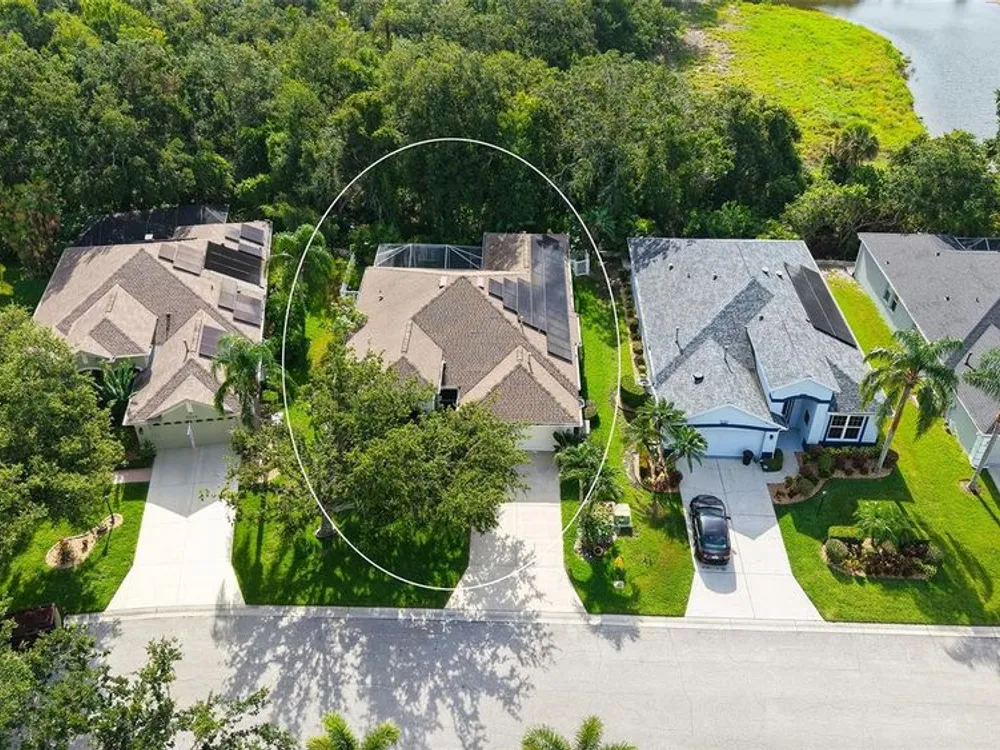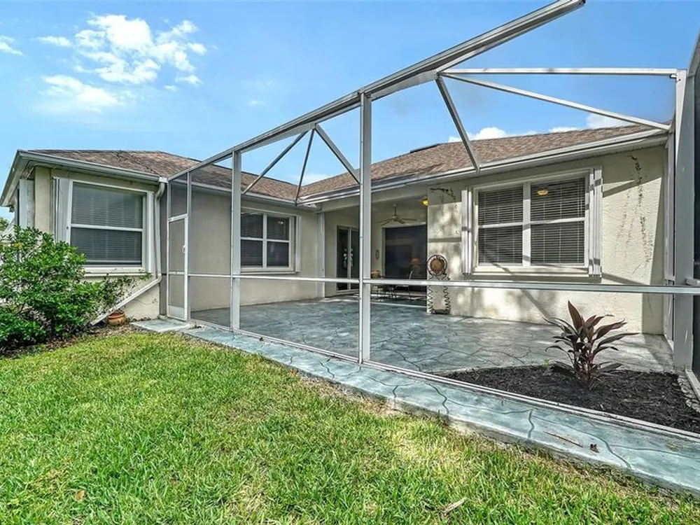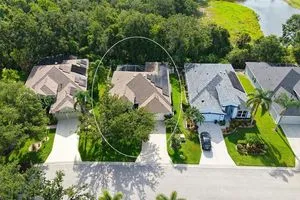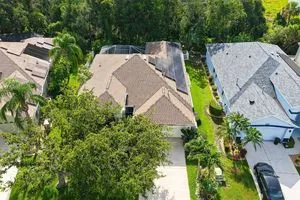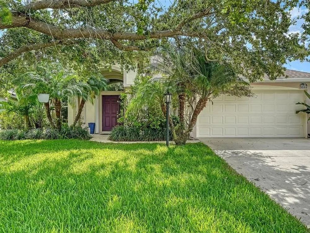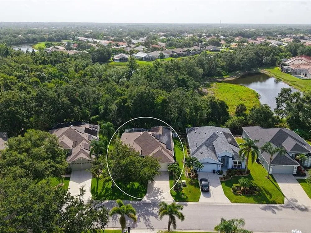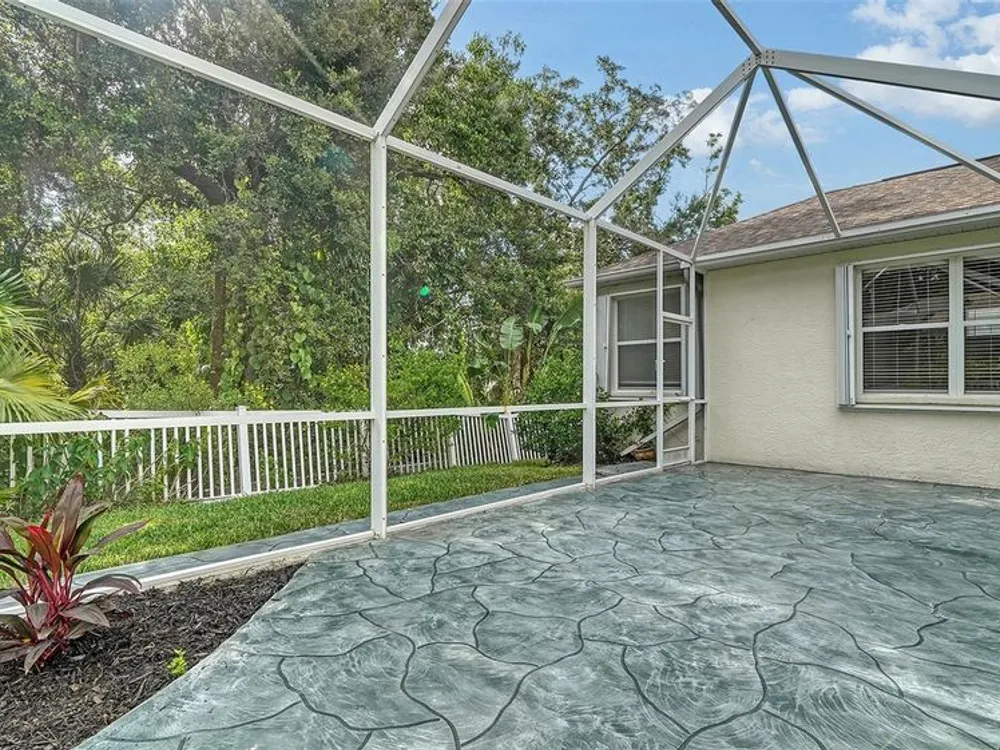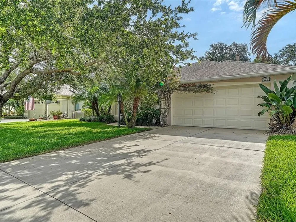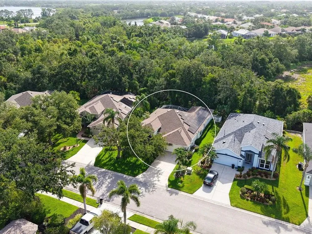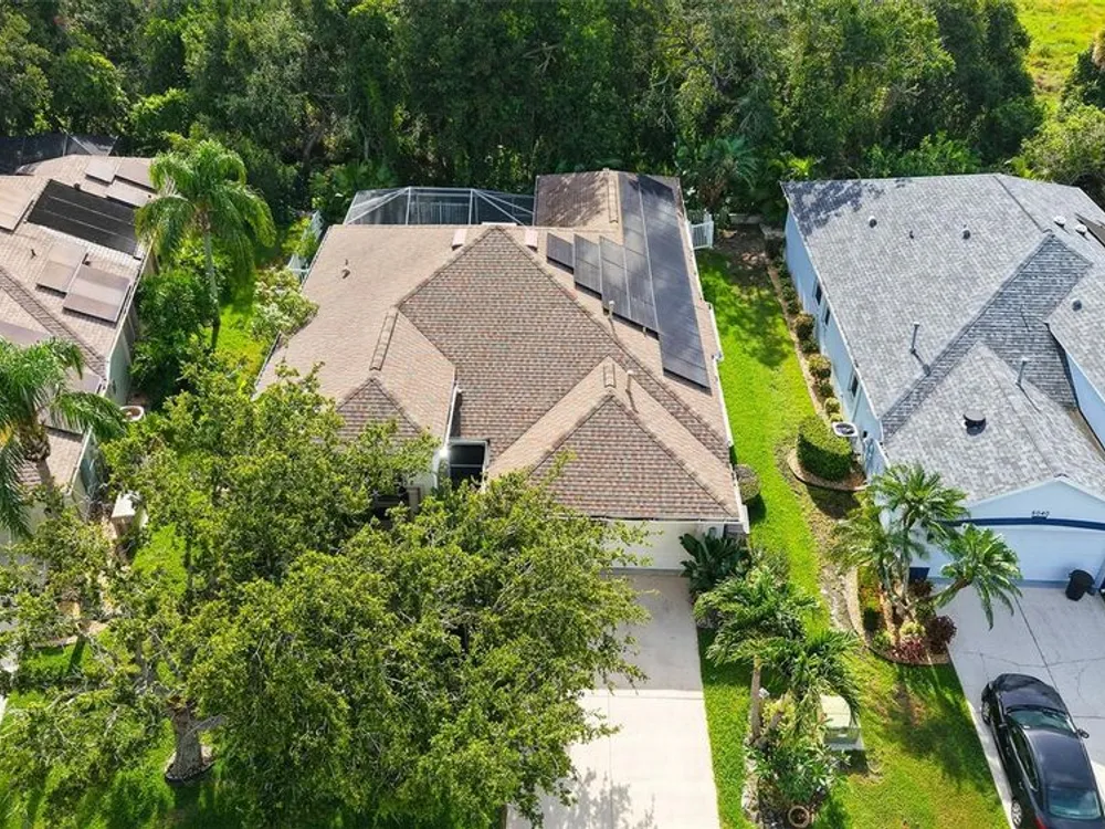 Welcome to 5044 Creekside Trail, in the desirable Carlyle community of Palm Aire. This beautifully updated three-bedroom plus den home on a private preserve lot with a tranquil creek running just beyond the backyard, offering serenity and privacy. Enter to discover an open and spacious floor plan filled with natural light and several updates. A newer roof (2020), HVAC system (2020), and energy-efficient solar panels (2020) keep monthly electric bills averaging just $30 a month. New carpets in both guest bedrooms (June 2025) and fresh interior painting—including walls, ceilings and baseboards (June 2025)—give the home a crisp, modern feel. Luxury laminate flooring flows throughout the main living areas. The kitchen features warm wood cabinetry, newer stainless steel appliances, and a casual dining nook, all open to the family room with sliding glass doors leading to an extended lanai—ideal for relaxing or entertaining family and guests. The primary suite, accessed through double doors, offers a spacious retreat with a walk-in closet and en-suite bath featuring dual sinks, a soaking tub and a separate walk-in shower. Enjoy working from home in the generous private den, thoughtfully enclosed by French doors for added privacy and a quiet, focused workspace. Other features include accordion rollout hurricane shutters on all exterior doors and windows, a fenced-in backyard, tray ceilings, lush tropical landscaping, including tall palms and mature vegetation, to complete the Florida lifestyle you've been dreaming of. Residents at Carlyle at The Villages of Palm-Aire enjoy low HOA fees, less than $90 per month, and no CDDs. Great amenities such as pickleball, tennis courts, a community pool, a playground, and option to join the Palm-Aire Country Club. Great location near UTC Mall, shopping, restaurants, Sarasota International Airport, and downtown Sarasota and the sugary beaches.