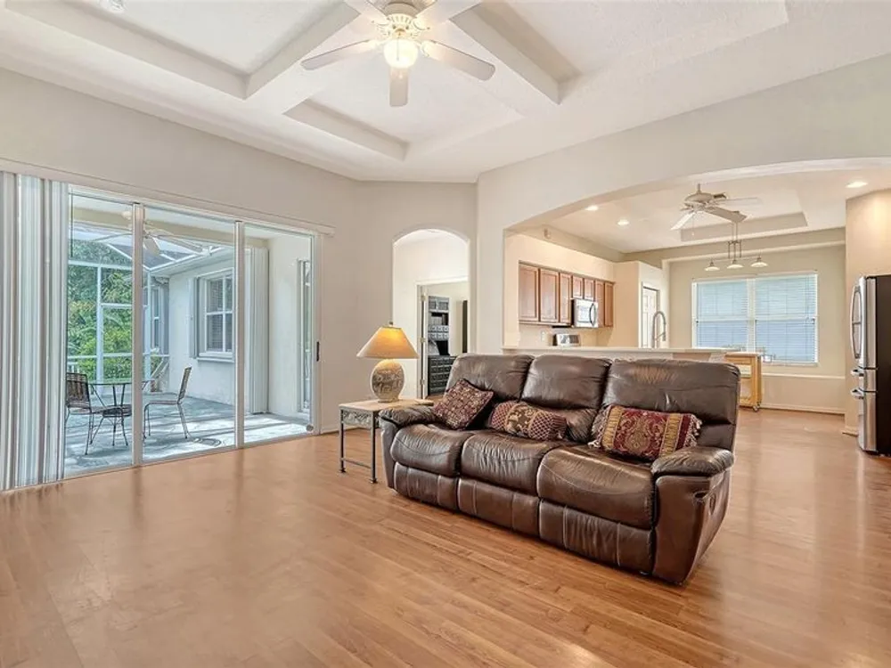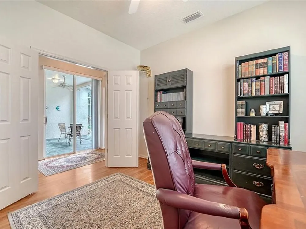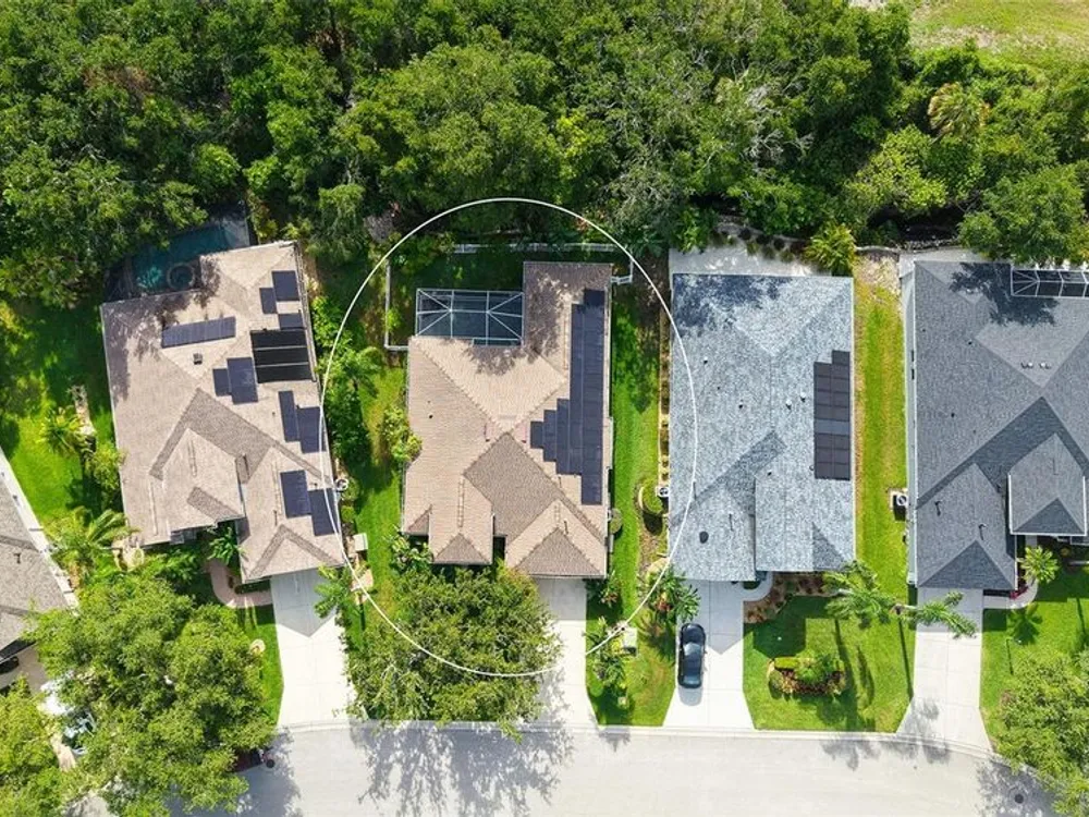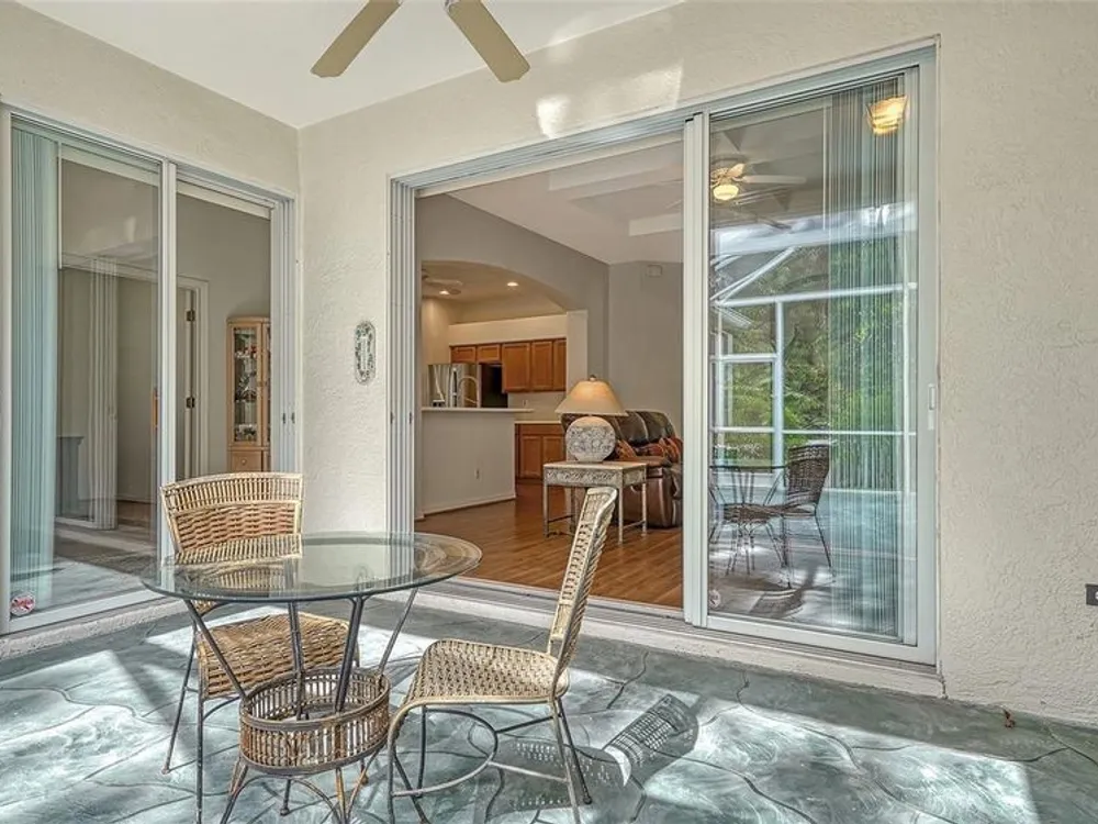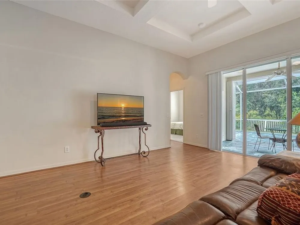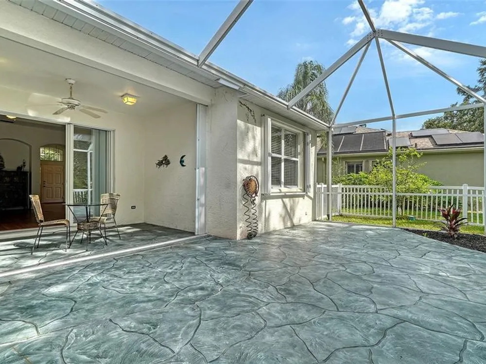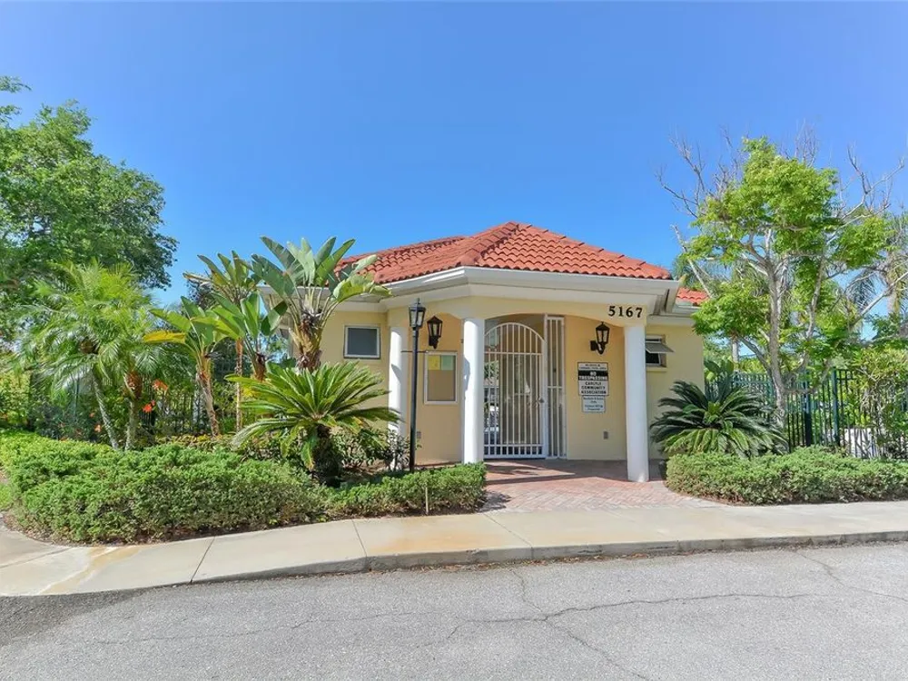 Welcome to 5044 Creekside Trail, in the desirable Carlyle community of Palm Aire. This beautifully updated three-bedroom plus den home on a private preserve lot with a tranquil creek running just beyond the backyard, offering serenity and privacy. Enter to discover an open and spacious floor plan filled with natural light and several updates. A newer roof (2020), HVAC system (2020), and energy-efficient solar panels (2020) keep monthly electric bills averaging just $30 a month. New carpets in both guest bedrooms (June 2025) and fresh interior painting—including walls, ceilings and baseboards (June 2025)—give the home a crisp, modern feel. Luxury laminate flooring flows throughout the main living areas. The kitchen features warm wood cabinetry, newer stainless steel appliances, and a casual dining nook, all open to the family room with sliding glass doors leading to an extended lanai—ideal for relaxing or entertaining family and guests. The primary suite, accessed through double doors, offers a spacious retreat with a walk-in closet and en-suite bath featuring dual sinks, a soaking tub and a separate walk-in shower. Enjoy working from home in the generous private den, thoughtfully enclosed by French doors for added privacy and a quiet, focused workspace. Other features include accordion rollout hurricane shutters on all exterior doors and windows, a fenced-in backyard, tray ceilings, lush tropical landscaping, including tall palms and mature vegetation, to complete the Florida lifestyle you've been dreaming of. Residents at Carlyle at The Villages of Palm-Aire enjoy low HOA fees, less than $90 per month, and no CDDs. Great amenities such as pickleball, tennis courts, a community pool, a playground, and option to join the Palm-Aire Country Club. Great location near UTC Mall, shopping, restaurants, Sarasota International Airport, and downtown Sarasota and the sugary beaches.