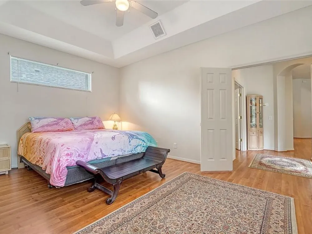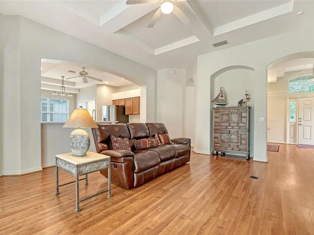 - Ceiling Fan(s), Eat-in Kitchen, Kitchen/Family Room Combo, Open Floorplan, Main Level Primary, Solid Surface Counters, Solid-Wood Cabinets, Split Bedrooms, Thermostat, Tray Ceiling(s), Walk-In Closet(s), Window Treatments