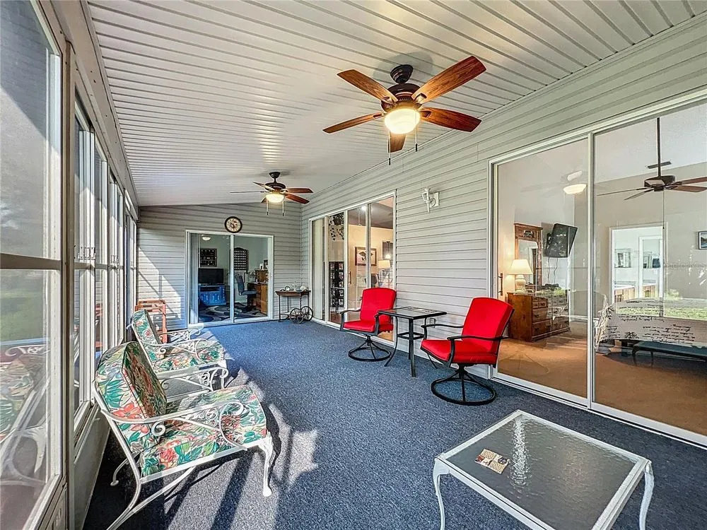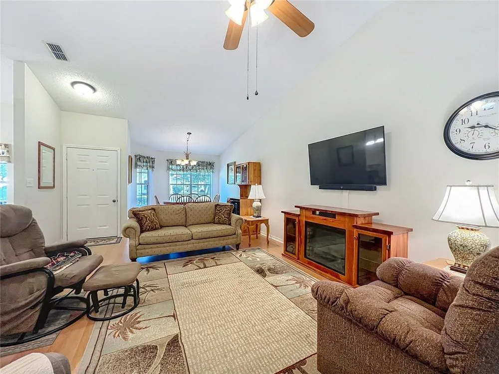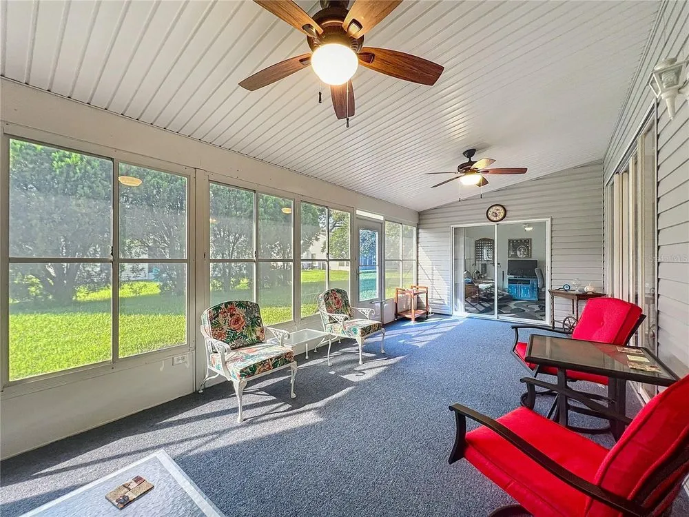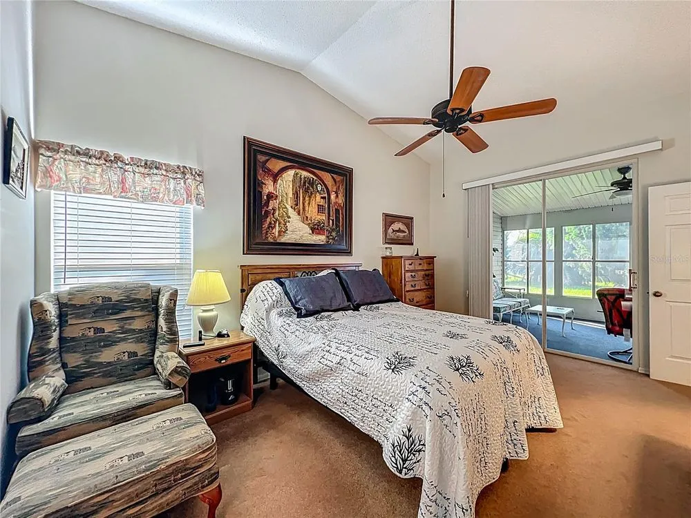 Welcome to 5046 Desoto Way! This split floor plan home features 2 bedroom, 2 baths, plus a flex room, opening up a versatile space to customize for your needs. The inviting eat-in kitchen is perfect for casual meals and easy entertaining. Double pull-outs in cabinets make organization and access a breeze. The living room and dining areas offer comfortable space for entertaining or relaxation and easily transitions to a spacious, enclosed lanai through a convenient sliding door. The spacious owners suite features ample room for larger furniture, while the en-suite bath boasts double sinks, a step-in shower and a large walk-in closet. Sliders open up to the enclosed lanai. When overnight visitors arrive, there’s a roomy guest bedroom. Life at the Plantation at Leesburg offers the best of Florida’s indoor/outdoor living. Relax and enjoy the breeze on your screened-in front porch or in the comfort and privacy of your enclosed lanai. Both spaces are ideal for enjoying your morning coffee, sipping your evening drink and enjoying time with your new Plantation friends! Roof 2014. HVAC 9 years old. Water heater and solar attic fan 3 years old. The Plantation at Leesburg is an active 55+ community. Enjoy 3 clubhouses with heated pools and spas, 2 18-hole golf courses, a driving range, 2 fitness centers, pickleball and tennis courts, bocce, shuffleboard and many other activities and clubs.