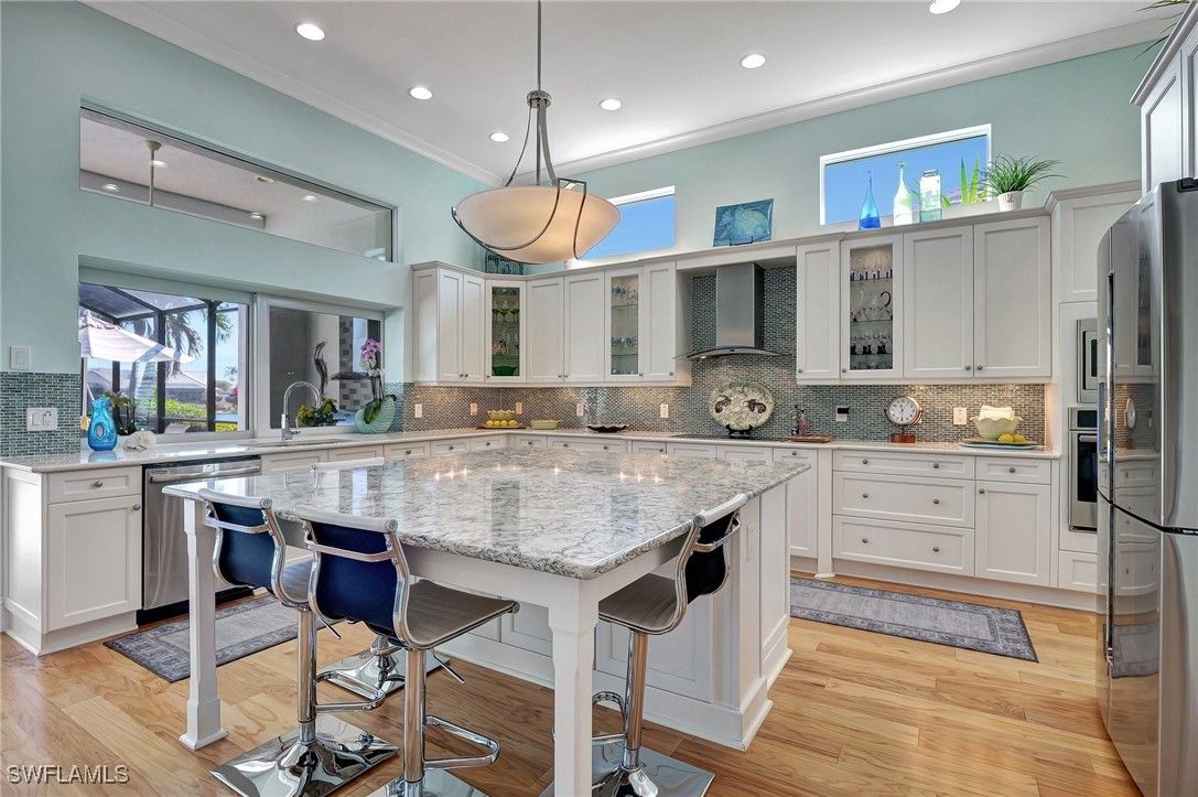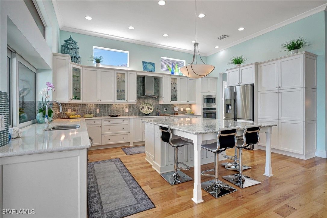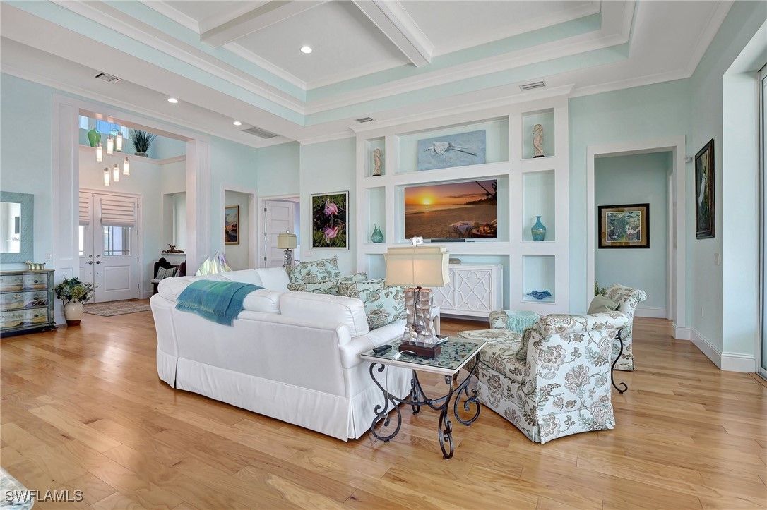 Rarely available, this meticulously maintained Jasmine Grande residence captures expansive private water views from nearly every room. Offering two spacious bedrooms, an office/den, a versatile flex room with wet bar, and 2.5 baths, the home blends everyday comfort with refined living. The impressive great room showcases 14-foot double tray ceilings, crown molding, and abundant natural light—an ideal backdrop for stylish entertaining. Seamlessly connected, the gourmet kitchen is a chef’s delight, featuring stainless steel appliances, granite countertops, and an oversized island with seating for four. A true showpiece, the Eastern-facing screened lanai is designed for relaxation and entertaining alike. Enjoy the sparkling pool, fully equipped outdoor kitchen with grill, and multiple seating areas—all while taking in tranquil water views. Set at the end of a quiet cul-de-sac with water wrapping two sides, the property offers unmatched privacy. Notable upgrades include 10-foot pocketing impact sliders, hurricane screens on the lanai, rich wood and tile flooring, and even an insulated garage door for year-round comfort. Beyond the home, the Isles of Collier Preserve spans 2,400 acres of pristine lakes and nature preserves, offering endless opportunities for recreation. Residents enjoy scenic walking and biking trails, kayaking, paddleboarding, tennis, pickleball, bocce, and a dog park. The community clubhouse features a state-of-the-art fitness center, resort and lap pools, and the inviting Overlook Bar & Grill. Perfectly located just minutes from Old Naples’ shops, dining, and beaches, and moments from the Naples Botanical Garden and acclaimed Naples Pickleball Center, this home offers the ideal blend of luxury, privacy, and vibrant community living.