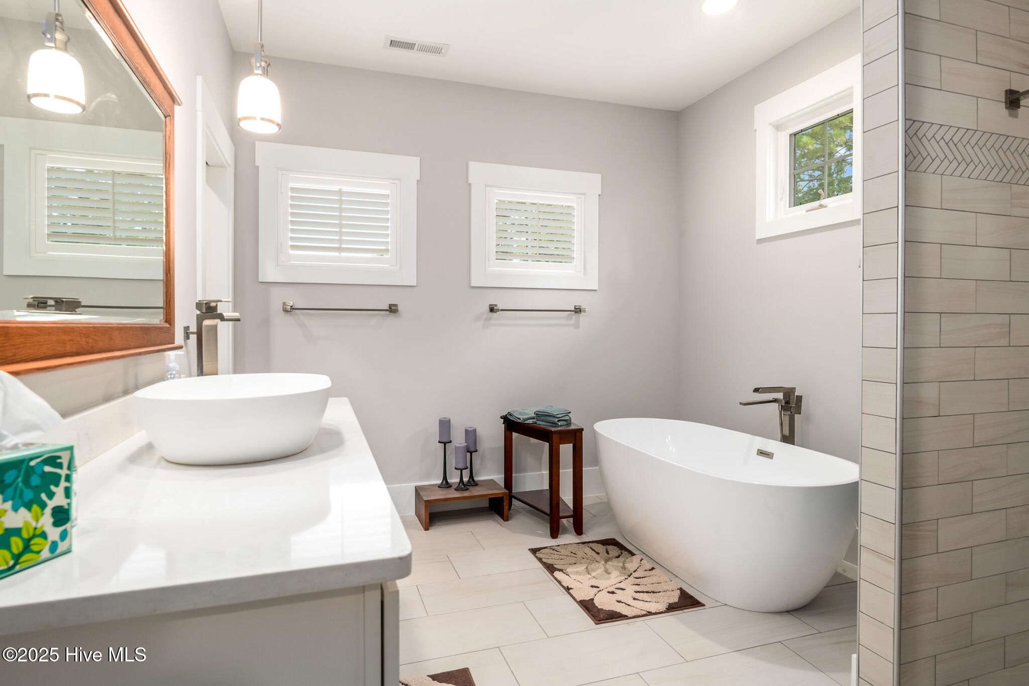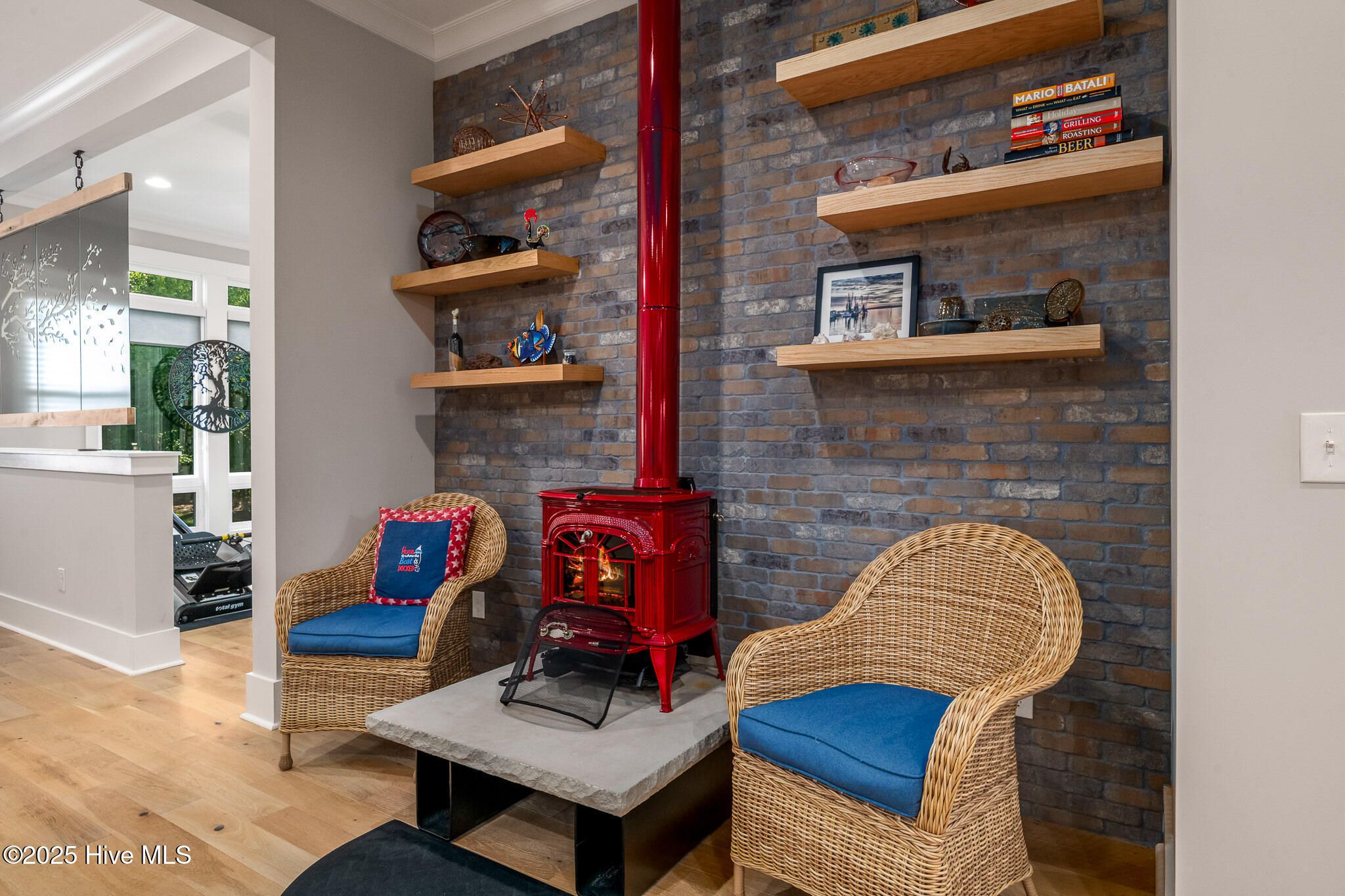 - Master Downstairs, Walk-In Closet(s), High Ceilings, Kitchen Island, Ceiling Fan(s), Pantry, Walk-In Shower, Blinds, Wood Burning Stove, Kitchen/Dining Combo