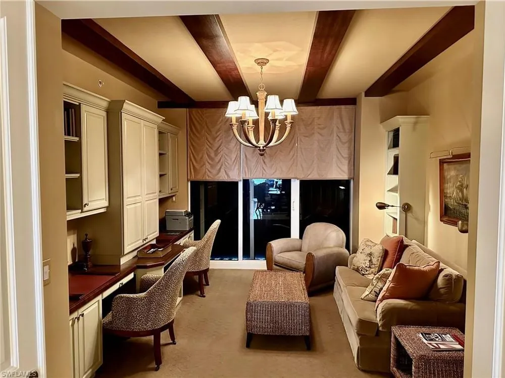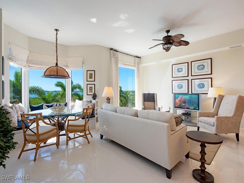 Discover elevated coastal living in this fully furnished 3-bedroom plus den, 3.5-bath residence in La Scala, one of Southwest Florida’s most prestigious high-rise towers. Located on the third floor with a private elevator lobby, this former model home offers over 3,500 square feet of air-conditioned space, blending timeless luxury with thoughtful design. The open-concept layout seamlessly connects the living, dining, and kitchen areas, surrounded by floor-to-ceiling glass that floods the interior with natural light and showcases stunning views of Estero Bay and beyond. Elegant white stone flooring, accented with dark wood in select areas, extends through the main living spaces and primary suite. The kitchen is outfitted with Siematic cabinetry, granite countertops, and stainless appliances—perfect for both daily living and entertaining. Each of the three en-suite bedrooms offers comfort and privacy, while the den provides flexible space for a home office or media room. Multiple lanais, both screened and open, invite quiet mornings and sunset evenings outdoors. High ceilings (9 feet 8 inches) and generous storage throughout add to the home's livability, and two assigned parking spaces and secure private storage is included in the under-building garage. La Scala offers world-class amenities including a grand formal lobby with twin marble staircases, 24-hour staffed front desk, resort-style pool and spa, fitness center, private theater, guest suites, and social rooms. Recent renovations include a new roof, updated stucco, fresh light exterior paint, fully refreshed garage and mechanicals, and all-new landscaping. As part of The Colony at Pelican Landing, residents also enjoy access to The Bay Club with two levels of waterfront dining, a private beach park accessible by boat shuttle, tennis, pickleball, a kayak park, optional Golf membership and a children’s playground