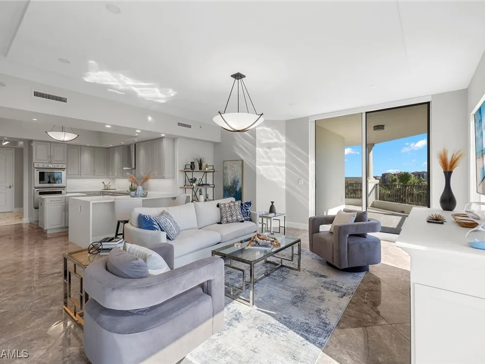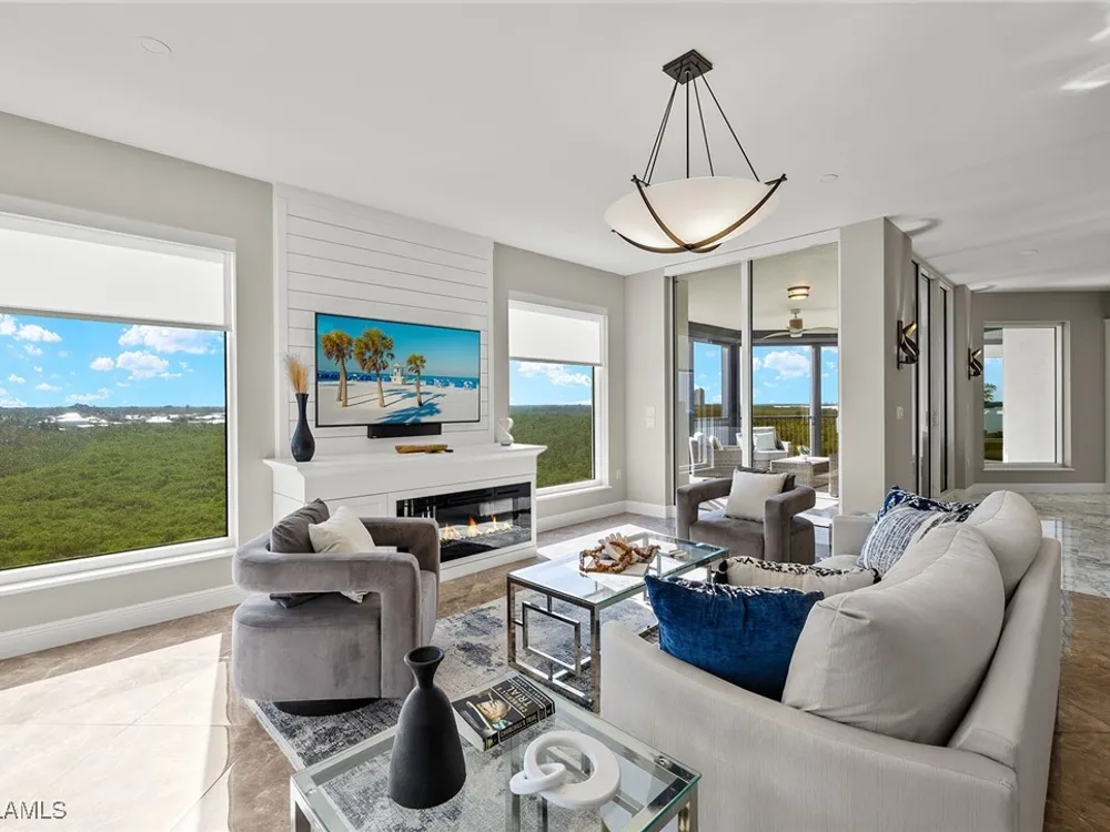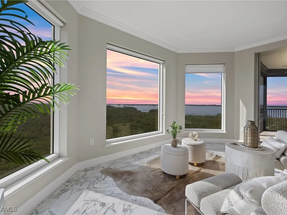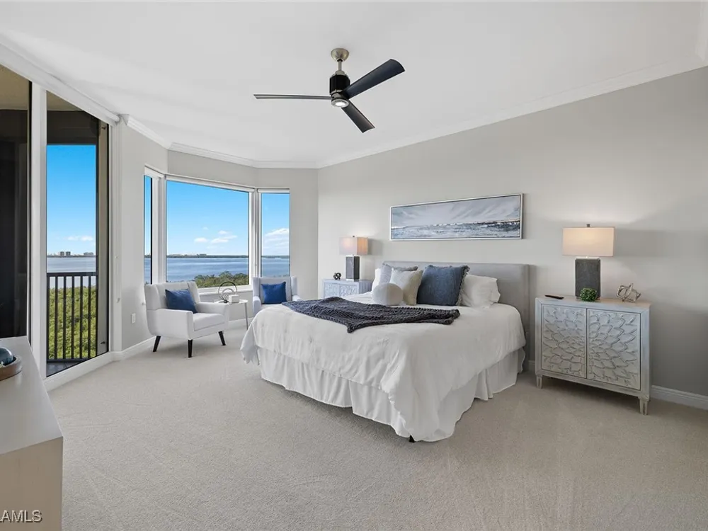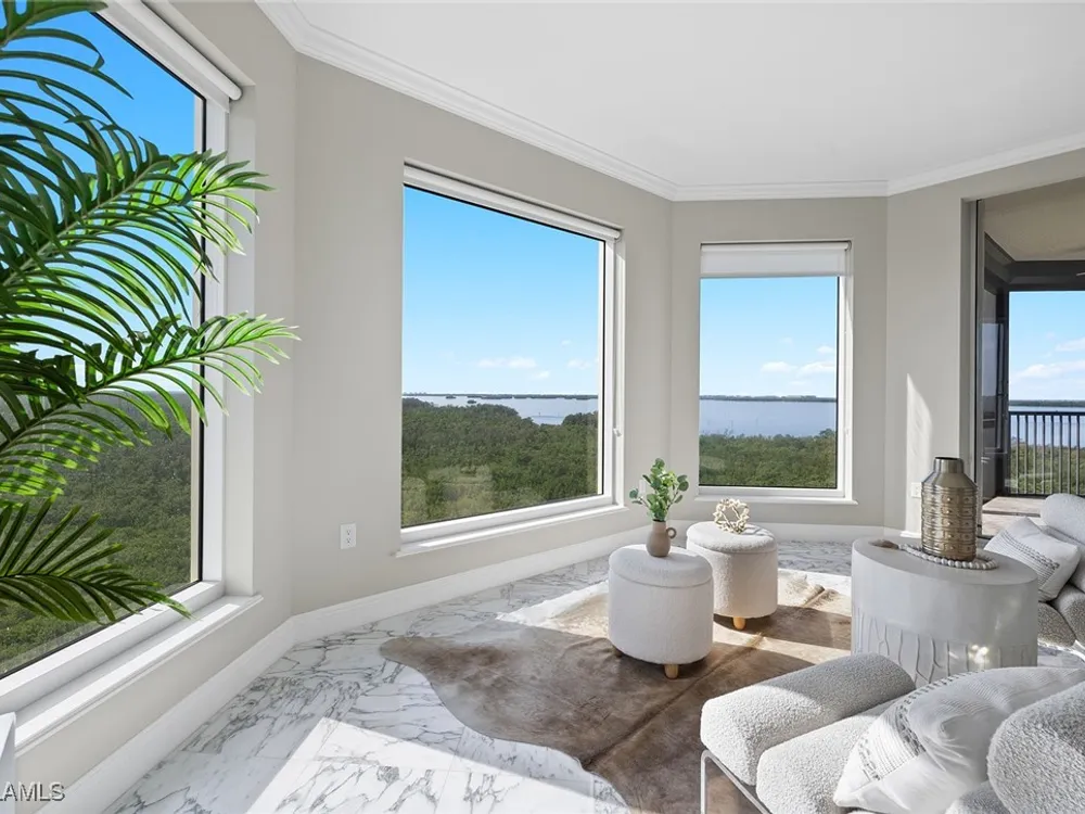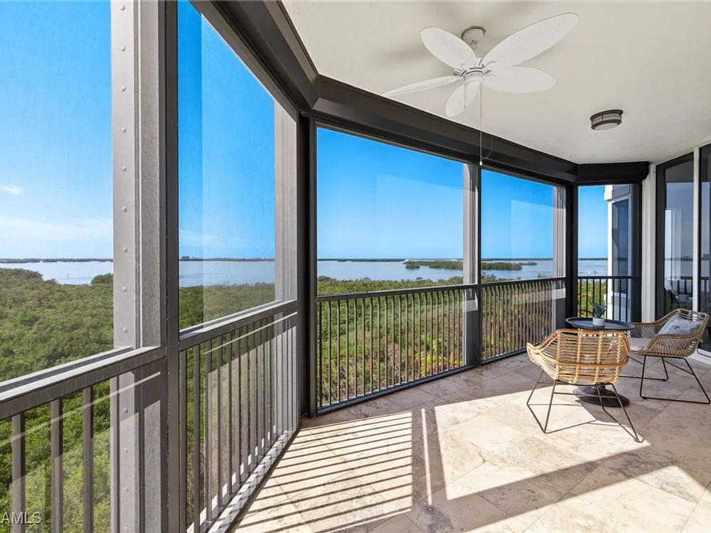 MAJOR PRICE IMPROVEMENT! Ultimate luxury and gorgeous water views for a price under $540 per sq. ft. Live the life you’ve always imagined in this magnificent, fully renovated, luxurious condominium and skip the waiting list to enjoy full golf and club membership privileges at the prestigious Colony Golf & Country Club, just five minutes from your door. New HVAC system just installed and all new appliances - fully renovated end unit. La Scala 501 has 4,068 square feet of internal living space with 4,988 total square feet, with four balconies, two of which are screened lanais with automated storm shutters. This unit sells furnished. Important features include private elevator lobby, four large bedrooms, four full en-suite baths plus a powder room, sleek and ultra-functional newly renovated kitchen, exclusive Hubbardton Forge lighting fixtures, custom walk-in closets, new laundry, new entertainment center with linear fireplace, gorgeous Carrera marble flooring, high 9-foot, 8-inch ceilings, and overall floor-to-ceiling windows which bring in an abundance of light and provide stunning, unobstructed water views. Unit renovations completed in 2022. This condominium has it all and is ready for immediate move-in. The La Scala condominium building, often referred to as the jewel of The Colony high rises for its luxury amenities, ultra generous floor plans, and unobstructed views of Estero Bay and Gulf of Mexico, has undergone approximately $14 million-plus in renovations and upgrades, which include a new roof, new exterior stucco, paint and finishes, all new landscaping, refurbished garages, restoration and upgrade of all security cameras and door entry locations, and complete replacement of all pool, spa, fountain and geothermal equipment. All assessments have been paid in full. In addition, La Scala amenities include features only found in five-star residences, namely 24/7 front desk services, an expansive state-of-the-art fitness center, impressive two-story lobby, luxuriously appointed onsite guest suites for overnight visitors, private pool and spa with outdoor grills and bar area, a movie theater and social rooms for entertaining. Membership to The Bay Club, newly renovated, and hourly ferry access to a private, 34-acre island beach on the Gulf of Mexico, are all yours for you and your family to enjoy.