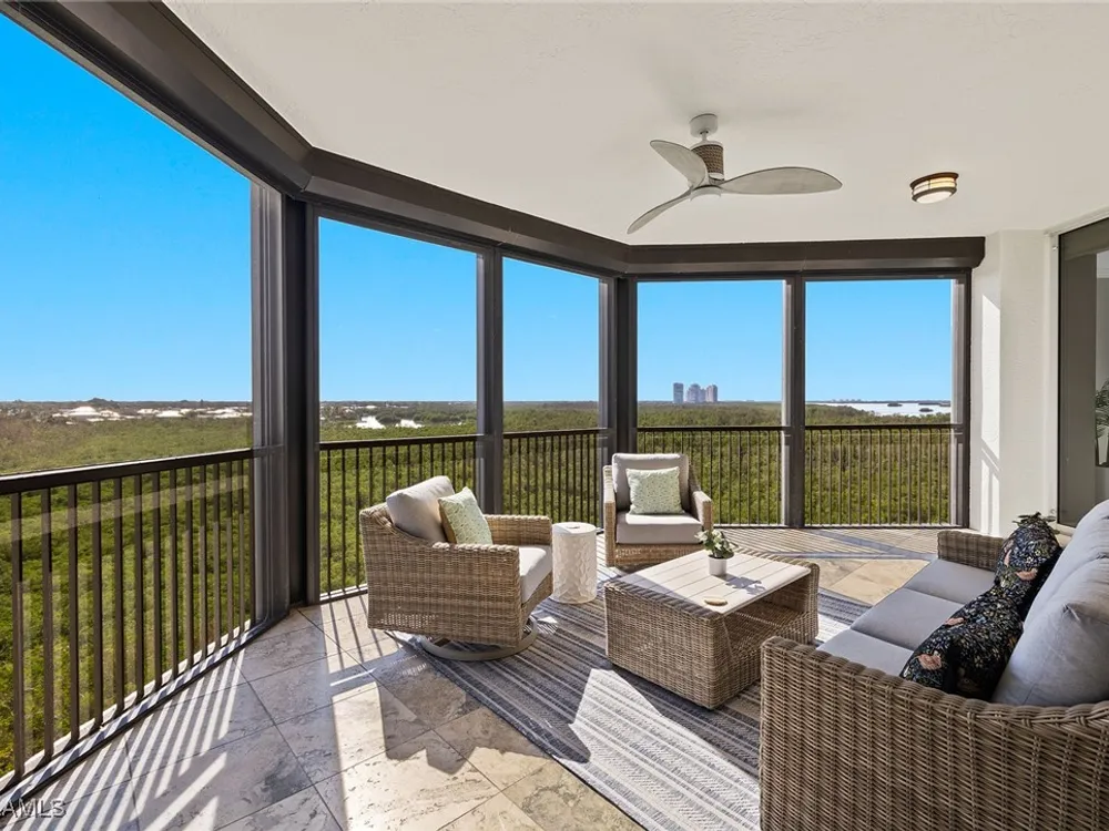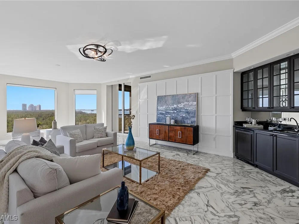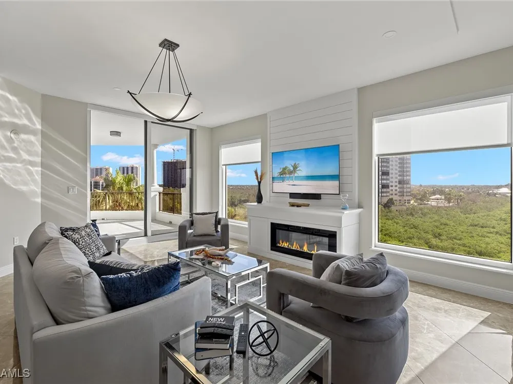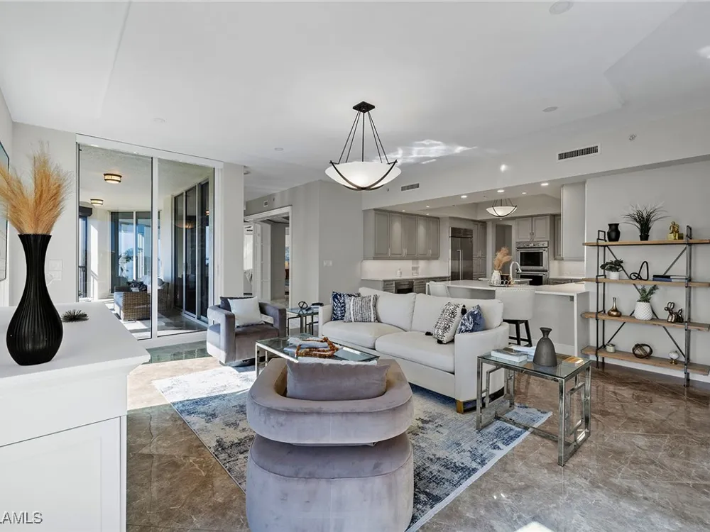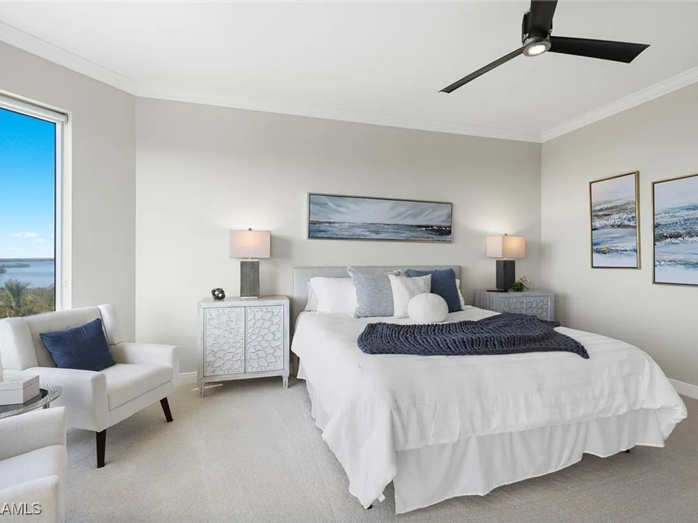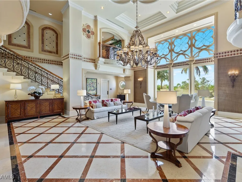 MAJOR PRICE IMPROVEMENT! Ultimate luxury and gorgeous water views for a price under $540 per sq. ft. Live the life you’ve always imagined in this magnificent, fully renovated, luxurious condominium and skip the waiting list to enjoy full golf and club membership privileges at the prestigious Colony Golf & Country Club, just five minutes from your door. New HVAC system just installed and all new appliances - fully renovated end unit. La Scala 501 has 4,068 square feet of internal living space with 4,988 total square feet, with four balconies, two of which are screened lanais with automated storm shutters. This unit sells furnished. Important features include private elevator lobby, four large bedrooms, four full en-suite baths plus a powder room, sleek and ultra-functional newly renovated kitchen, exclusive Hubbardton Forge lighting fixtures, custom walk-in closets, new laundry, new entertainment center with linear fireplace, gorgeous Carrera marble flooring, high 9-foot, 8-inch ceilings, and overall floor-to-ceiling windows which bring in an abundance of light and provide stunning, unobstructed water views. Unit renovations completed in 2022. This condominium has it all and is ready for immediate move-in. The La Scala condominium building, often referred to as the jewel of The Colony high rises for its luxury amenities, ultra generous floor plans, and unobstructed views of Estero Bay and Gulf of Mexico, has undergone approximately $14 million-plus in renovations and upgrades, which include a new roof, new exterior stucco, paint and finishes, all new landscaping, refurbished garages, restoration and upgrade of all security cameras and door entry locations, and complete replacement of all pool, spa, fountain and geothermal equipment. All assessments have been paid in full. In addition, La Scala amenities include features only found in five-star residences, namely 24/7 front desk services, an expansive state-of-the-art fitness center, impressive two-story lobby, luxuriously appointed onsite guest suites for overnight visitors, private pool and spa with outdoor grills and bar area, a movie theater and social rooms for entertaining. Membership to The Bay Club, newly renovated, and hourly ferry access to a private, 34-acre island beach on the Gulf of Mexico, are all yours for you and your family to enjoy.