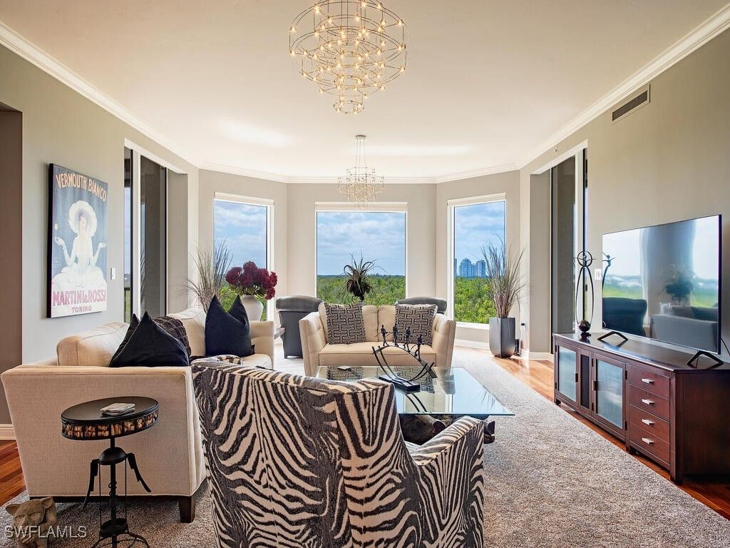 Discover luxurious living in this beautifully renovated unit offering expansive panoramic Bay Views. Recent unit renovations include the removal of walls between the kitchen, dining, and living rooms, creating a spacious Great Room that enhances the already generous 4,060 square feet of interior space. Reconfiguration also pulled Bay Views to multiple rooms. With the inclusion of multiple open and screened lanais, the living area extends to over 5,000 square feet. Key updates include new porcelain tile in the foyer and dining room omplementing the existing Brazilian Cherry wood floors. The kitchen shines with new granite countertops, sink, faucets, refrigerator, oven, and microwave. The laundry area has been reconfigured to accommodate a full-size washer and dryer. The master closet boasts a custom build-out, and most light fixtures have been updated to modern standards. One of the screened lanais features new porcelain tile, adding to the unit's elegance. Most furnishings are newer and negotiable. This unit offers three ensuite bedrooms, with the Den/Office easily convertible to a fourth bedroom complete with a full bath and closet. The rear lanai, larger than other similar units, features stone balustrades, providing an elegant extended outdoor space. La Scala comprises 64 residences with two levels of exceptional amenities, including grand formal spaces, a billiards room, theater, and library. Residents enjoy access to a fitness room with sauna, as well as a serene pool and spa reminiscent of a European grand hotel. The building ensures peace of mind with a 24/7 staffed front desk.Recent building renovations and updates include new roof, new exterior stucco, new light color building repaint, completely refreshed garage and mechanicals and entirely new landscaping. Community amenities include the fully updated Bay Club with both formal and informal dining across two levels, a 34-acre island beach park, kayak and canoe park and optional golf at the Colony Golf Club.