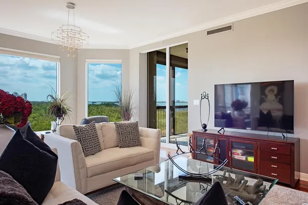 Discover luxurious living in this beautifully renovated unit offering expansive panoramic Bay Views. Recent renovations include the removal of walls between the kitchen, dining, and living rooms, creating a spacious Great Room that enhances the already generous 4,060 square feet of interior space. Reconfiguration also pulled Bay Views to multiple rooms. With the inclusion of multiple open and screened lanais, the living area extends to over 5,000 square feet. Key updates include new porcelain tile in the foyer and dining room, complementing the existing Brazilian Cherry wood floors. The kitchen shines with new granite countertops, sink, faucets, refrigerator, oven, and microwave. The laundry area has been reconfigured to accommodate a full-size washer and dryer. The master closet boasts a custom build-out, and most light fixtures have been updated to modern standards. One of the screened lanais features new porcelain tile, adding to the unit's elegance. Most furnishings are newer and negotiable. This unit offers three ensuite bedrooms, with the Den/Office easily convertible to a fourth bedroom complete with a full bath and closet. The rear lanai, larger than other similar units, features stone balustrades, providing an elegant extended outdoor space. La Scala comprises 64 residences with two levels of exceptional amenities, including grand formal spaces, a billiards room, theater, and library. Residents enjoy access to a fitness room with sauna, as well as a serene pool and spa reminiscent of a European grand hotel. The building ensures peace of mind with a 24/7 staffed front desk. Community amenities include the fully updated Bay Club with both formal and informal dining across two levels, a 34-acre island beach park, kayak and canoe park and optional golf at the Colony Golf Club.