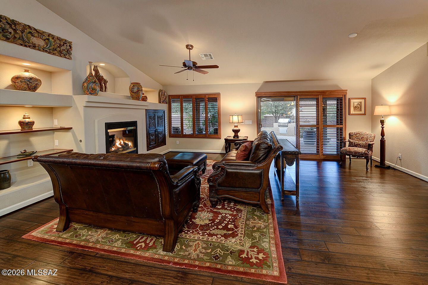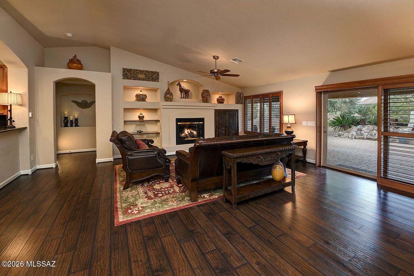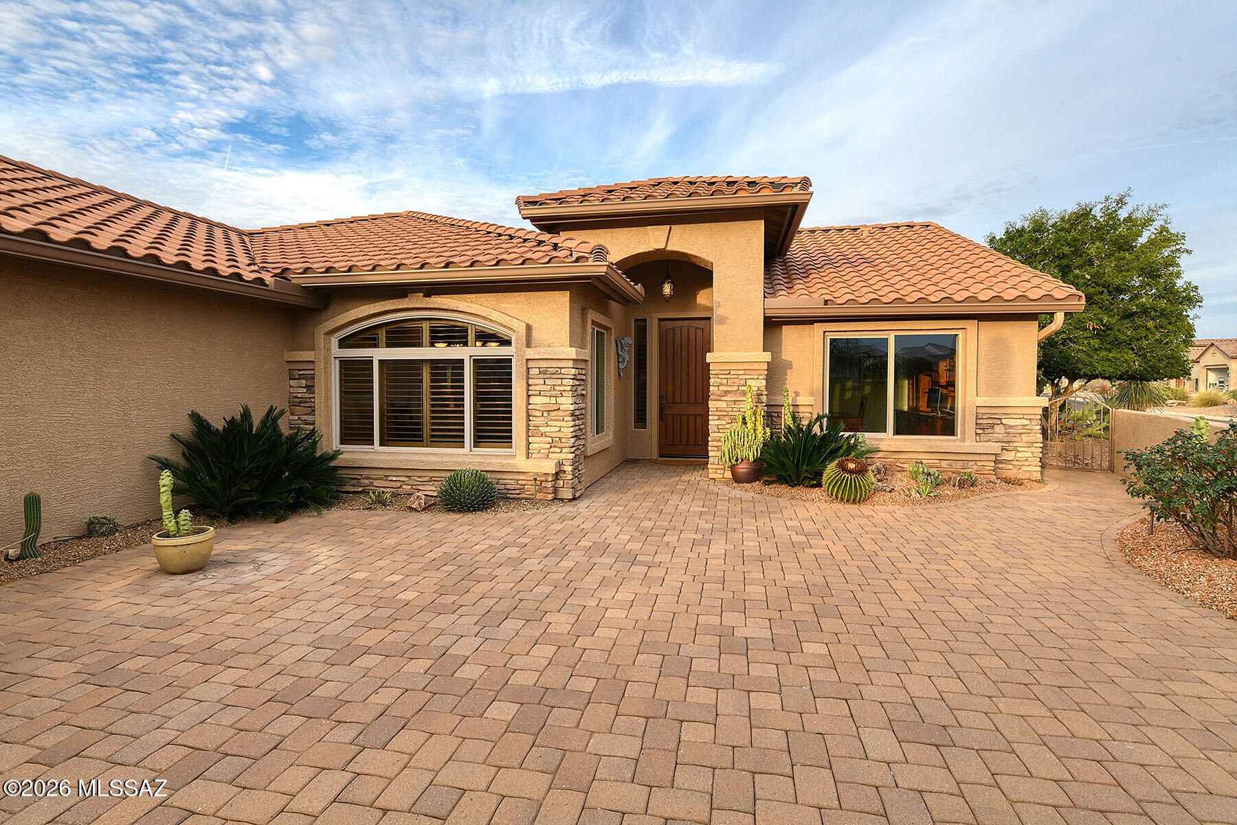 From the moment you arrive, this stunning residence makes an unforgettable first impression. A classic red-tiled roof, majestic Saguaro cacti, and graceful palm trees frame an arched entry that draws you into an expansive paved front courtyard -- a truly grand arrival experience. Whether you're sipping morning coffee in the sunshine or hosting cocktails under the stars, this remarkable outdoor space sets the tone for the elegance that awaits inside. Step through the front door and discover lush, luxurious finishes at every turn. Rich wood-look flooring flows throughout the home, anchored by a warm, glowing fireplace that invites you to linger. The elegant kitchen dazzles with high-end appointments and beautiful details that will delight even the most discerning buyer.