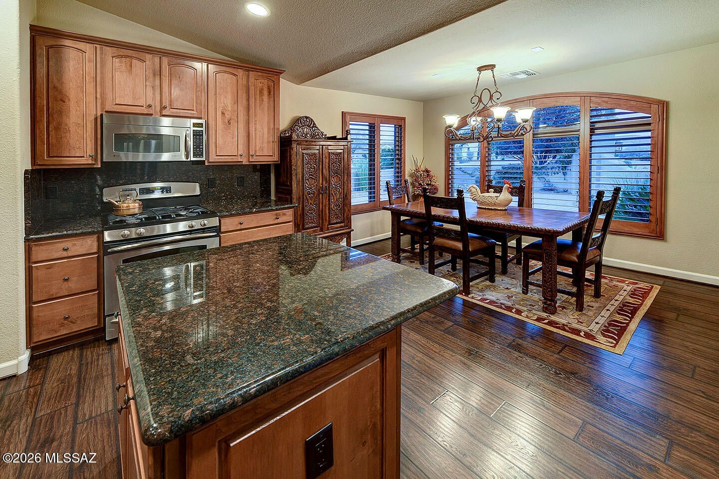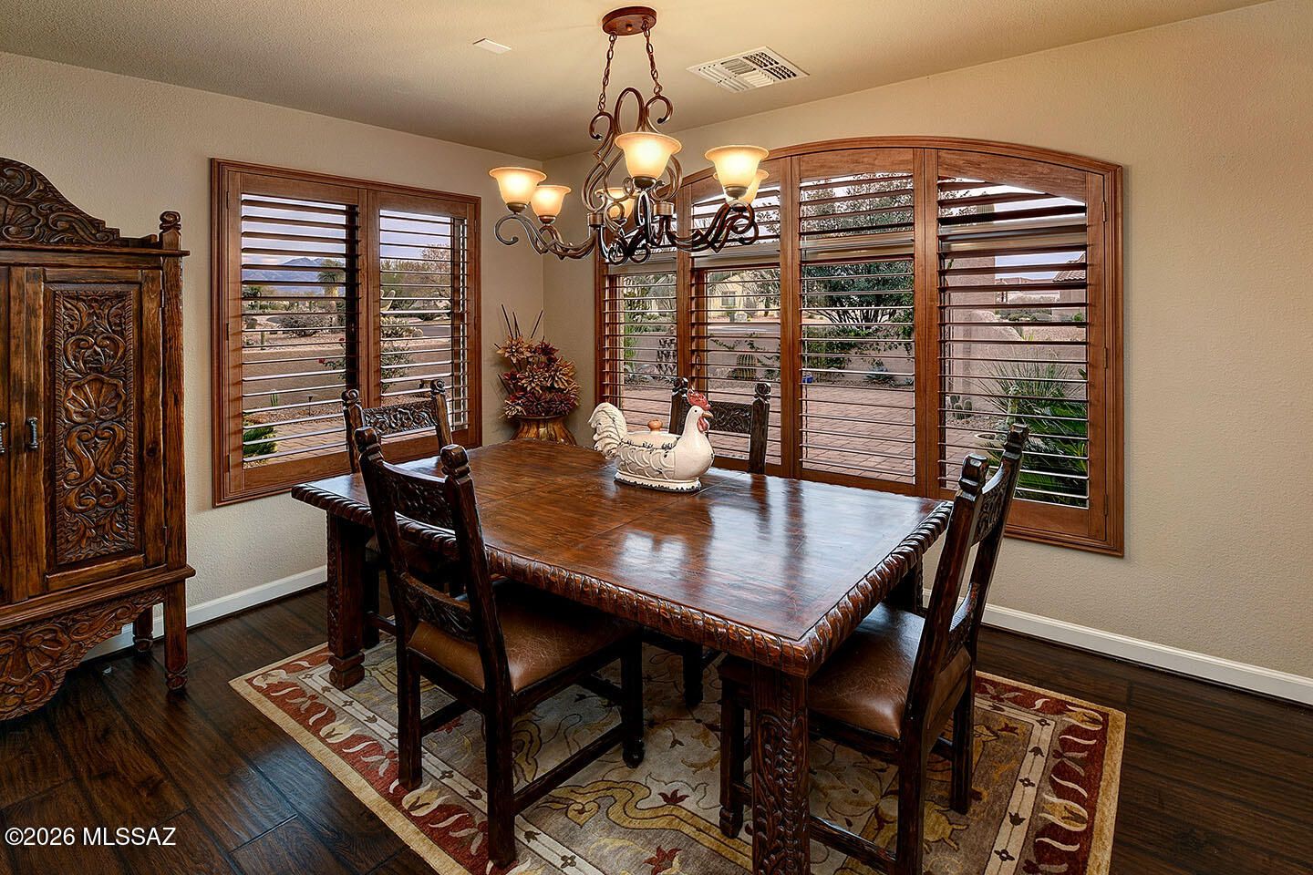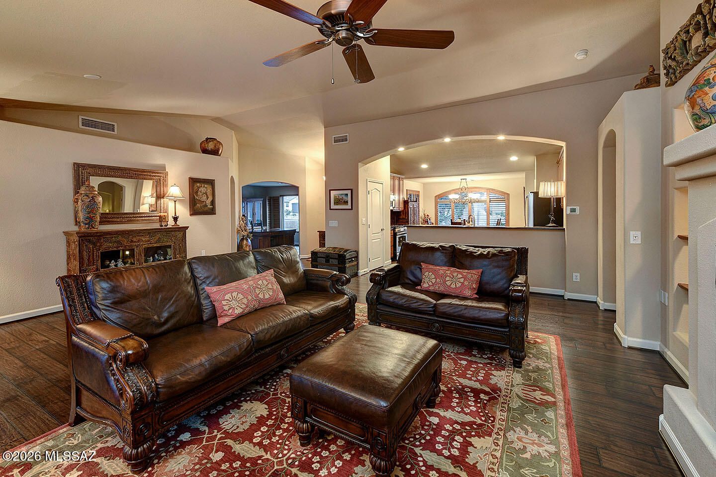 From the moment you arrive, this stunning residence makes an unforgettable first impression. A classic red-tiled roof, majestic Saguaro cacti, and graceful palm trees frame an arched entry that draws you into an expansive paved front courtyard -- a truly grand arrival experience. Whether you're sipping morning coffee in the sunshine or hosting cocktails under the stars, this remarkable outdoor space sets the tone for the elegance that awaits inside. Step through the front door and discover lush, luxurious finishes at every turn. Rich wood-look flooring flows throughout the home, anchored by a warm, glowing fireplace that invites you to linger. The elegant kitchen dazzles with high-end appointments and beautiful details that will delight even the most discerning buyer.