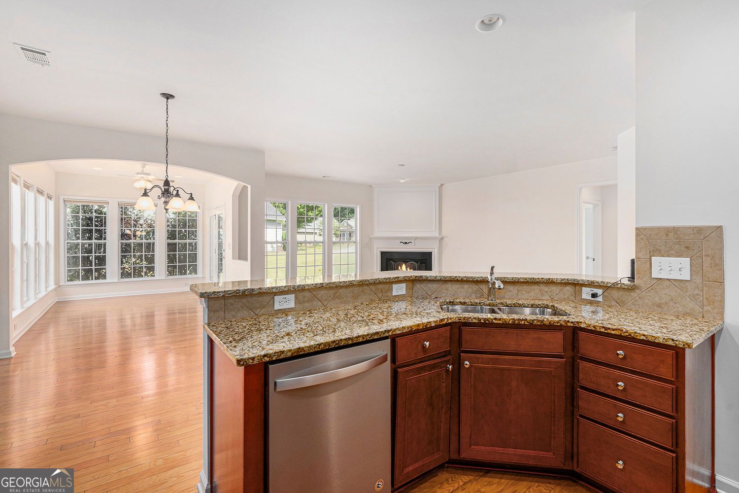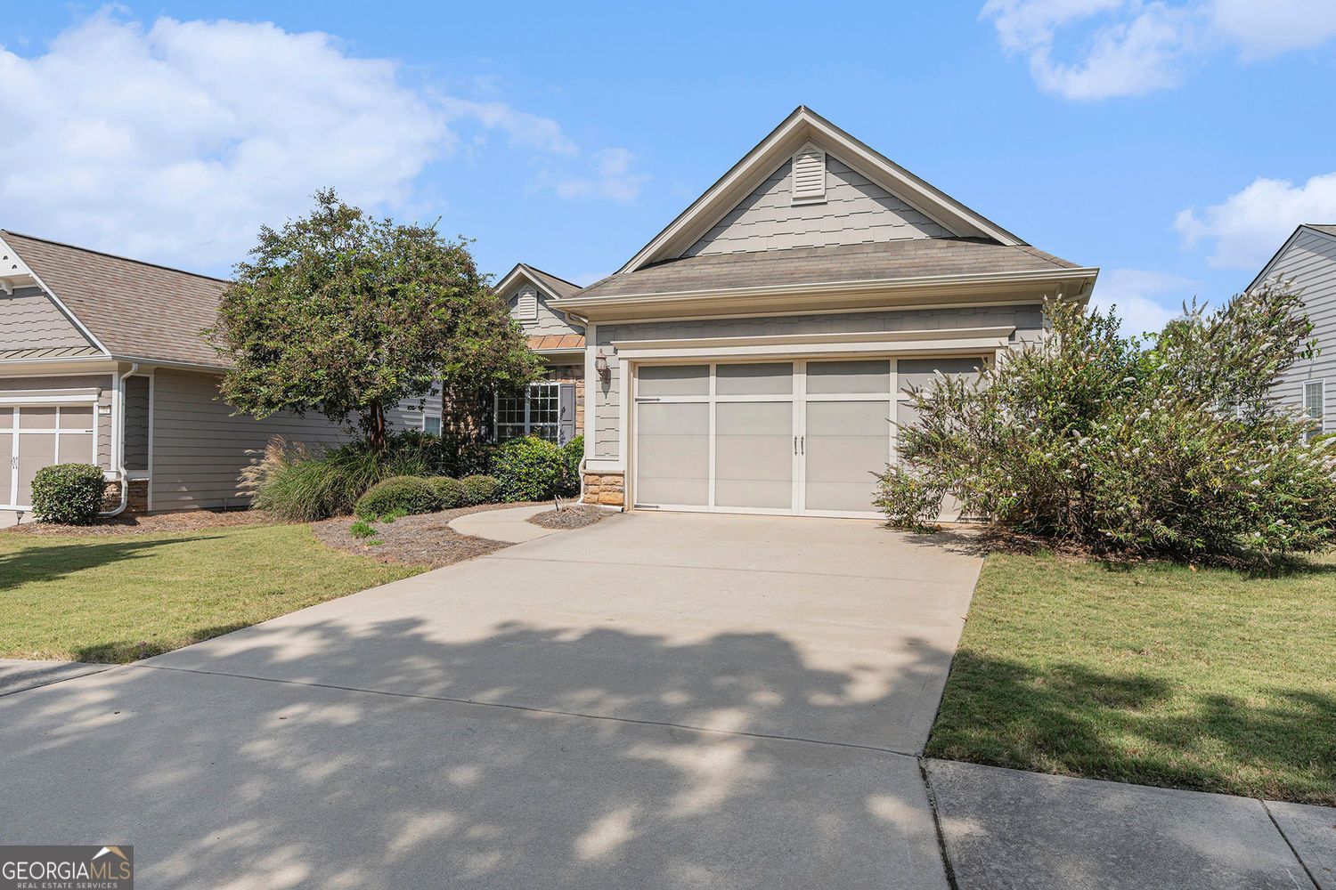A beautiful craftsman style ranch home available and located in the desirable Sun City Peachtree community. As you step through the front door, you are greeted by a spacious foyer that sets the tone for the entire home. The open concept includes the living room, dining room and kitchen making it ideal for intimate gatherings. Living room with wood flooring and a corner fireplace, large dining area and open kitchen including granite countertops, stainless steel appliances, a large pantry and plenty of cabinets. A cozy sunroom leads outside to a covered porch for relaxation. The primary suite is a spacious retreat with an ensuite bathroom featuring dual vanities, a soaking tub and separate shower. Large walk-in with custom shelving. Second bedroom with easy access to hall bath. Large laundry room with cabinets and sink leading to the 2-car attached garage. Freshly painted throughout making it move in ready. Don't miss out on this gem. Call today and schedule your showing!