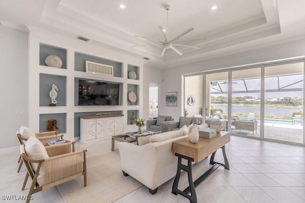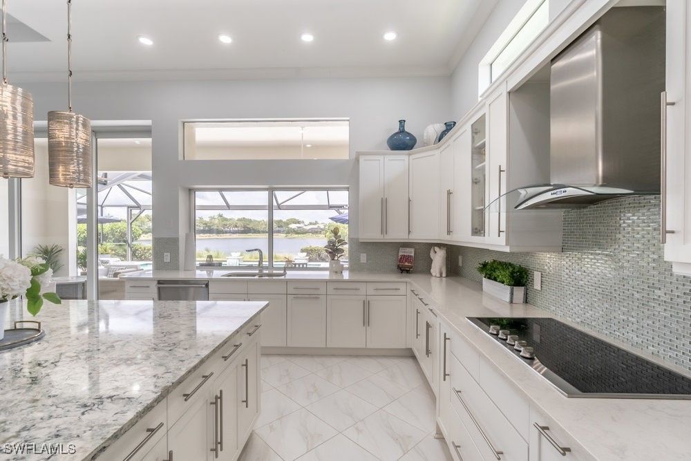 Rarely does a Jasmine Grande with this location, view, and privacy become available in the Isles of Collier Preserve. Positioned on a prized mid-lake homesite with sweeping wide-water views and tucked along one of the community’s shortest, quietest streets, the setting is exceptional. Unlike homes affected by traffic noise from U.S. 41 and Thomasson Dr., and found on long streets like Andros Dr., this location offers rare privacy, yet is close to the clubhouse—an increasingly hard combination to find. Bathed in natural light, this home exudes calm coastal sophistication and timeless elegance. Impeccably maintained and thoughtfully enhanced, every element reflects today’s elevated luxury expectations. The spacious great room opens effortlessly to the outdoors through oversized glass sliders that disappear into the wall, creating a seamless indoor-outdoor flow ideal for the relaxed Florida lifestyle buyers seek. A soaring panoramic-screen enclosure frames the lanai and pool, finished in shimmering blue and green glass tile. Three cascading waterfalls topped with fire bowls create a dramatic “fire and water” effect at night. A stone accent wall highlights the dining area. Multiple gathering areas invite entertaining, and disappearing pocket sliders connect the indoor and outdoor kitchens for easy pass-through serving. Just beyond the enclosure, a lime tree provides fresh cocktail garnishes. Designed for both grand entertaining and intimate living, the open floor plan balances space and privacy while showcasing architectural details like the built-in entertainment wall, shiplap accents, hardwood tray ceiling, molding details, and fresh paint—adding polished sophistication throughout. The expansive kitchen offers modern cabinetry with glass displays, under-cabinet lighting, stone counters, glass tile backsplash, and upgraded Sub-Zero/Viking appliances, anchored by a large island seating six. The formal dining room flows seamlessly between the kitchen and great room. Located in its own wing, the owner’s suite is a tranquil retreat with soothing tones, huge water views, a soaking tub, a natural light-infused shower, dual vanities, and two generous walk-in closets. Two additional ensuite guest bedrooms provide comfort and privacy, while a fourth flex room serves as a den, office, or bedroom. With over 30 upgrades, including a 400-sf finished attic, Vivint security, hurricane shutters, and new AC equipment, the home stands apart for functionality and long-term value. The Isles offers an active, resort lifestyle surrounded by more than 1,300 acres of preserves and waterways. Residents enjoy a vibrant community and clubhouse featuring a state-of-the-art fitness center, tennis, pickleball, resort pool and spa, lap pool, and private restaurant. If you're seeking the best home buy in the Isles, this is it! A perfect combination of "wow" location, beauty, and value. Furnishings negotiable. Come and see it this Sunday before it's gone!