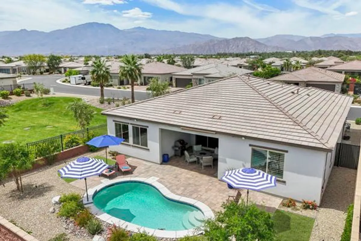 Welcome to elevated desert living in this stunning Excite plan located in the premier 55+ community of Trilogy Polo Club. Set on a private lot adjacent to a wide-open greenbelt with no rear neighbors and only one side neighbor, this 2-bedroom, 2.5-bath home with a versatile den (ideal as an office or optional third bedroom) offers 2,039 sq. ft. of thoughtfully designed living space. With over $122,000 in designer upgrades, the home features plank tile flooring, 5.25'' baseboards, a modern Therma-Tru Pulse front door, and stylish finishes throughout. The expansive great room opens seamlessly to a resort-style backyard through a triple-panel glass patio slider. At the same time, favorable sun exposure provides early afternoon shade--keeping the backyard comfortable and usable from around midday, even on warm desert days. The chef's kitchen impresses with GE Cafe stainless steel appliances, a 6-burner gas cooktop, quartz countertops, soft-close cabinetry, and a spacious prep island with pendant lighting. The private primary suite offers a relaxing retreat with a floor-to-ceiling tiled frameless glass shower and dual quartz vanities, while guests enjoy their own en-suite and the den adds flexible living space. Additional highlights include a laundry room with sink, a leased 15-panel solar system, a climate-controlled golf cart garage, and a resort-style pool with a chiller--perfect for cooling off during the summer months. Homeownership includes full access to the Trilogy Resort Club amenities and activities, a reduced club transfer fee, and negotiable furnishings, making this an exceptional turnkey, move-in-ready opportunity in one of the desert's most sought-after 55+ communities.