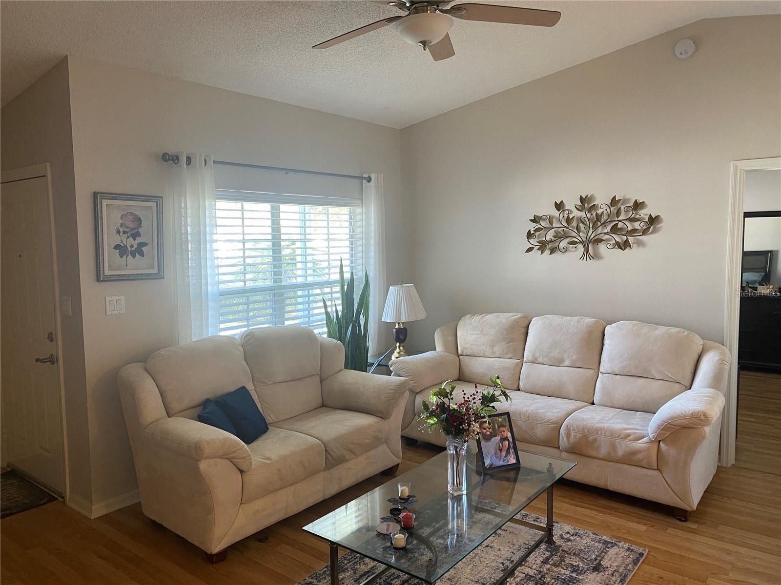 Outstanding one-story home with a screened porch and a beautiful and tranquil backyard with a pergola! Three bedrooms, 2 baths, painted with neutral colors in and out. High ceilings, modern laminate floors throughout, ceramic tile in bathrooms and screened porch. The open floor plan offers a living and dining area that connects to the kitchen and the big/screened porch, ideal for entertaining family and friends. The kitchen is fully equipped with stainless steel appliances, lots of cabinet space and closet pantry; the skylight brings plenty of natural lighting. The master bedroom offers an en-suite bath with a walk-in closet, single sink, shower with seating bench and handicap protection bar. Enjoy your morning coffee comfortably on the spacious covered screened porch. This beautiful 55+ adult community has plenty of amenities and activities for your enjoyment. There are 3 swimming pools, 2 fitness centers, a clubhouse, restaurant, basketball & tennis courts, outdoor shuffleboard, library, two 18-hole golf courses, trails, and plenty of clubs and organizations. Move-in ready, must see!