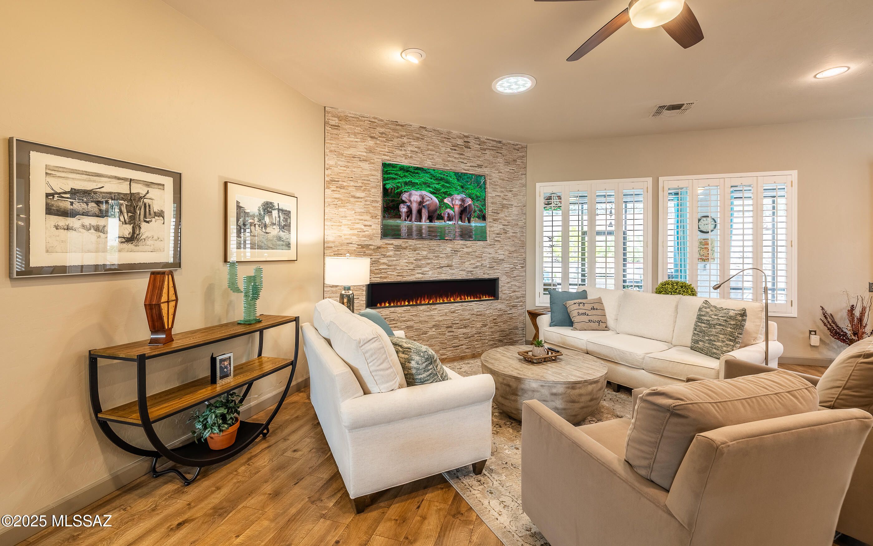 A most beautifully remodeled Santa Barbara model - absolutely stunning kitchen remodel - modern and gorgeous - both bathrooms highly upgraded - exquisite engineered hardwood floors, stylish contemporary lighting, eye-catching linear great room fireplace set in a lovely stacked stone wall. Add in plantation shutters, screened in Arizona Room patio/porch, entertaining backyard w/fire-pit seating area and recreational horse-shoe pit. Home hosts 3 true bedrooms + den/office, oversized laundry room, spacious extra long golf cart bump-out garage. HVAC system replaced 2 years ago! There are several solotubes & solar attic fans. Garbage can wall w/gate. This is a very highly upgraded home w/much privacy. Most of the furniture is available of separate bill of sale. Call for private showing.