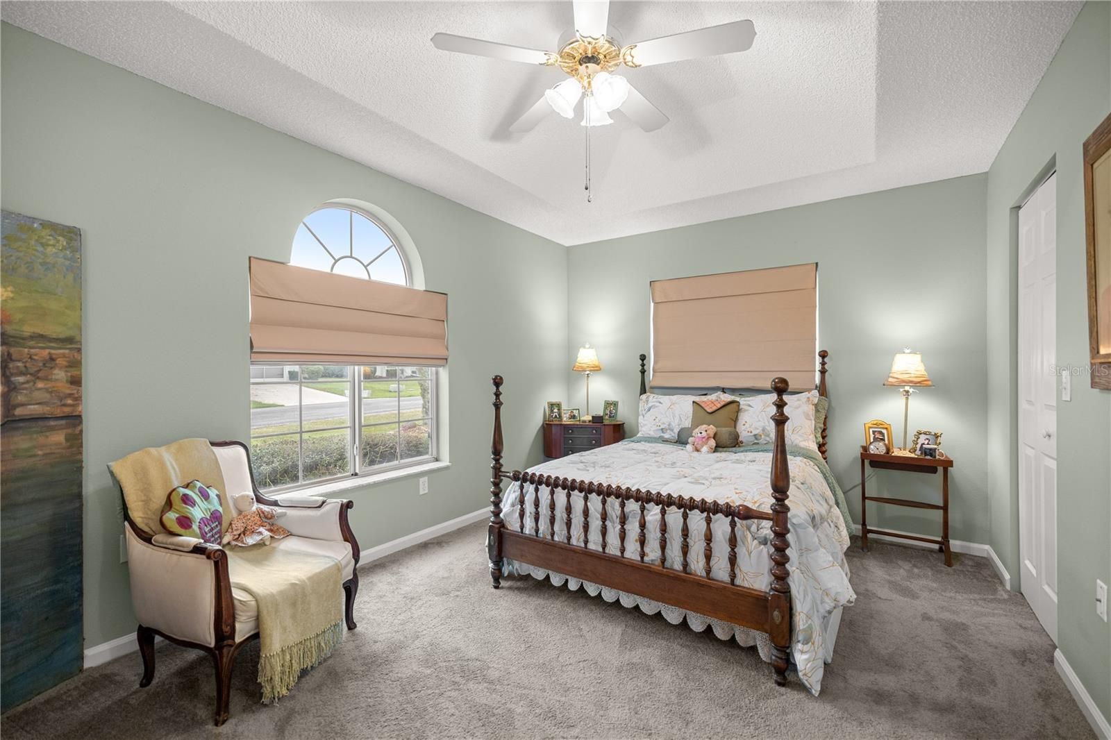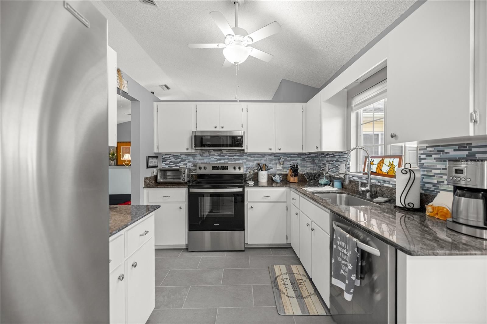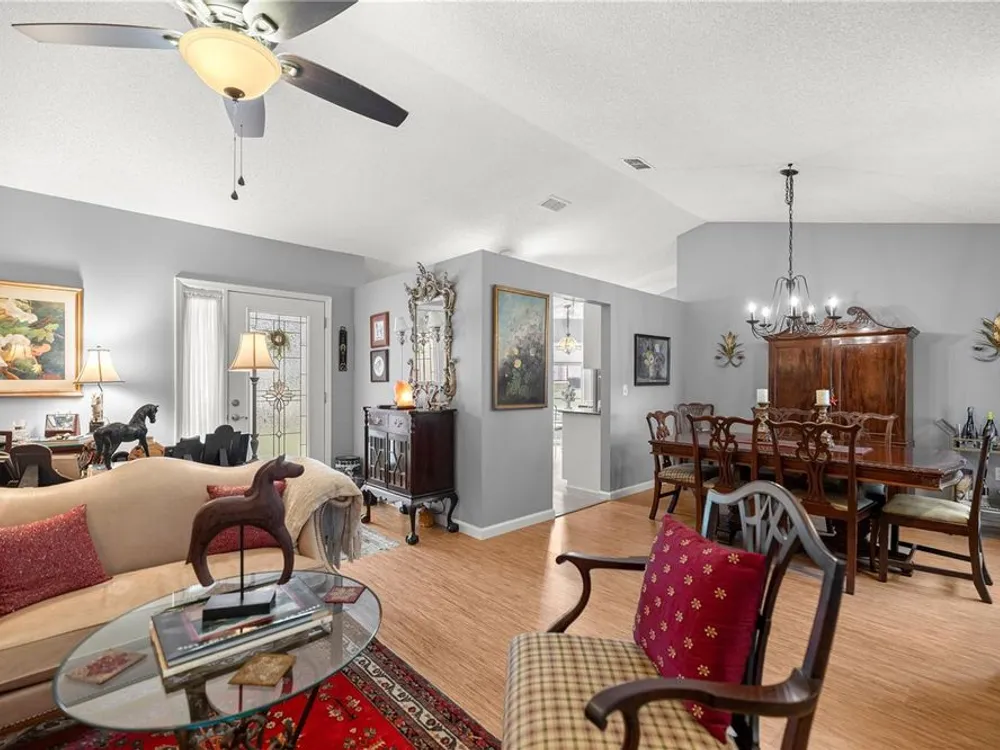 - Cathedral Ceiling(s), Ceiling Fan(s), Eat-in Kitchen, High Ceilings, Living/Dining Room, Main Level Primary, Solid Surface Counters, Walk-In Closet(s), Window Treatments