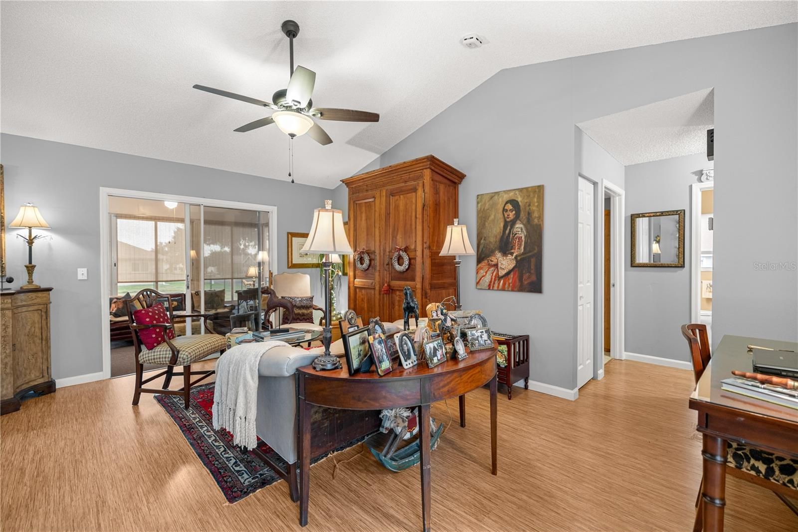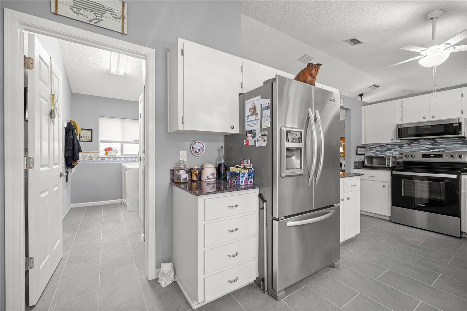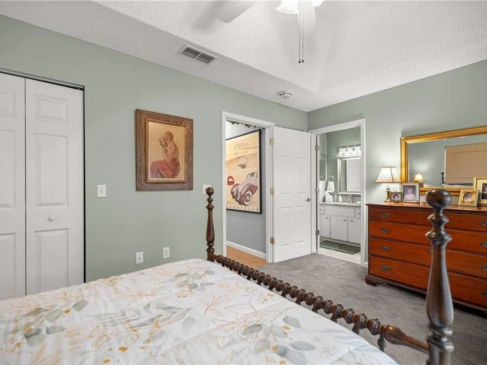 - Cathedral Ceiling(s), Ceiling Fan(s), Eat-in Kitchen, High Ceilings, Living/Dining Room, Main Level Primary, Solid Surface Counters, Walk-In Closet(s), Window Treatments
