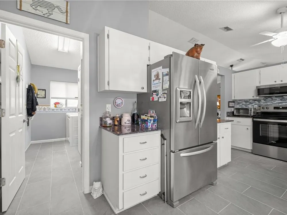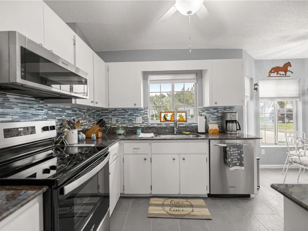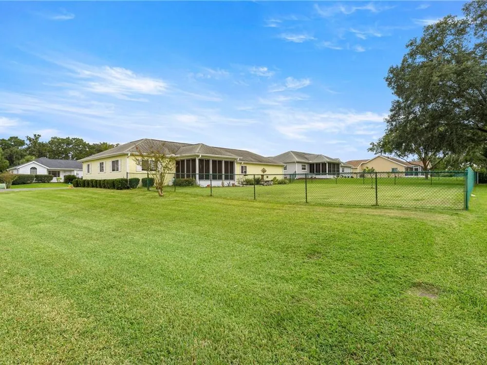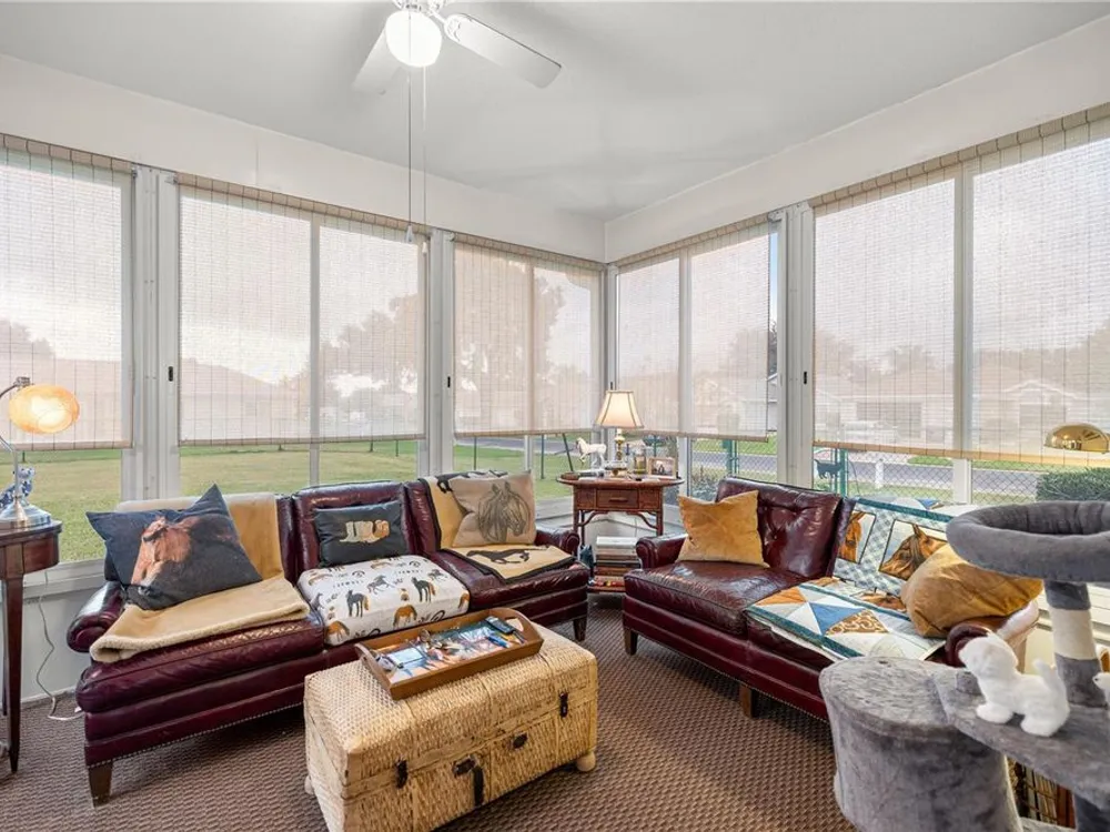 Welcome to this beautifully maintained 2-bedroom, 2-bathroom home in the highly desirable 55+ gated golf community of Ocala Palms. Offering comfort, style, and convenience, this home is designed for both relaxation and entertaining. Step inside to find a bright, open living and dining area with cathedral ceilings that create an airy, spacious feel. The eat-in kitchen boasts granite countertops, stainless steel appliances, and a cozy bay window nook — perfect for morning coffee. Relax in the spacious master suite with a walk-in shower and large closet, while the guest bedroom and second full bath provide comfort and privacy for visitors. Enjoy Florida living year-round in the enclosed Florida room or in your private fenced backyard. Additional features include inside laundry, and a large 2-car garage for vehicles and storage. Located in Ocala Palms, you’ll have access to golf, tennis, indoor and outdoor pools, fitness, and endless social activities — all just minutes from shopping, dining, and the World Equestrian Center.