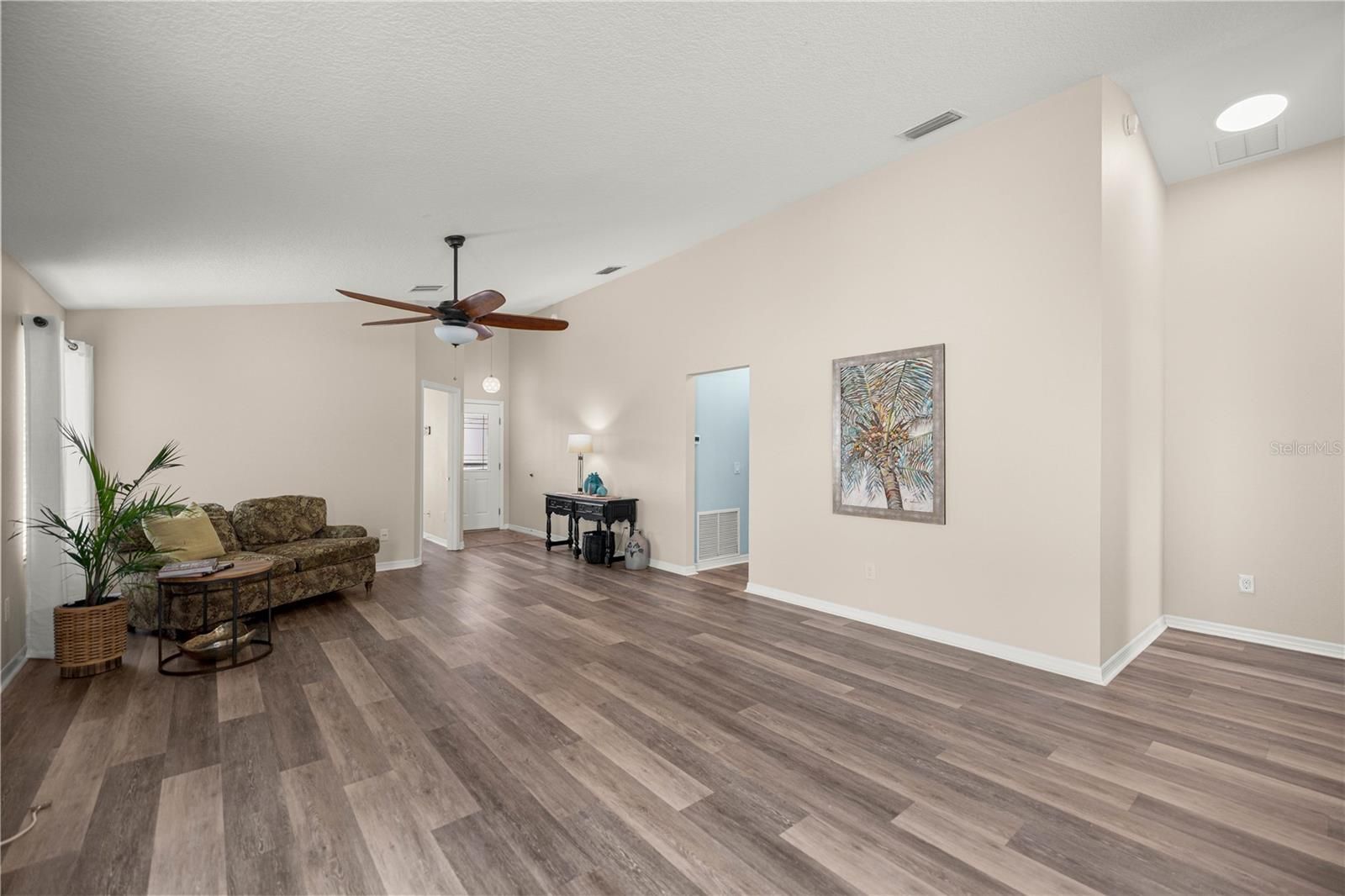 ~~Exceptional value for today's market~~ Seller's are eager to make a move. Prime Location Near The Villages Charter School! Easy golf cart assessable to all The Villages offers. Welcome to this beautifully maintained 3-bedroom, 2-bath At Ease model home, complete with a 2-car garage, located in the highly sought-after family-friendly neighborhood of Bison Valley. Just under a mile from The Villages Charter School and close to CR 466, providing easy access to the area’s most popular restaurants, shops, and essential services. This home offers the perfect blend of comfort, convenience, and lifestyle. Step inside and immediately feel at home with luxury vinyl plank flooring throughout—no carpet, fresh paint, and soaring ceilings that create a bright, airy atmosphere. The spacious open-concept layout is perfect for both everyday living and entertaining. The kitchen is a standout feature with light cabinetry, a stylish backsplash, new light fixtures, stainless steel appliances, and a large farmhouse-style sink. The indoor laundry room offers plenty of space and storage. The guest bathroom is smartly placed near the guest bedroom, providing privacy and functionality. The master suite is a true retreat, featuring vaulted ceilings, a lighted ceiling fan, a spacious walk-in closet, and an ensuite bath with dual sinks and ample counter space. Step out through the sliding glass doors onto a screened lanai, ideal for morning coffee or relaxing evenings. Just beyond is a concrete patio slab, perfect for grilling and outdoor gatherings. The lush backyard and blooming crepe myrtle tree out front add charm and curb appeal. Live minutes from shopping, dining, and entertainment near CR 466 and at Lake Sumter Landing. Whether you’re raising a family or looking for a peaceful neighborhood with easy access to The Villages, this home checks all the boxes!