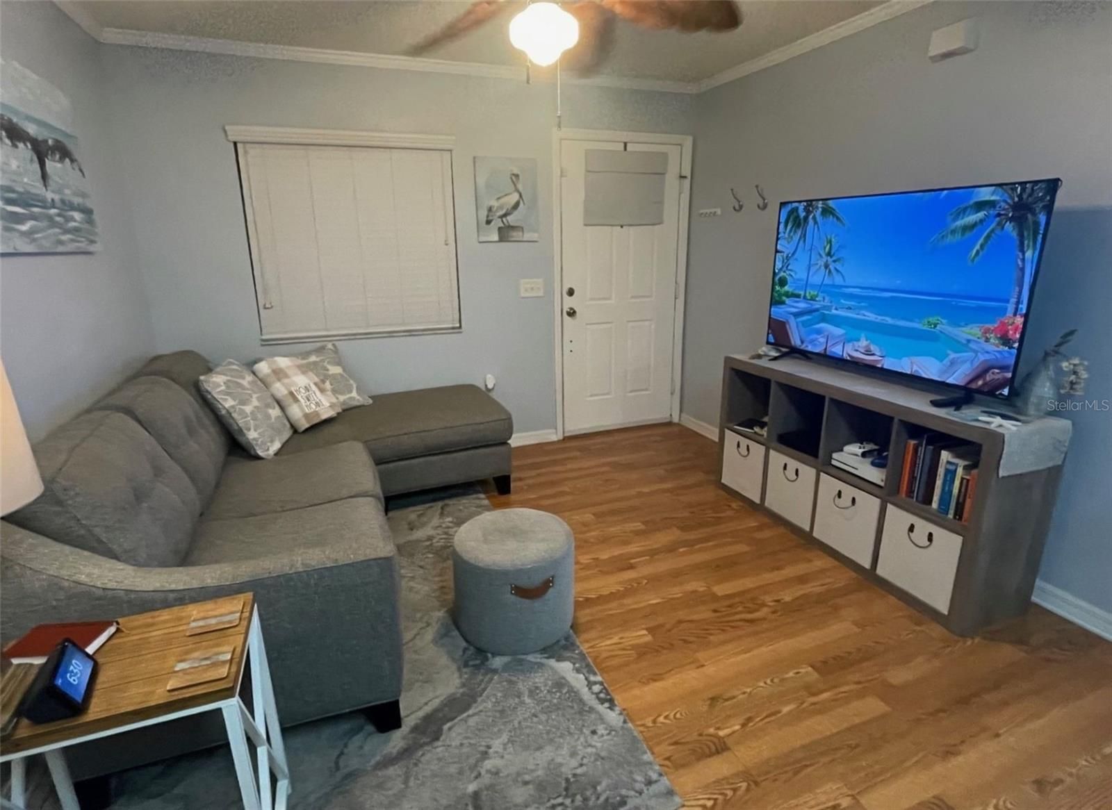 - Ceiling Fan(s), Crown Molding, Eat-in Kitchen, Kitchen/Family Room Combo, Main Level Primary, Solid Surface Counters