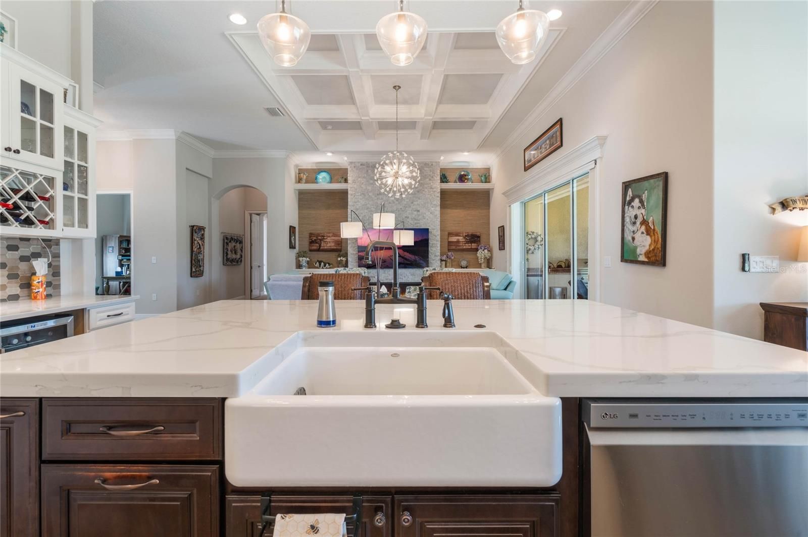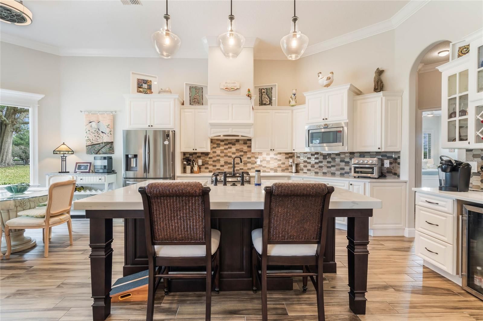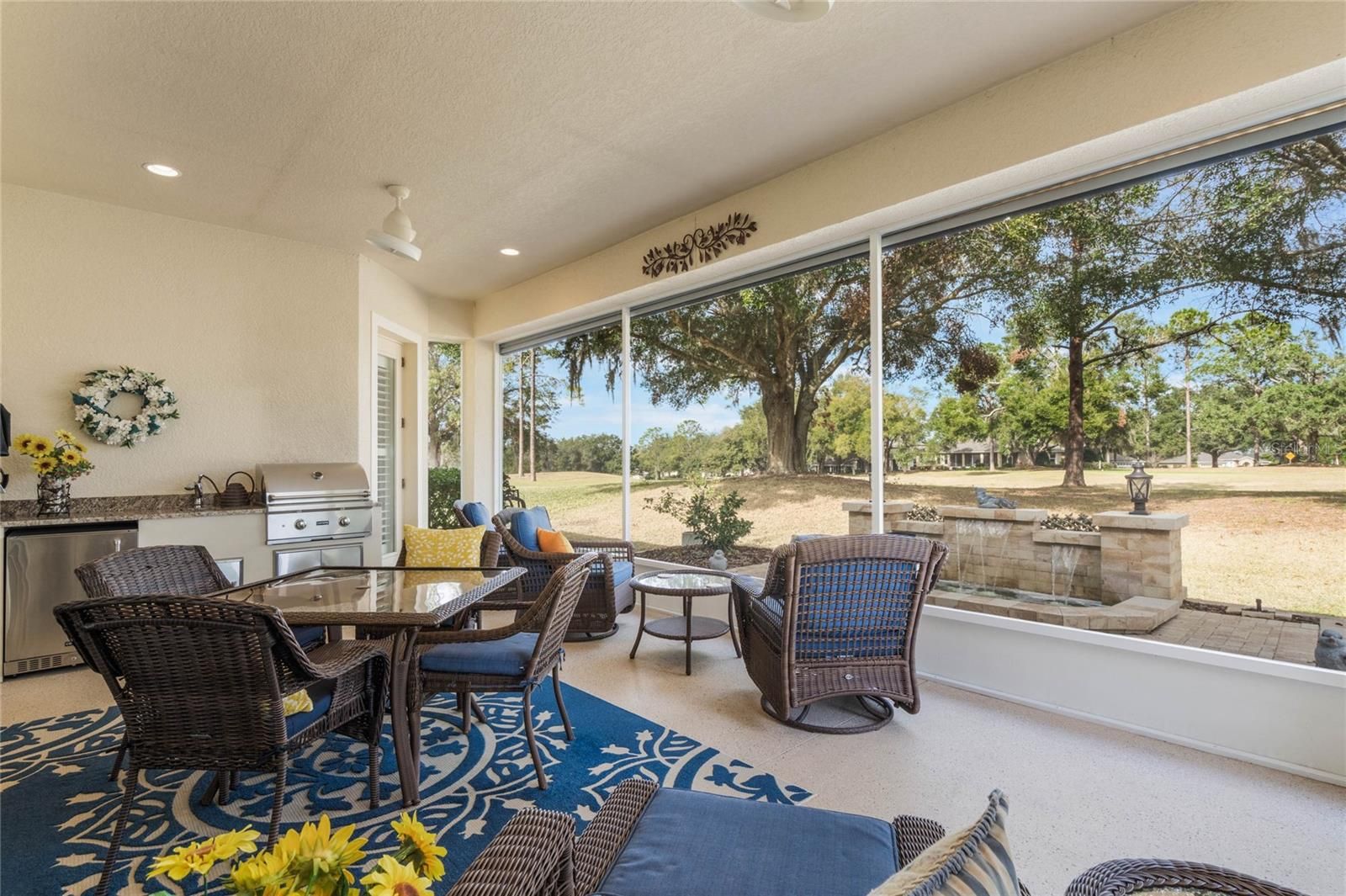 Elegant Golf Course Home with Exceptional Design and Serene Views. Nestled on a peaceful golf course homesite, this stunning 2,768-square-foot home offers a perfect combination of luxury, functionality, and tranquility. With 3 bedrooms, a den, 2.5 bathrooms, and a 3-car garage, this thoughtfully designed residence is ideal for those seeking a refined yet comfortable lifestyle. As you step inside, you’ll immediately notice the high tray ceilings adorned with crown molding and beautiful lighting that enhance the home’s sense of spaciousness and elegance. The open floor plan seamlessly connects the living room to the screened lanai through expansive sliding glass doors, creating an exceptional space for entertaining or simply enjoying the stunning golf course views and custom lighted waterfall. The gourmet kitchen is a true showstopper, featuring custom cabinetry, butcher block quartz, a deep farm sink, a large island, and a cozy breakfast nook illuminated by a mitered glass bay window that provides ample natural light and overlooks the third tee box. The master suite is a private retreat, complete with a luxurious bathroom that includes a wide shower, a soaking tub, and separate his-and-hers vanities. The Jack-and-Jill bathroom, shared by the secondary bedrooms provide private access, and features custom mirrors and glass shower doors that add a touch of sophistication. Unique architectural details, such as a lighted sink in the powder room and expansive walls perfect for displaying art, further elevate this home’s design. Step outside to the screened lanai, where a built-in outdoor kitchen awaits, making it the ideal space for al fresco dining or relaxing in the fresh air. The beautifully landscaped yard, highlighted by a romantic lighted waterfall, adds to the serene ambiance of this property. Plantation shutters and electric remote screens provide both style and functionality, while the automatic whole-house generator ensures peace of mind. Practicality meets elegance with ample storage throughout the home, including deep pull-out drawers, a walk-in pantry, and custom cabinetry. The spacious laundry room and separate utility room provide additional convenience and versatility. The 3-car garage is designed with modern needs in mind, featuring easily accessible electric charging outlets and plenty of room for vehicles and storage. Located in a quiet neighborhood that exudes beauty and serenity, this home is part of an active, sociable community that offers a perfect balance of tranquility and engagement. Every detail of this home has been meticulously crafted to provide a lifestyle of comfort, beauty, and sophistication. Schedule your private tour today and experience the exceptional charm of this remarkable golf course home.