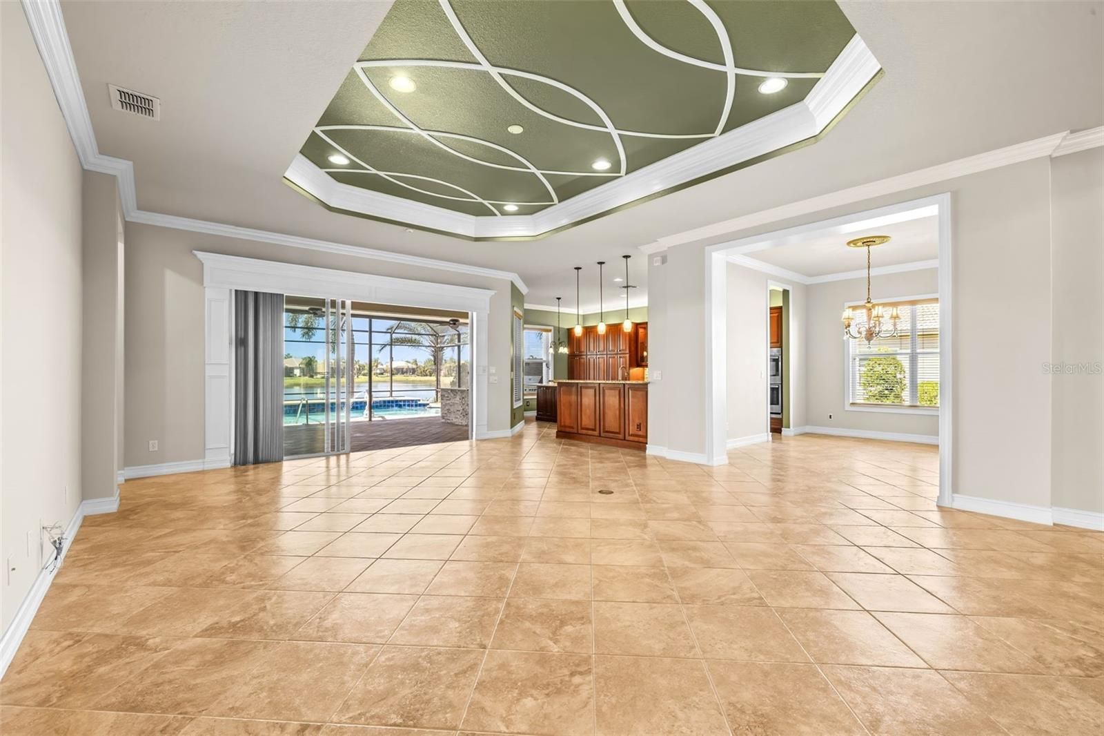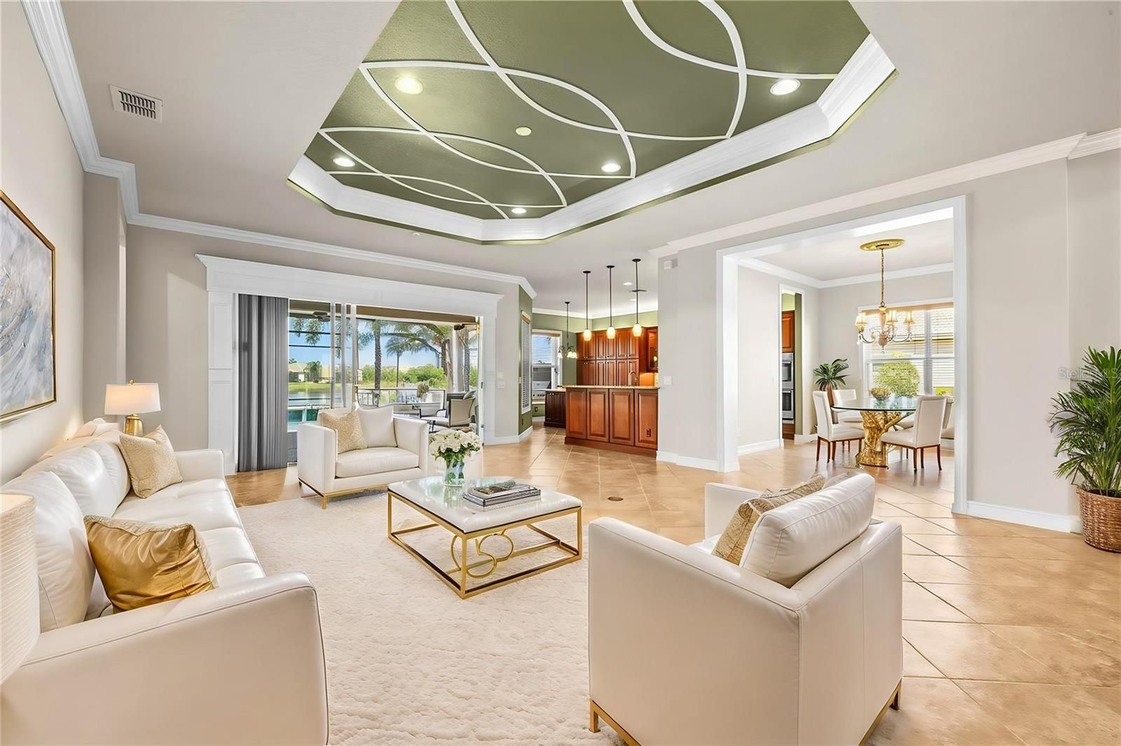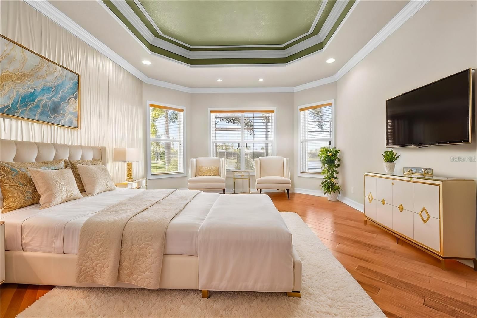 - Ceiling Fan(s), Coffered Ceiling(s), Crown Molding, High Ceilings, Open Floorplan, Main Level Primary, Stone Counters, Walk-In Closet(s), Wet Bar, Window Treatments