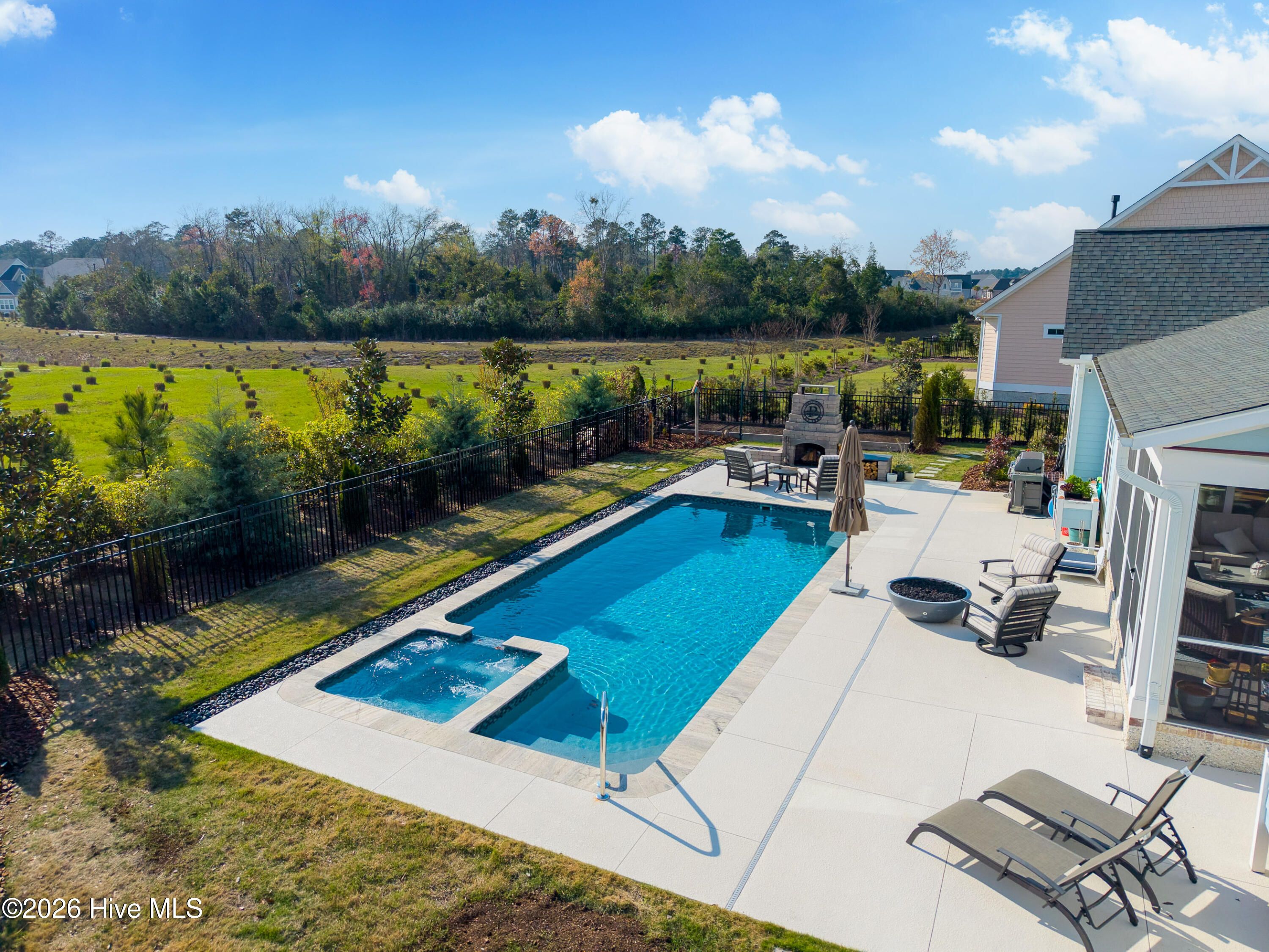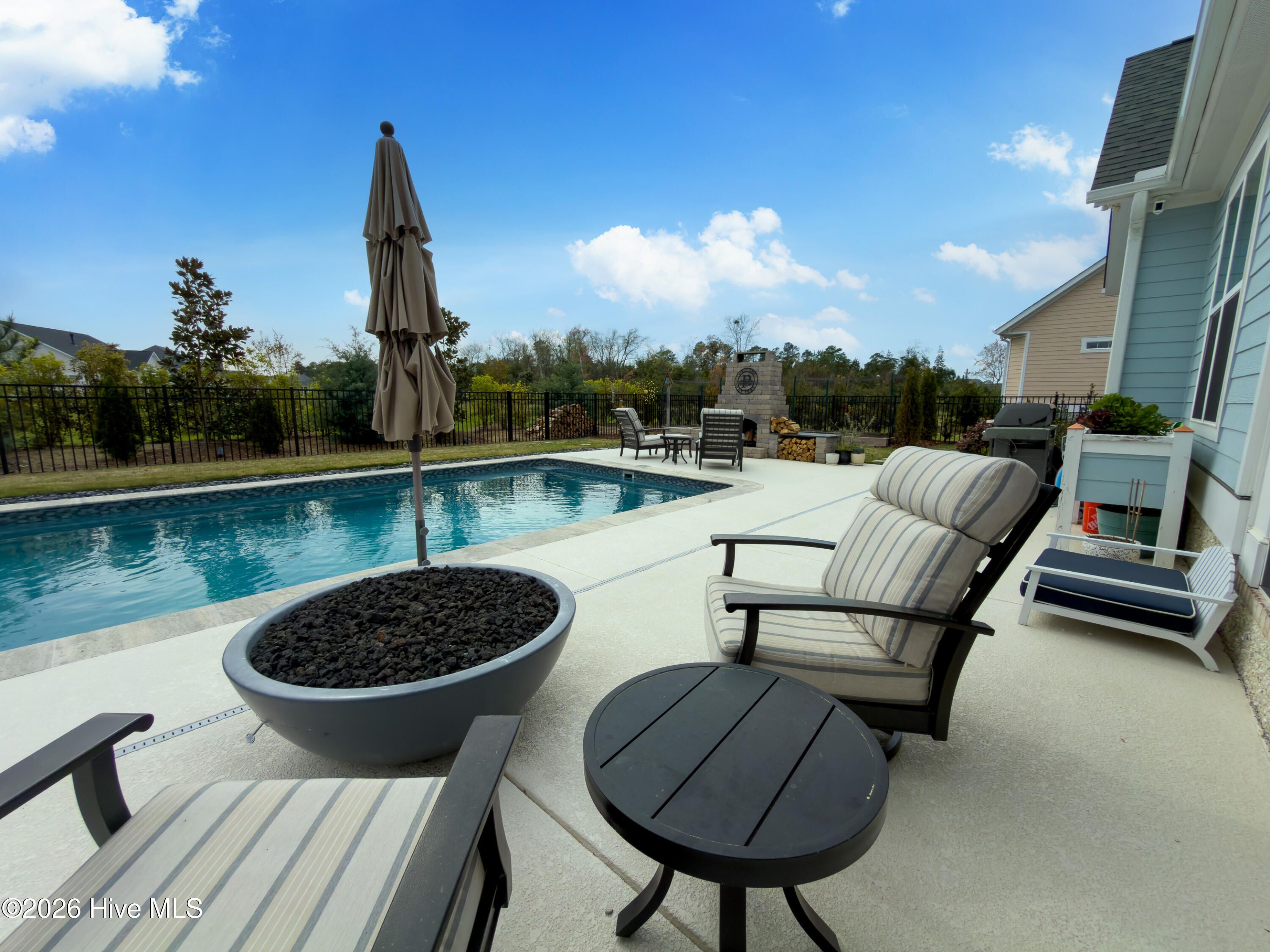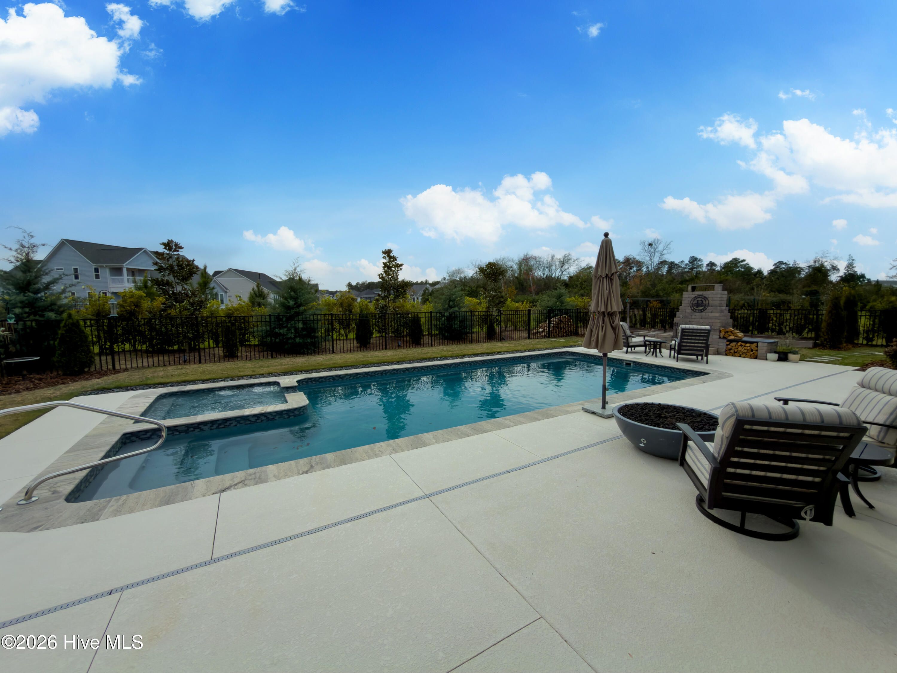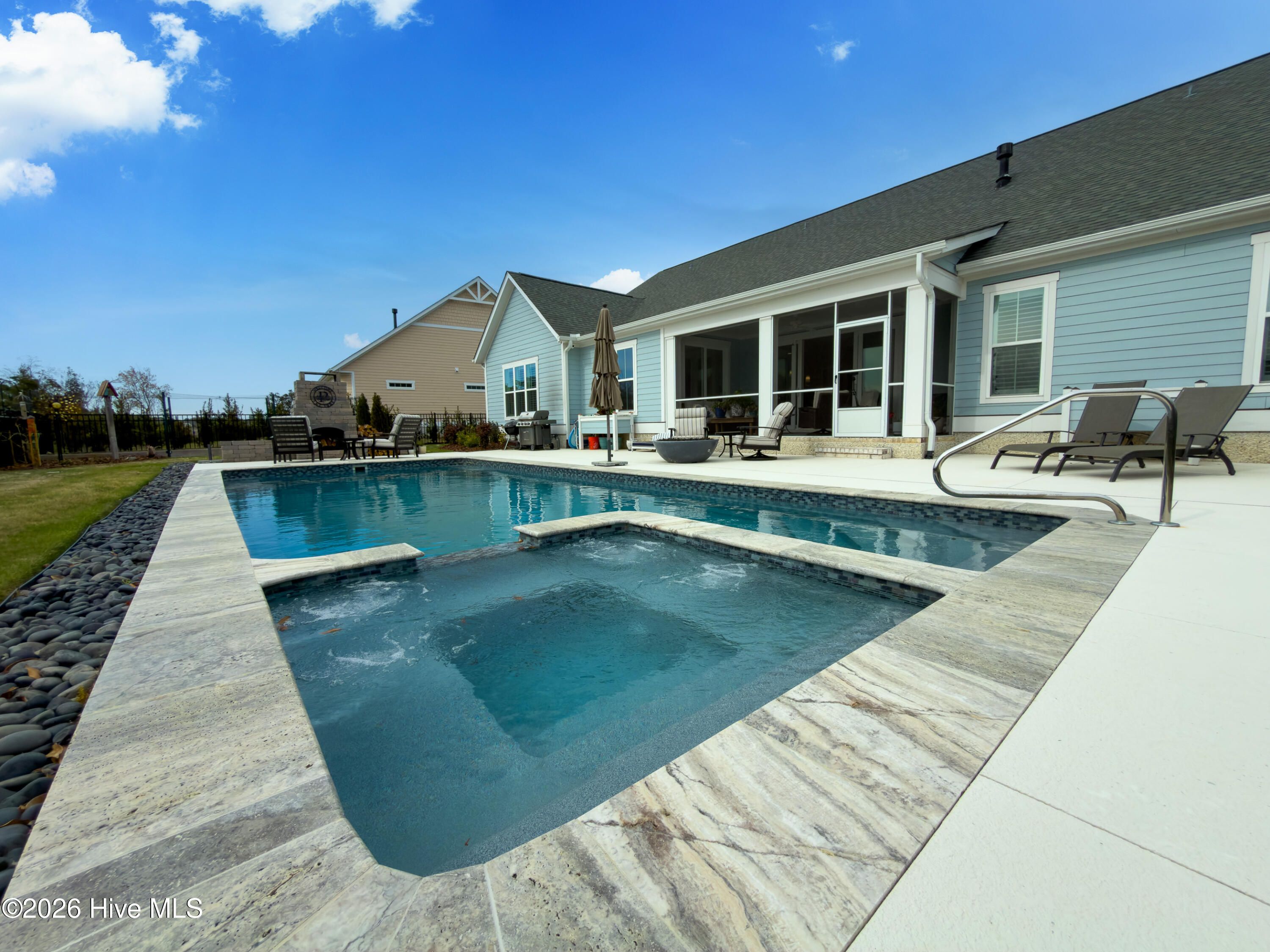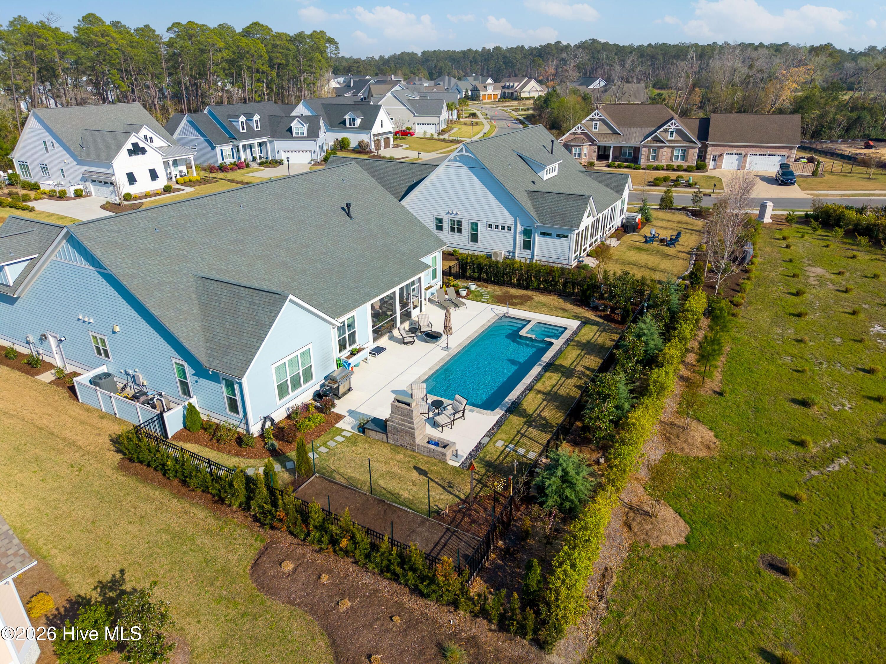 Located within the prestigious Cape Fear National community of Brunswick Forest, this exceptional Legacy Homes residence--The Montgomery--offers a refined blend of timeless design, elevated finishes, and resort-style outdoor living. Featuring 4 bedrooms, 4.5 baths, and 3,478 square feet, the thoughtfully designed floor plan also includes a spacious second-floor bonus suite with full bath. The home's striking curb appeal is defined by a tabby coat foundation, metal accent roofing, and an expansive front porch with ashlar slate-stamped concrete--setting the tone for the craftsmanship found throughout. Inside, a grand foyer is flanked by a formal dining room with coffered ceiling and a private study, leading into an impressive great room with custom built-ins, a coffered ceiling, and 8-foot center-meet sliders that seamlessly connect indoor and outdoor living. The designer kitchen is both sophisticated and functional, featuring a large island, custom cabinet hood, white cabinetry, quartz countertops, a white glazed tile backsplash, farm sink, pot filler, double ovens, and wine cooler--perfectly suited for both everyday living and entertaining. The main-level owner's suite is a private retreat, offering dual custom walk-in closets--one with direct access to the laundry room--and a spa-inspired bath with freestanding soaking tub, expansive tiled shower, and dual quartz vanities. Outdoor living has been elevated to a true resort-style experience. The screened-in porch and patio open to a beautifully curated backyard featuring a heated saltwater pool & hot tub, gas firepit, outdoor fireplace, fencing, and professional landscaping--creating a private oasis designed for year-round enjoyment. Additional enhancements include whole-house water filtration, upgraded lighting and fixtures, custom laundry room cabinetry with sink, and plantation shutters throughout. Offering a seamless blend of luxury, comfort, and lifestyle, this exceptional home presents a rare opportunity within one of the area's premier golf course communities.