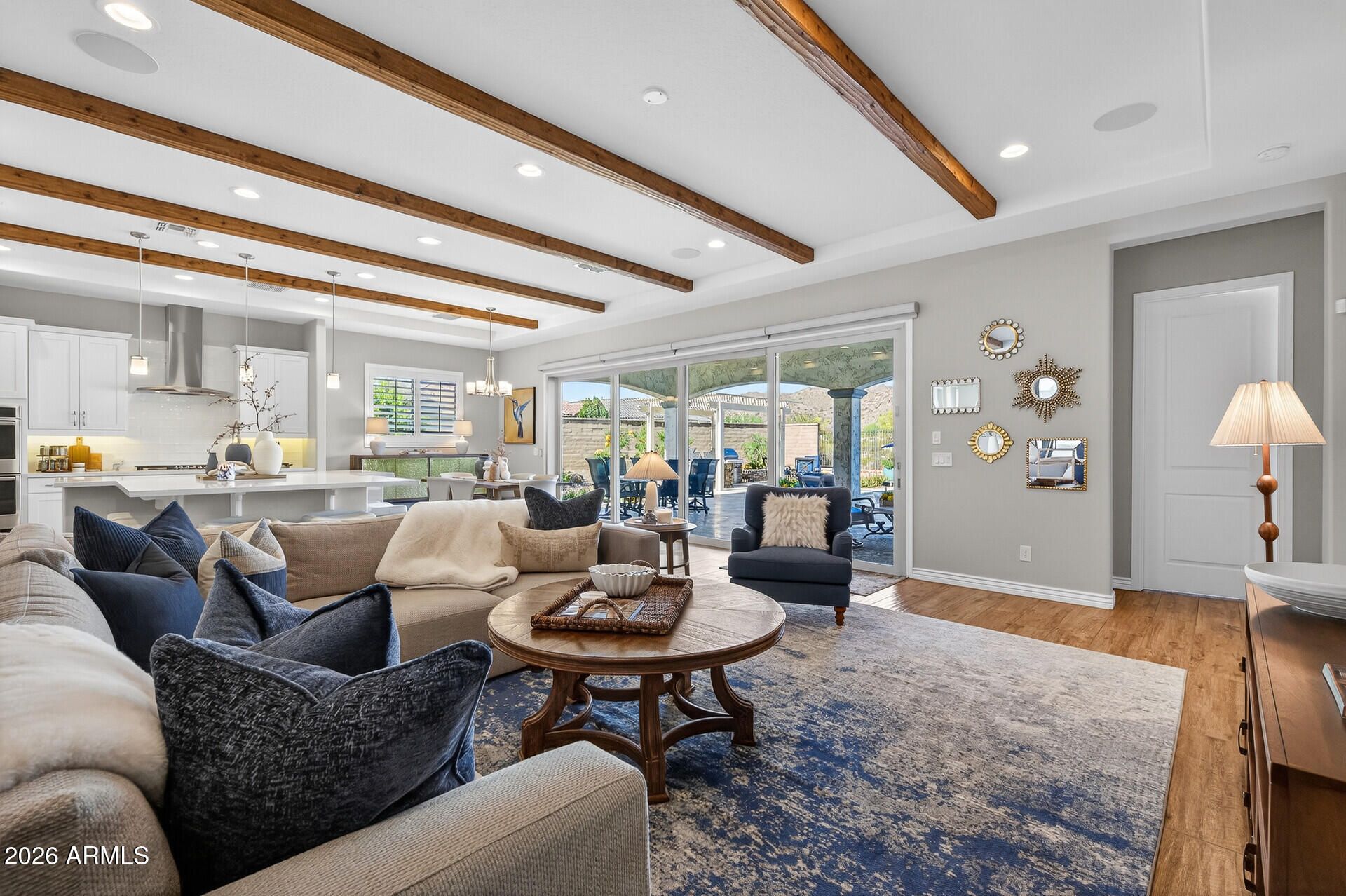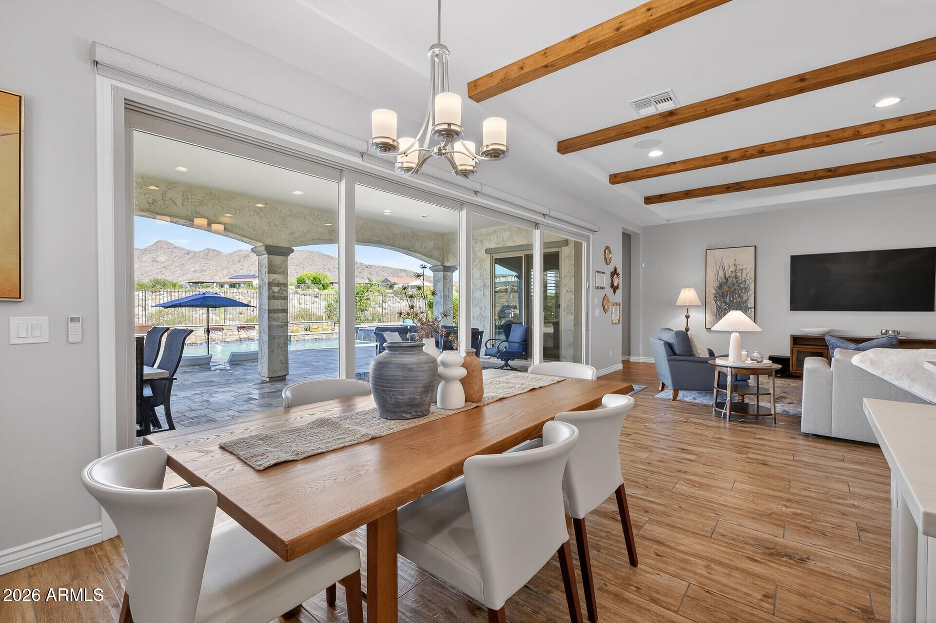 Single story pool home with a golf course lot on the 11th hole of the Victory course with panoramic views of the white tank mountains on an oversized lot in the active adult community, Victory. The moment you open the front door you are welcomed by a 19 foot slider opened to a backyard oasis with heated pool, spa, fire features, fire pit, outdoor BBQ & bocce ball court. Custom white shaker kitchen with large island, stainless steel appliances & walk in pantry. Wood beams cover the ceiling of the kitchen & living room area. Master bedroom overlooks golf course with mountain views Master bath with dual vanity sinks, walk in shower, custom shelving in master closet & access to the laundry. Home has an additional 2 bedrooms, bath plus office with doors. Community has golf, spa, gym & more