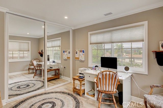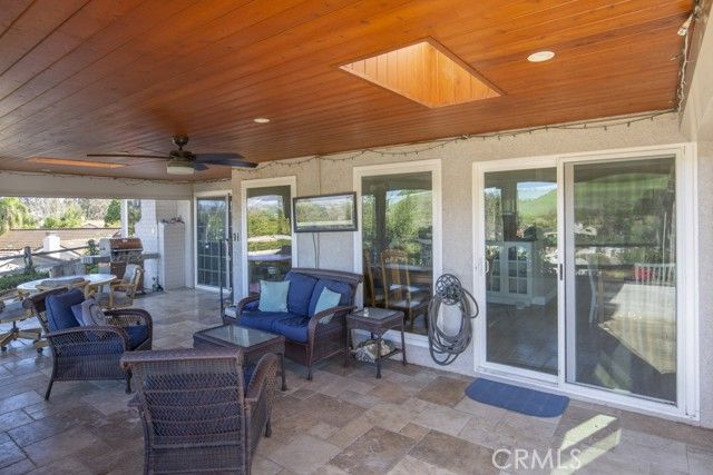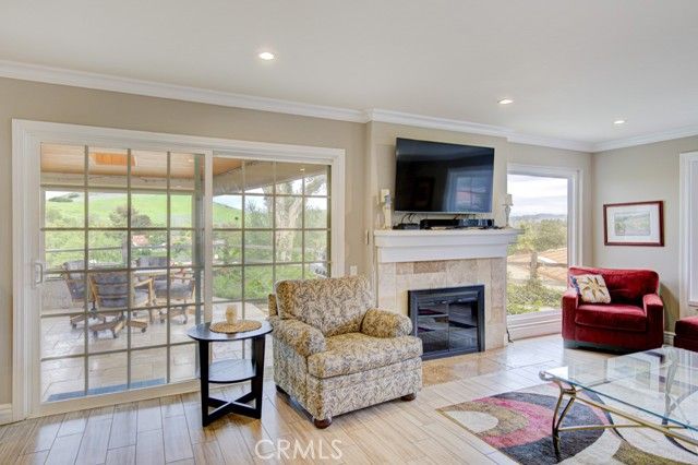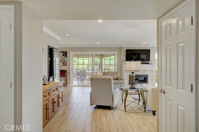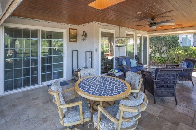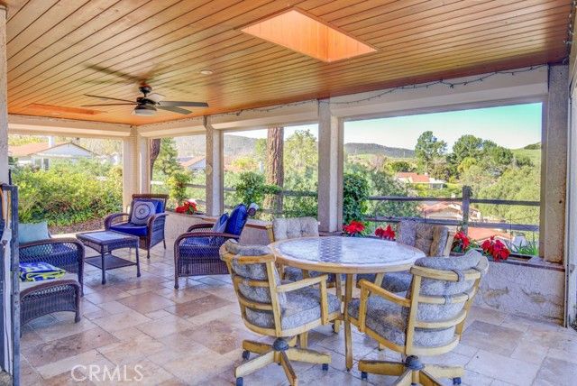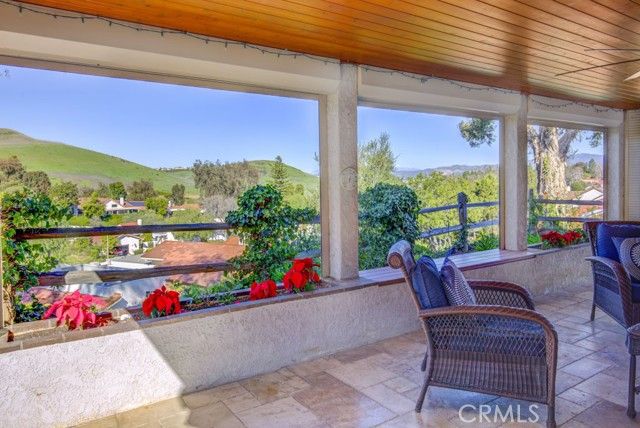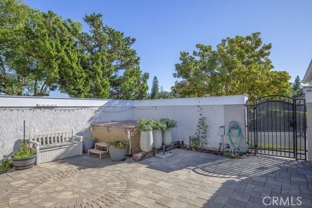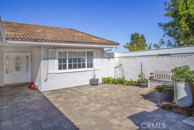 Welcome to 5078 Tero – an expanded, beautifully remodeled single-level detached VILLA TERRAZA residence in the Laguna Woods senior community. This home has one of the most spectacular views of any property in Laguna Woods Village. On a clear day, one can see the snow-covered peak of Mt. Baldy! View from the rear patio as well as the residence’s common rooms is simply magnificent – boasting an impressive 180° view of trees, hills, neighborhood rooftops & the Saddleback Mountains. Property is situated on a quiet street within the sought-after Gate 11 neighborhood far from busy roads & noisy highways. Wrought-iron front gate opens to an expansive private courtyard w/hot tub. Attractive front door w/etched glass inserts opens to a short hallway leading to the light & bright living room which features a lovely bay window, enormous wine fridge & wood-burning fireplace. Both living room & adjacent dining area have direct access to the large covered rear patio via glass sliders. Original side patio adjacent to the dining area has been replaced w/nearly 150 sq. ft. of additional living space allowing for a small office cubby & extended space for an extra-large dining table. Remodeled kitchen has stainless steel appliances & lots of cabinet storage w/convenient pull-out drawers. Primary bedroom suite has been expanded by over 100 sq. ft. Primary closet extends the length of one wall. Primary bathroom features attractive wood cabinets w/stone countertops, dual sinks, privacy toilet door & oversized shower w/convenient seat. Guest bedroom (also en suite) has an added window providing a lovely mountain view. This versatile room could easily serve as a home office, exercise room or arts & crafts workshop. Upgrades include smooth ceilings, recessed lighting, crown molding & baseboards, central HVAC, porcelain tile flooring in the common areas & mirrored closet doors in both bedrooms. Enormous covered rear patio has skylights, ceiling fan, attractive built-in planters & retractable shades & is ideal for large-scale year-round entertaining, dining & relaxing. Rear patio, front courtyard & expanded dining area serve as the ultimate environment for large social functions. This home is perfect for entertaining! Direct garage access to the residence via a small laundry room w/sink & storage cabinets. Driveway easily accommodates two additional vehicles & there is also ample street parking for guests.