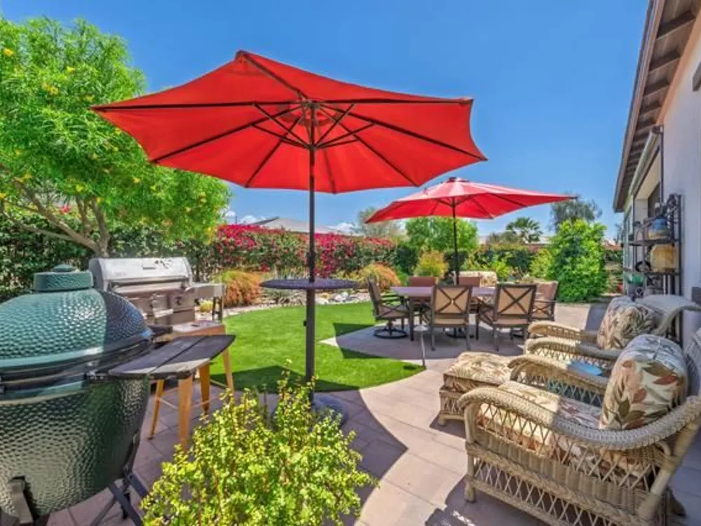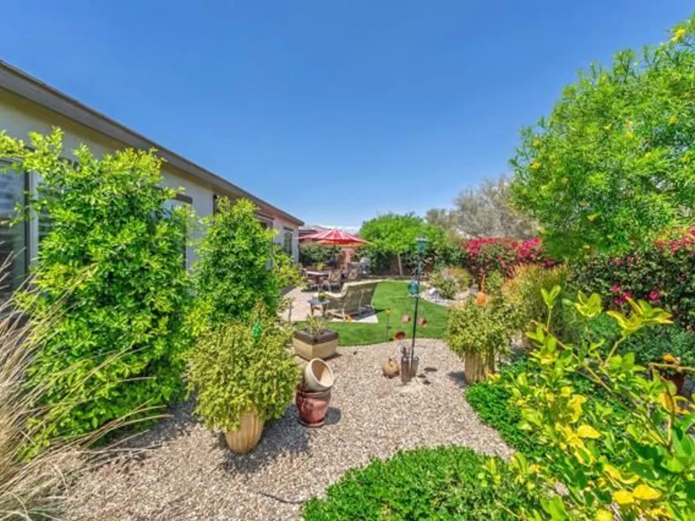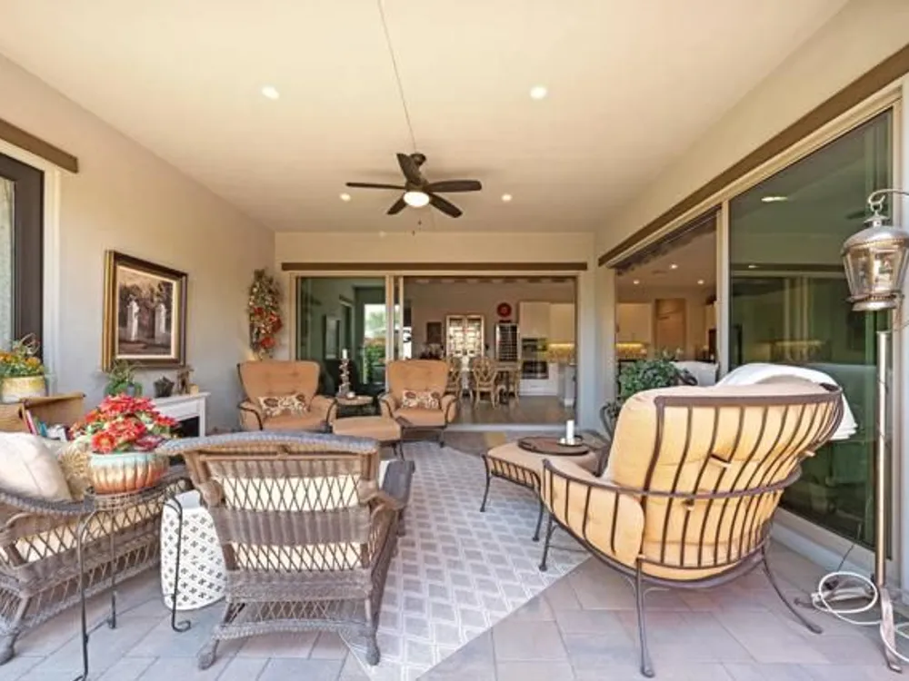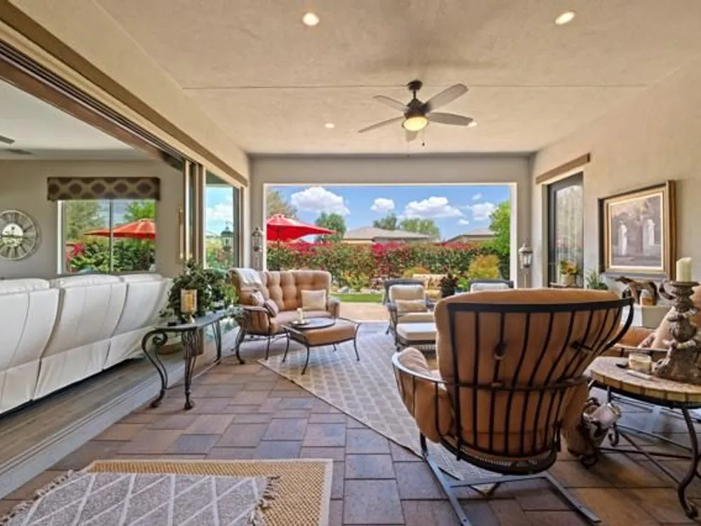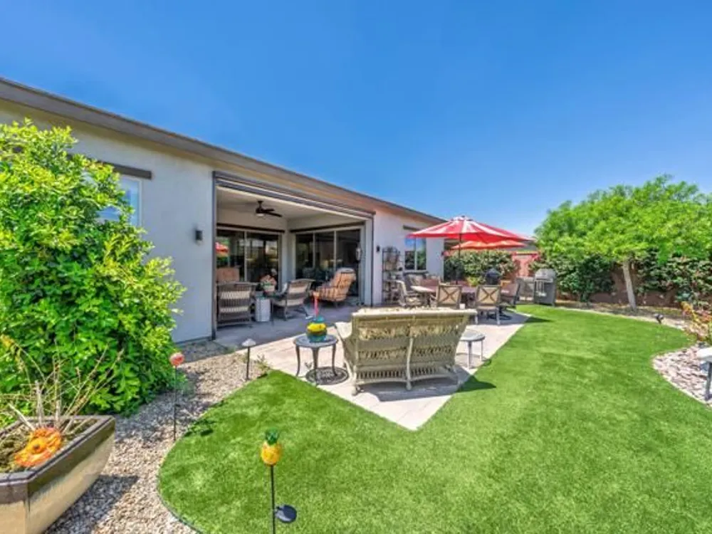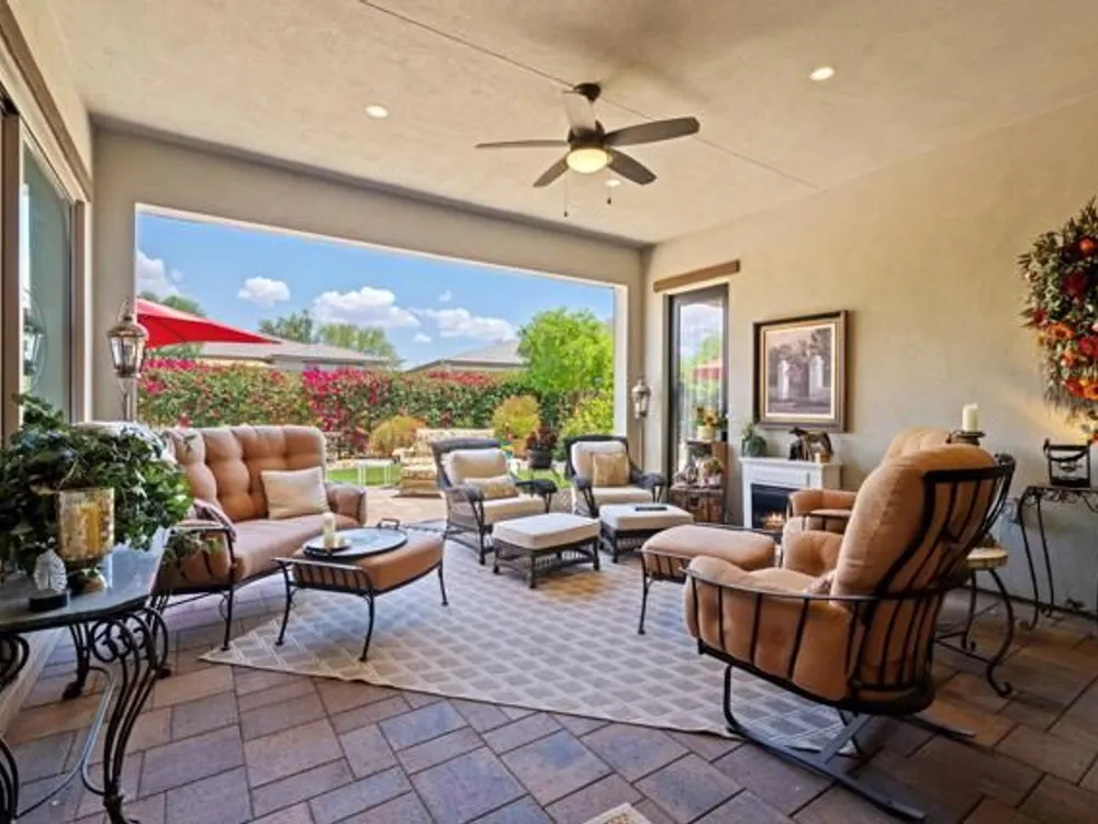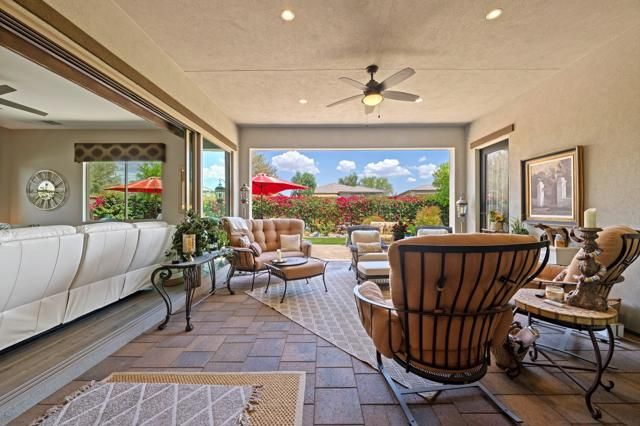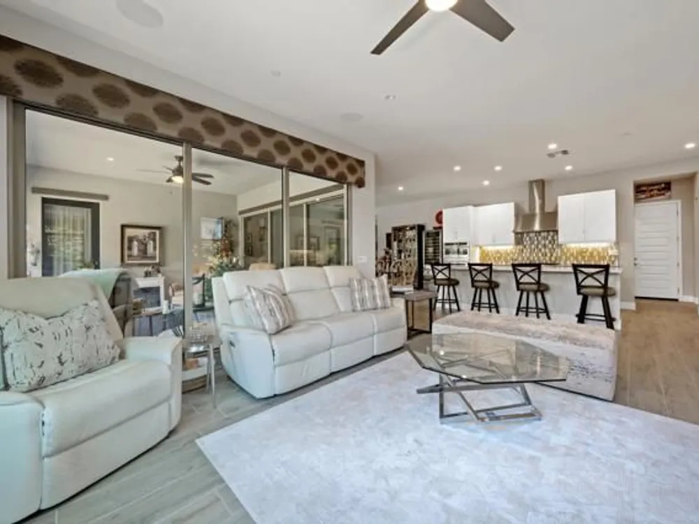 Welcome to a stunning residence at 50780 Harps Canyon Drive, nestled within the prestigious gated community of Trilogy at the Polo Club. This exquisite home exudes both charm and sophistication, offering 2 bedrooms and 2.5 bathrooms spread across a generous 2,039 square feet of living space. As you step inside, you'll be captivated by the grandeur of 10-foot ceilings and 8-foot doors, complemented by elegant tile flooring throughout the common areas. The heart of this home is the chef's kitchen, boasting a commercial-grade gas cooktop and hood, sleek stainless steel appliances, soft-close cabinets, and convenient pull-out shelves--an entertainer's dream. The seamless indoor-outdoor flow is accentuated by two rolling glass doors that open to a beautifully paved patio, perfect for hosting gatherings or simply relaxing. Enjoy the lush, low-maintenance backyard, while an electric screen on the patio ensures year-round comfort and maximizes indoor/outdoor living. With upgraded bathrooms, custom valances, electric window shades, and 5-inch base molding, every detail has been meticulously crafted. Custom paint adds a touch of elegance, creating a warm and inviting atmosphere. There is an oversized two car garage that is EV ready, with an additional golf cart garage. Adjacent to a scenic walking path, this home offers a perfect blend of privacy and community living, making it an ideal retreat for those seeking a tranquil yet vibrant lifestyle. Your dream home awaits! A Polo Club membership is available with $1,875 transfer fee. Membership includes access to the Polo Club, fitness center, pickleball & tennis courts, resort pool, lap pool, artisan studio, card room, banquet facilities, golf simulator, billiards, and so much more.