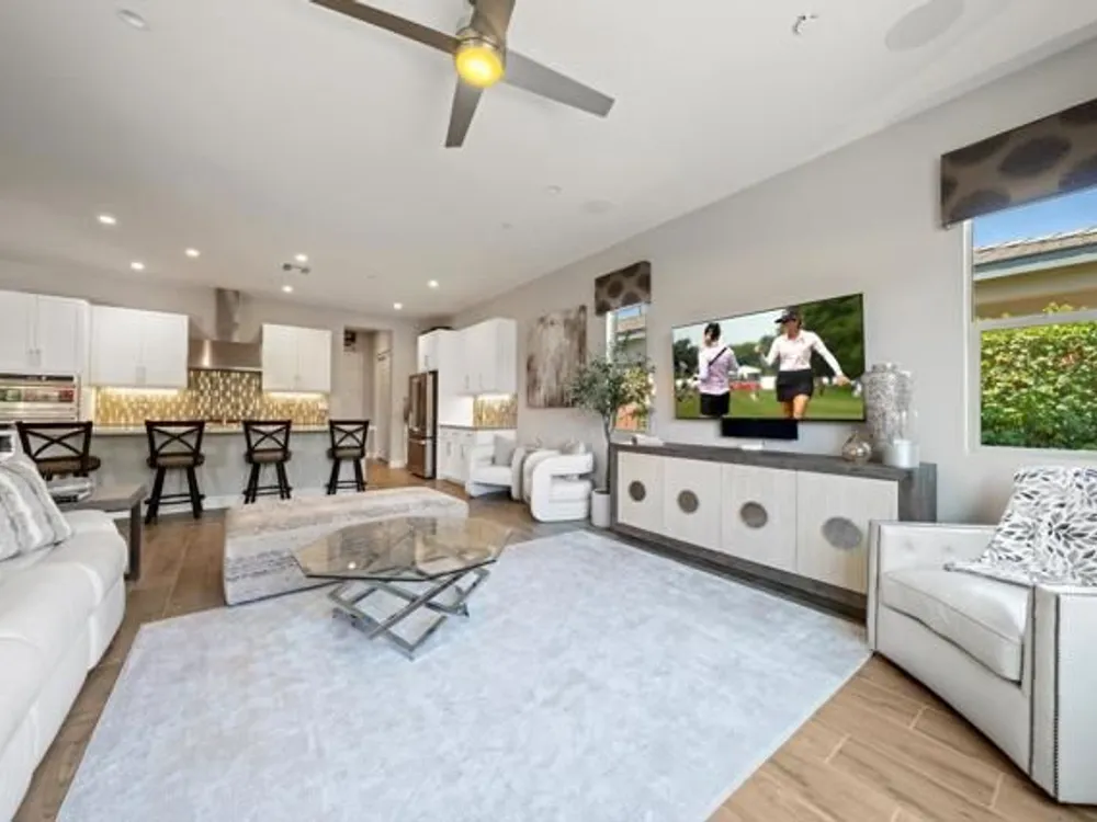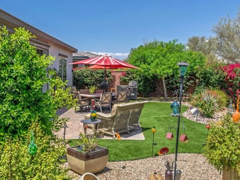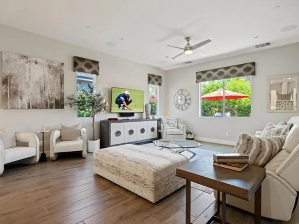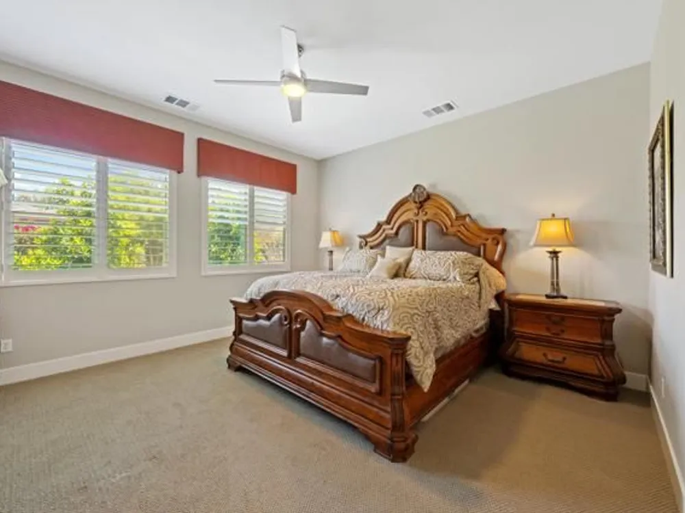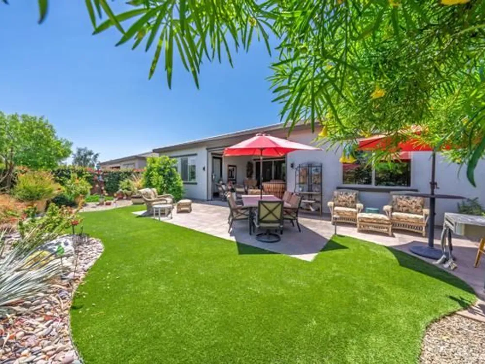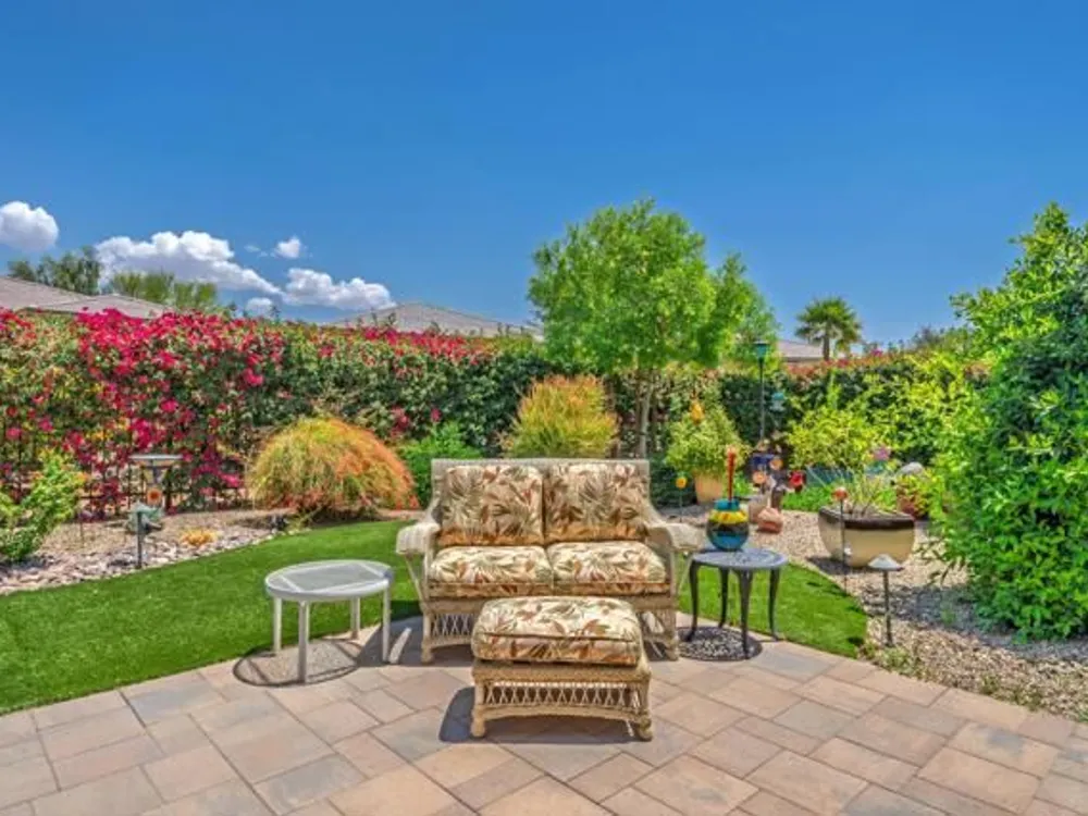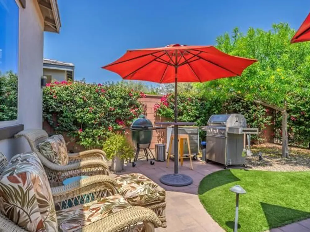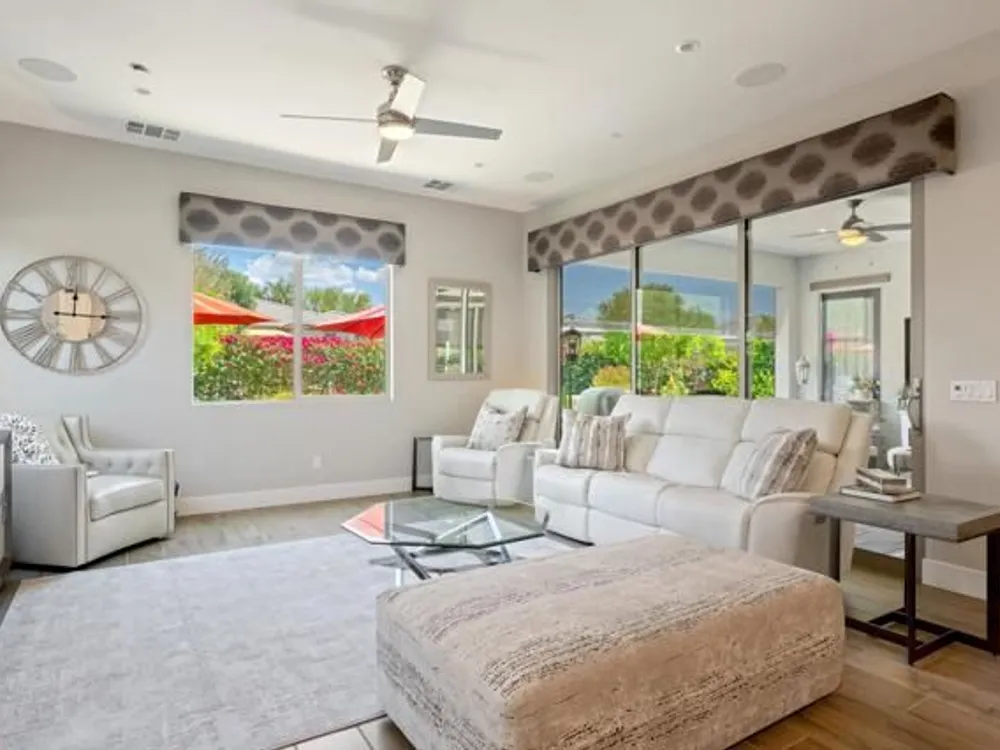 Welcome to a stunning residence at 50780 Harps Canyon Drive, nestled within the prestigious gated community of Trilogy at the Polo Club. This exquisite home exudes both charm and sophistication, offering 2 bedrooms and 2.5 bathrooms spread across a generous 2,039 square feet of living space. As you step inside, you'll be captivated by the grandeur of 10-foot ceilings and 8-foot doors, complemented by elegant tile flooring throughout the common areas. The heart of this home is the chef's kitchen, boasting a commercial-grade gas cooktop and hood, sleek stainless steel appliances, soft-close cabinets, and convenient pull-out shelves--an entertainer's dream. The seamless indoor-outdoor flow is accentuated by two rolling glass doors that open to a beautifully paved patio, perfect for hosting gatherings or simply relaxing. Enjoy the lush, low-maintenance backyard, while an electric screen on the patio ensures year-round comfort and maximizes indoor/outdoor living. With upgraded bathrooms, custom valances, electric window shades, and 5-inch base molding, every detail has been meticulously crafted. Custom paint adds a touch of elegance, creating a warm and inviting atmosphere. There is an oversized two car garage that is EV ready, with an additional golf cart garage. Adjacent to a scenic walking path, this home offers a perfect blend of privacy and community living, making it an ideal retreat for those seeking a tranquil yet vibrant lifestyle. Your dream home awaits! A Polo Club membership is available with $1,875 transfer fee. Membership includes access to the Polo Club, fitness center, pickleball & tennis courts, resort pool, lap pool, artisan studio, card room, banquet facilities, golf simulator, billiards, and so much more.