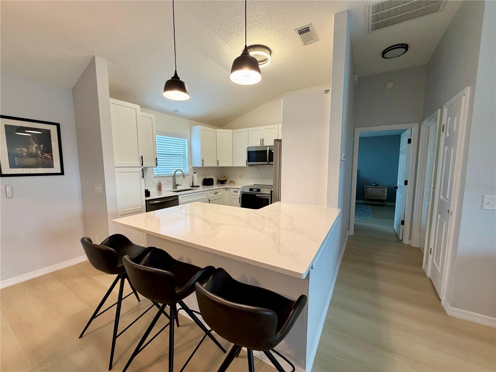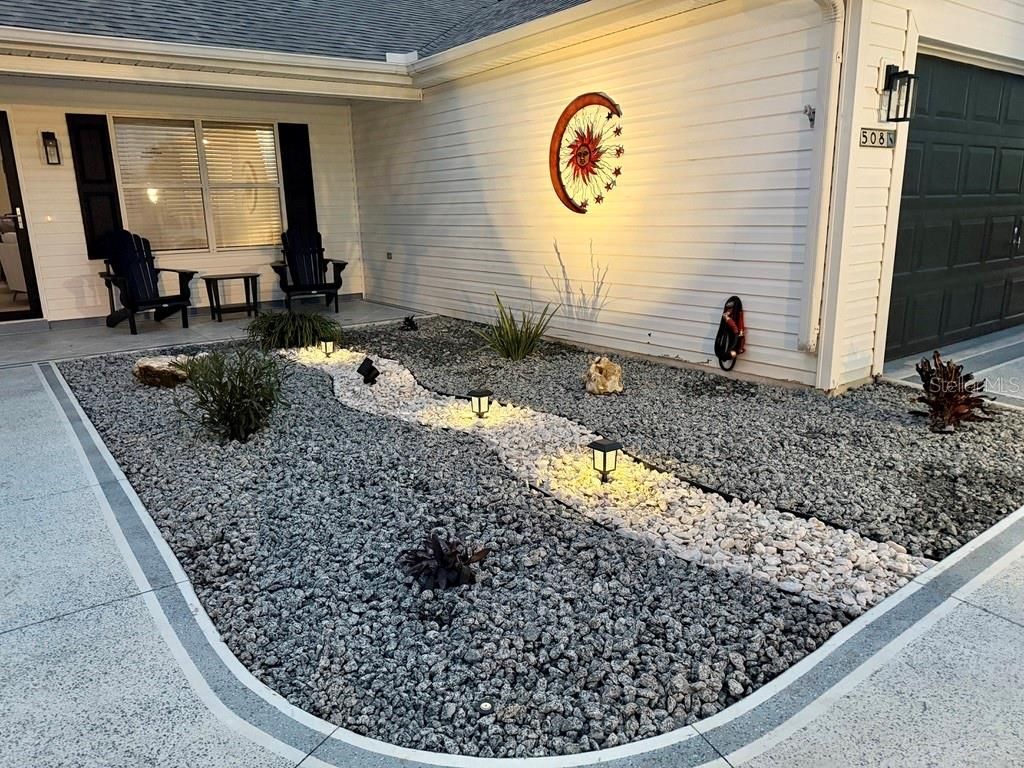 Turnkey, No Bond and Low Taxes! Welcome to this Exquisitely Renovated 2-Bedroom, 2-Bath Home with 2-Car Garage - Great Modern Living! This meticulously renovated gem offers the perfect blend of modern luxury and comfortable living. Situated near to both Lake Sumter Landing and Spanish Springs Town Centers. This 2-bedroom, 2-bathroom residence, complete with a spacious 2-car garage, has been transformed from top to bottom, ensuring a truly turn-key experience for its new owners. Step inside and be amazed as every detail has been carefully considered in this stunning renovation. As you enter, you'll immediately notice the bright and airy open concept living space, bathed in natural light. New, composite plank flooring extends throughout the main living areas, creating a seamless flow. The heart of this home is undoubtedly the brand-new gourmet kitchen. Featuring sleek, soft-close cabinetry, sparkling quartz countertop and backsplash, and a full suite of brand-new stainless-steel appliances. A breakfast bar provides additional seating and prep space, perfect for casual dining or entertaining. The two generously sized bedrooms with custom closets offer comfortable retreats. The master suite is a true sanctuary, boasting ample closet space and a spa-like en-suite bathroom. Both bathrooms have been completely redesigned with modern vanities, new fixtures, designer tile showers and updated lighting, creating serene and stylish spaces. Enjoy peace of mind with a 2016 roof and HVAC system and 2019 water heater as well as updated lanai and the exterior has been refreshed with new landscaping, enhancing curb appeal and outdoor enjoyment. The property includes all furnishings, dishes, glassware, pots and pans as well as a 2017 Yamaha golf cart. Bring your suitcase and your golf clubs and start enjoying The Villages lifestyle.