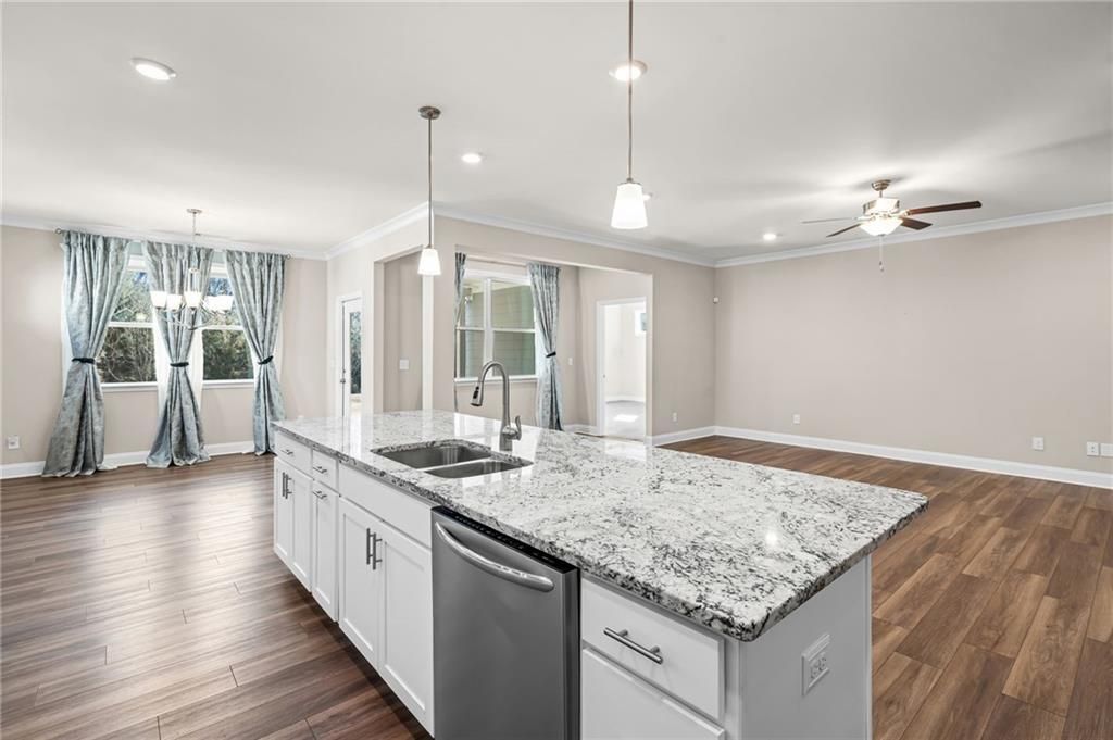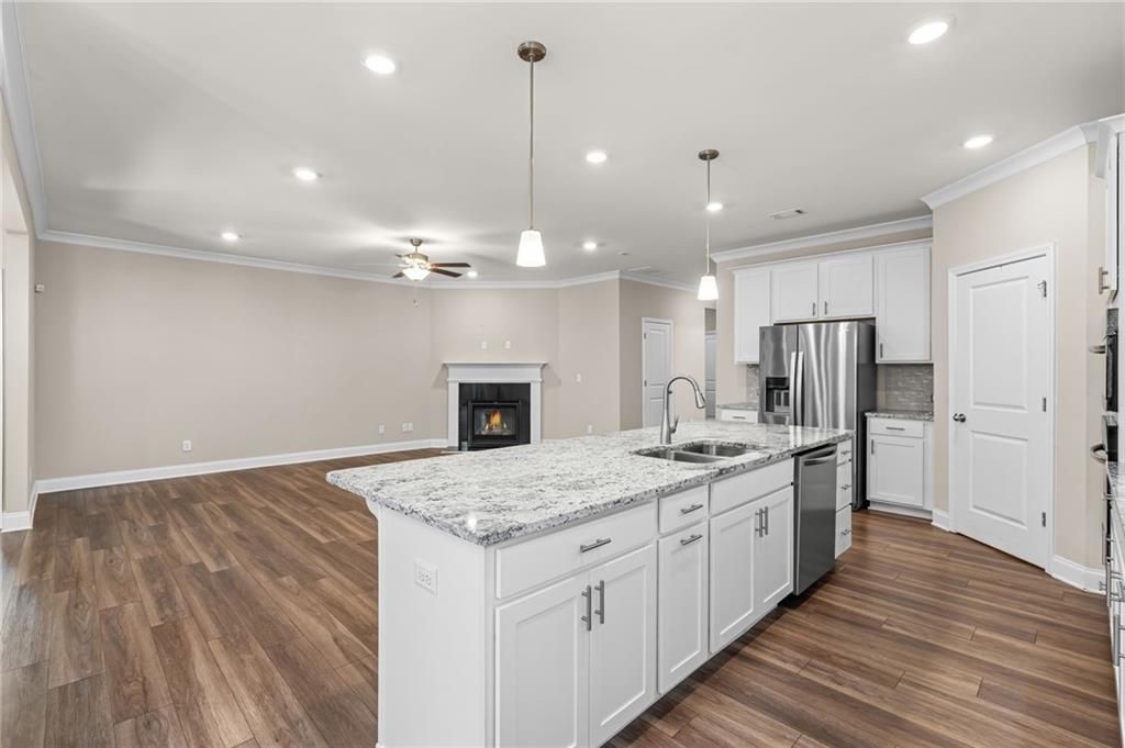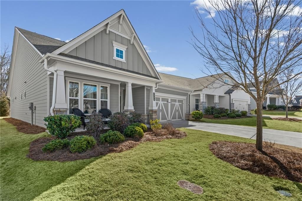 Elegant Ranch Home in the sought after 55+ community of STEPHENS POINT. Enjoy Lake Lanier with the 14-slip covered community dock, pickleball or swimming with your new friends at this beautiful active adult neighborhood. Open floor plan with 3 bedrooms and 2 bathrooms. One bedroom can be an office or bonus room. LVP flooring, Chef's kitchen with a large island, granite countertops and a gas cooktop that vents to the outside. Walk-in pantry and stainless steel appliances. Kitchen overlooks the large family room and views of the private backyard from your window. Spacious primary suite with tray ceilings and natural light. Inviting bathroom with soaking tub and shower. Granite counter double vanity sinks. Huge Walk in closet that leads to the laundry room. This home is turn key. Lots of privacy in this backyard with a covered patio. Irrigation has been added to this home for easy lawn care. Gated entry and close to restaurants, shopping and healthcare. Enjoy the amenities like the pool, clubhouse and pickleball courts. Easy walk down to the lake on a community path. Great neighborhood for a golf-cart.