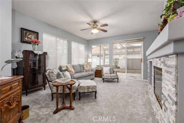 Motivated price reduction! Located on a corner lot in the fabulous community of Sun Lakes Country Club you will find this lovely Cherry Hill floorplan, and it is special! This 1277 square foot home features 2 bedrooms, 2 bath, living room with beautiful decorative stone fireplace, dining room, roomy kitchen with granite counter tops, stainless steel appliances, and yes, an indoor laundry room. The spacious living room area is surrounded by many windows bringing in an abundance of natural light. The primary bedroom features a walk-in closet, and a 3/4 attached bath with double sinks. The guest bedroom provides plenty of room for your guest to be in total comfort with the guest bathroom located right next for convenience. The indoor laundry room has a large utility sink and plenty of cabinet space. A two car garage with lots of storage space is attached to this wonderful home and the newer A/C unit is the icing on the cake. In just a couple of minutes, walk to the north clubhouse, pro-shop, swimming pool and bocce ball courts. Location in this 55+ community is one of the highlights of this delightful home. Sun Lakes Country Club is located in the San Gorgonio pass area in Riverside County and has serviced many active adults for more than 35 years. With 3 clubhouses, 2 restaurants, lounge/bar, 3 swimming pools (one indoors), tennis courts, bocce ball counts, 3 gyms, and so much more, Sun Lakes has become one of the most affordable desirable communities in Southern California. Come take a look today!