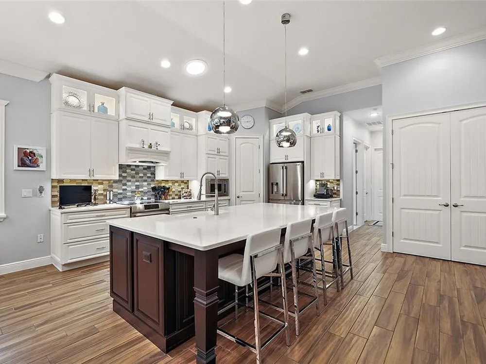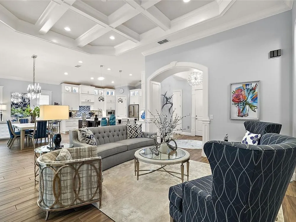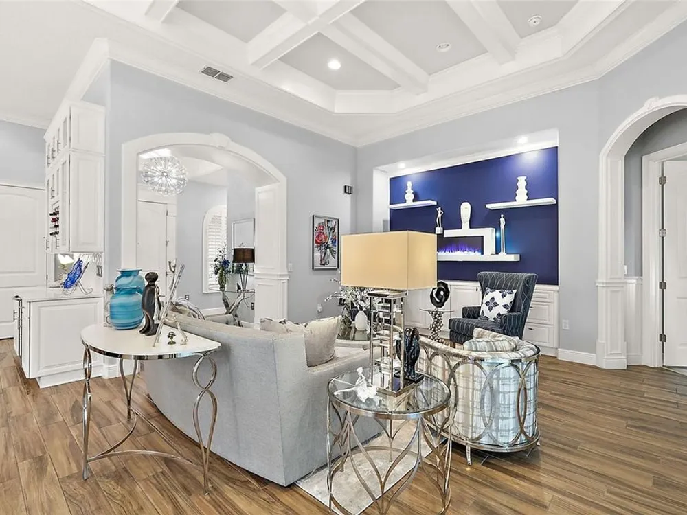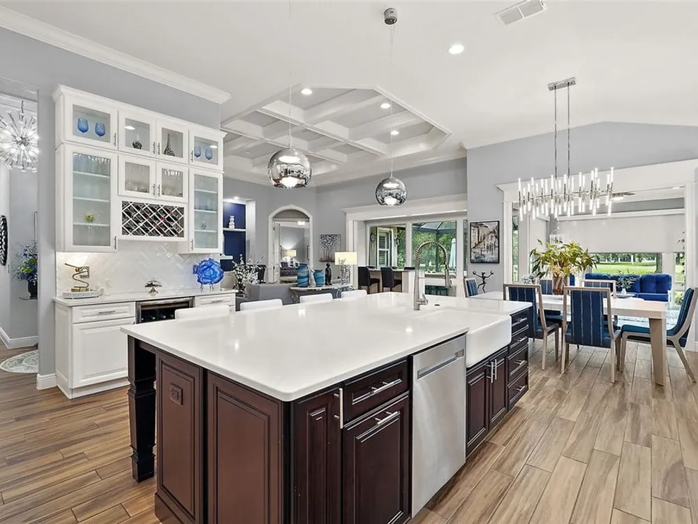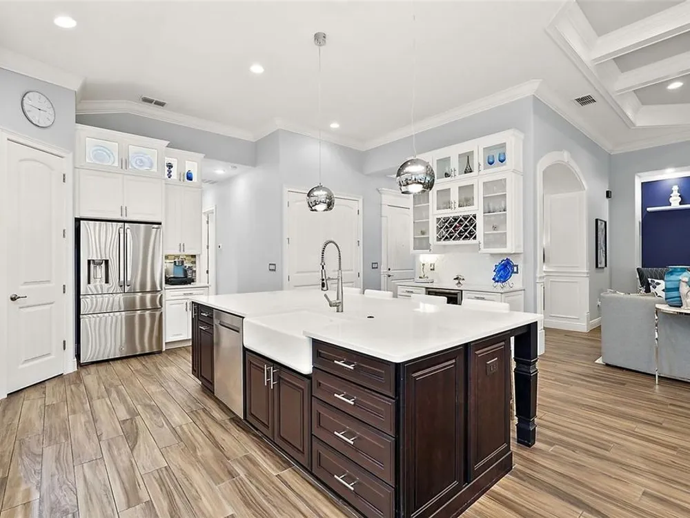 - Built-in Features, Ceiling Fan(s), Coffered Ceiling(s), Crown Molding, Dry Bar, Eat-in Kitchen, High Ceilings, L-Shaped Dining Room, Open Floorplan, Main Level Primary, Smart Home, Solid Surface Counters, Split Bedrooms, Stone Counters, Thermostat, Tray Ceiling(s), Vaulted Ceiling(s), Walk-In Closet(s), Wet Bar, Window Treatments