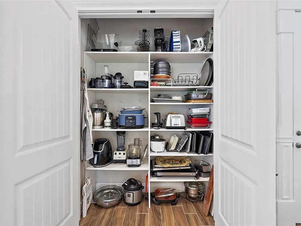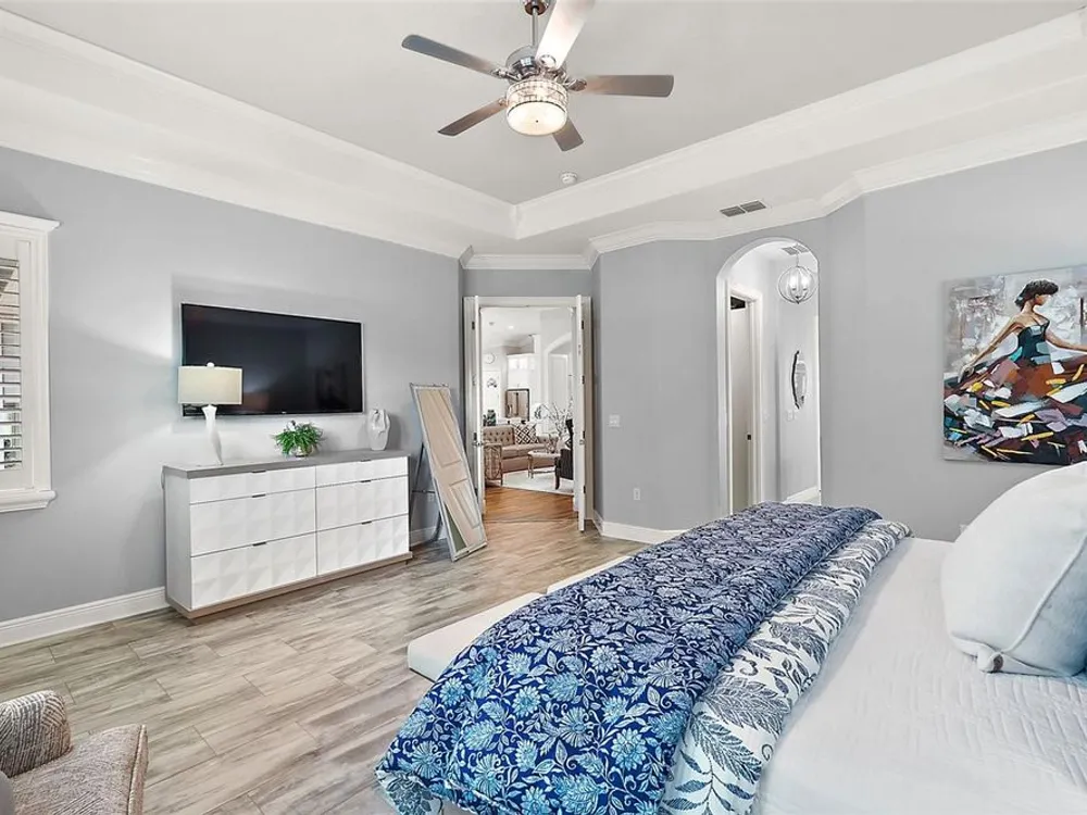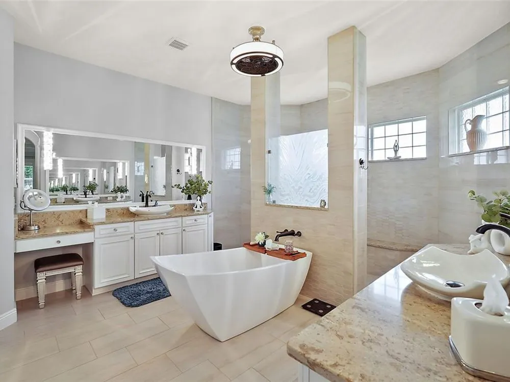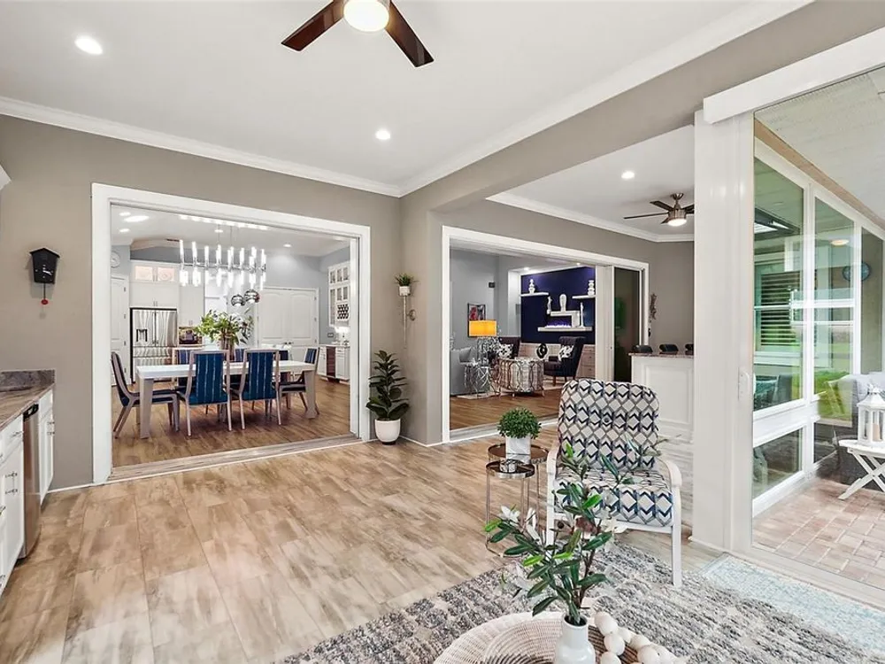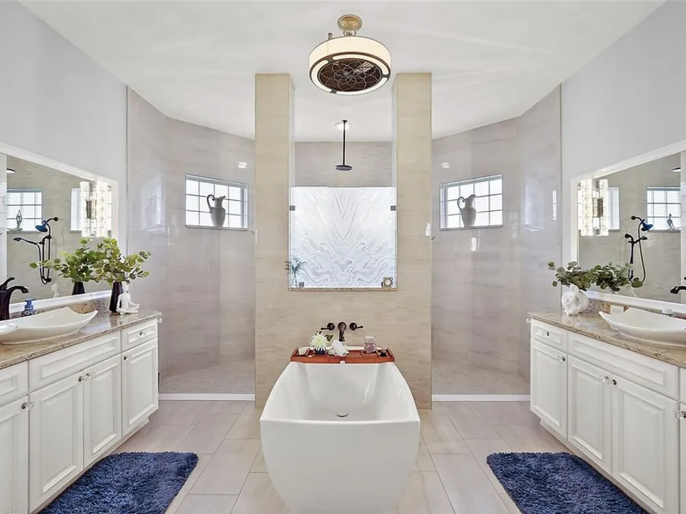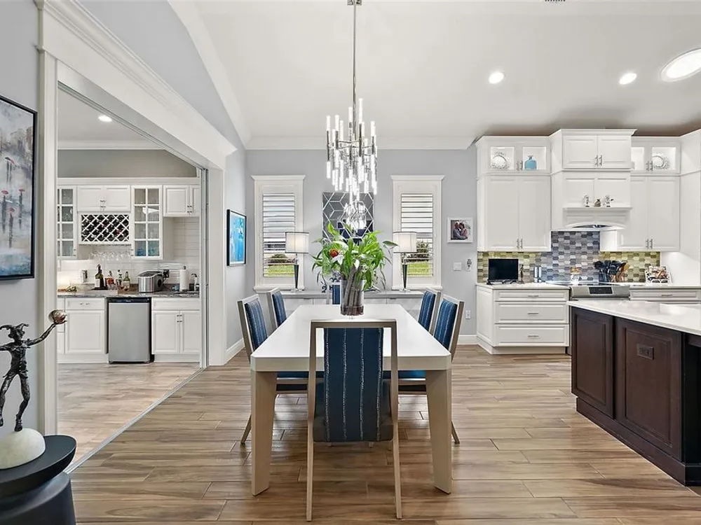 - Built-in Features, Ceiling Fan(s), Coffered Ceiling(s), Crown Molding, Dry Bar, Eat-in Kitchen, High Ceilings, L-Shaped Dining Room, Open Floorplan, Main Level Primary, Smart Home, Solid Surface Counters, Split Bedrooms, Stone Counters, Thermostat, Tray Ceiling(s), Vaulted Ceiling(s), Walk-In Closet(s), Wet Bar, Window Treatments