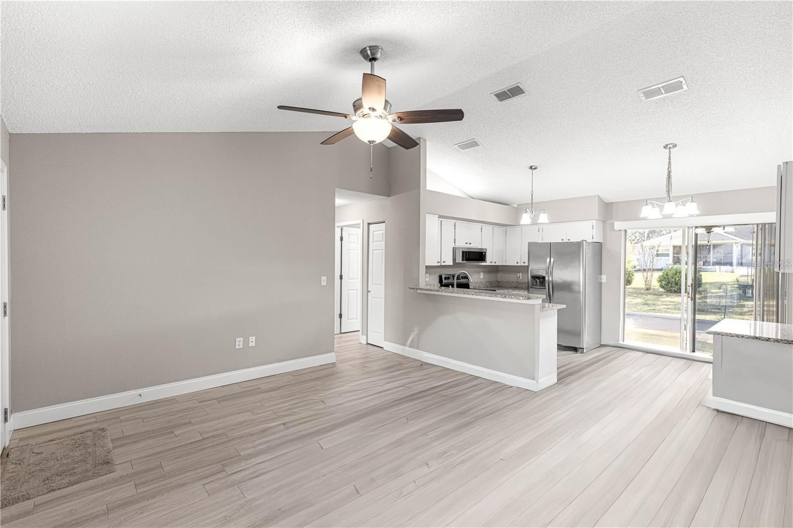 - Ceiling Fan(s), Eat-in Kitchen, Kitchen/Family Room Combo, Open Floorplan, Stone Counters, Thermostat, Vaulted Ceiling(s), Walk-In Closet(s), Window Treatments