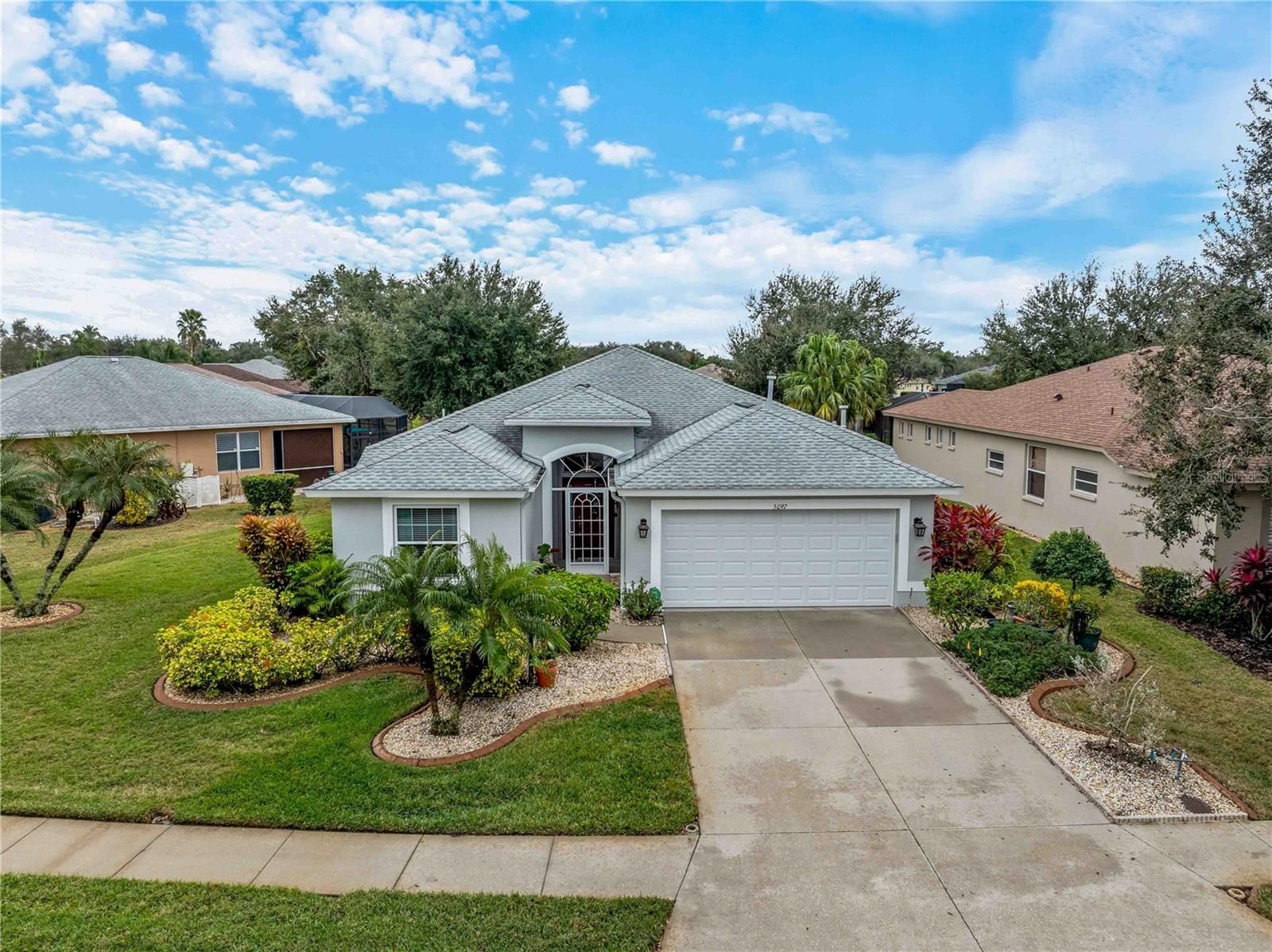 Lakeside Living at Its Finest! Meticulously maintained and move-in ready, this inviting 2 bedroom, 2 bathroom 1873 sqft home features the popular Dover Flex floor plan with 2 flex spaces ideal for open-plan entertaining, a home office, or den. Recent updates include GARAGE DOOR OPENER(2025), WATER HEATER PRESSURE VALVE(2025), FRONT ENTRANCE AND REAR LANAI REMOTE HURRICANE SCREENS(2023), GARAGE AND LANAI FLOOR RESURFACING(2023), SPA HEATER(2023), GARAGE DOOR(2022), HVAC(2022), ROOF(2021), (10) IMPACT WINDOWS(2018), AND WHOLE HOME SURGE PROTECTION / WHOLE HOME ALARM SYSTEM PROFESSIONALLY INSTALLED, providing peace of mind for years to come. The open concept layout is designed for comfort and style and flows seamlessly from the kitchen to the formal dining area and living room, enhanced by ceramic tile laid on the diagonal throughout, double tray ceilings, and corn molding. The peacefully positioned and spacious owner’s retreat offers a walk-in closet, dual vanities, and a step-in shower. Carpets in the bedrooms, den, and formal living room were cleaned December 2025. Three separate sliding glass doors open to the oversized lanai, where peaceful lake and preserve views create the perfect setting for relaxation or entertaining. The enlarged screened lanai and inground spa invite you to enjoy Florida living year-round. Ownership in The Carlyle at The Villages of Palm-Aire offers residents a heated community pool, playground, and a versatile sports court for tennis, pickleball, and basketball, all within a deed-restricted community with lush landscaping, LOW HOA dues, NO CDD fees, a pet-friendly setting, and NOT a 55+ community. An added bonus to ownership is the option to join the Palm Aire Country Club, featuring an Olympic-size swimming pool, two 18-hole championship courses, a clubhouse with dining, eight lighted Har-Tru tennis courts, a state-of-the-art fitness center, and a playground. Family-friendly with a mix of residents and organized activities such as book clubs and bunco, this home is conveniently located near the Sarasota-Bradenton International Airport, University Town Center, local shopping and dining, and the beautiful renowned Gulf Coast beaches. Schedule your private showing today and come experience firsthand the comfort, views, and lifestyle this exceptional home and community offers—you won’t want to miss it.