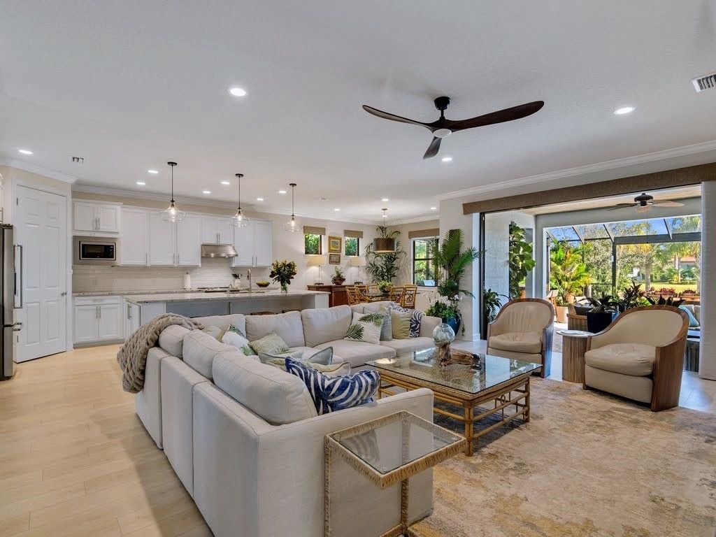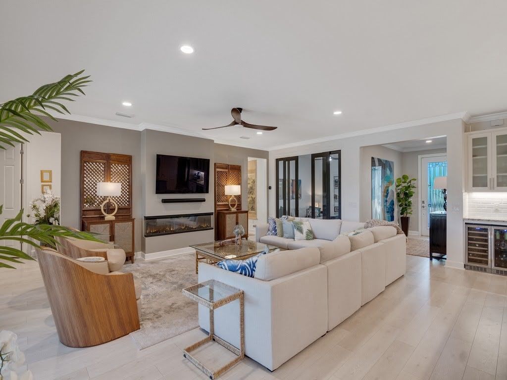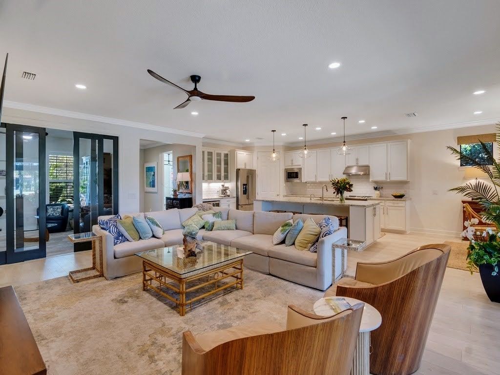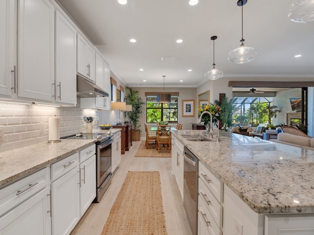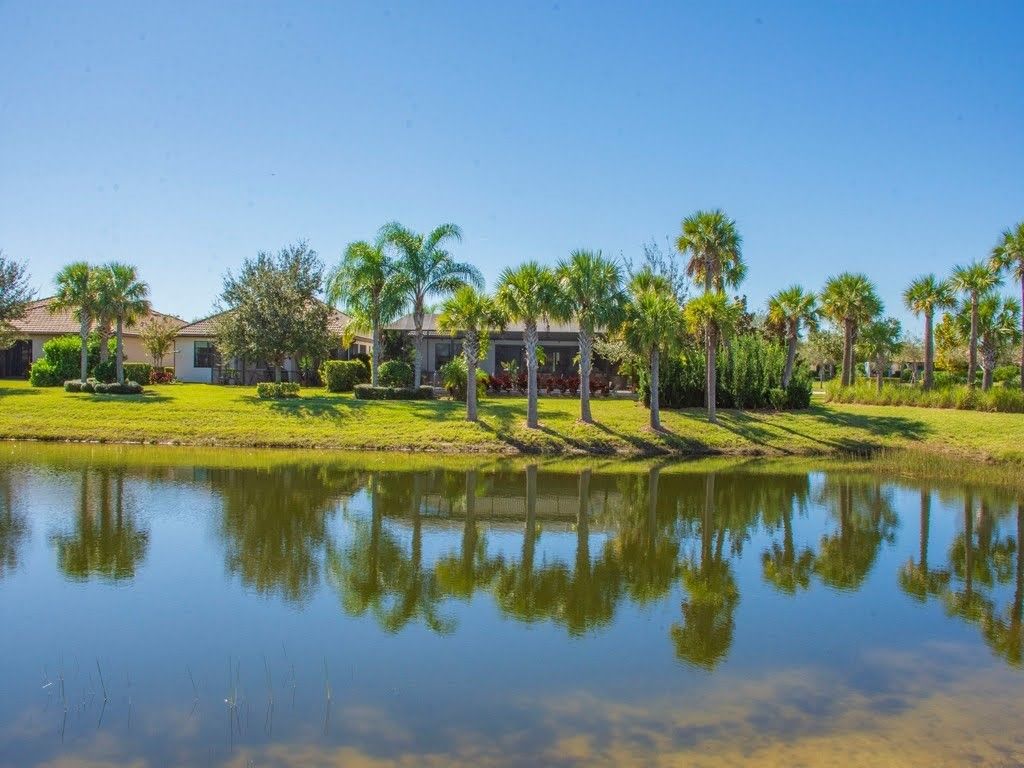 Welcome to your tropical paradise! Stunning four-bedroom, three-bathroom featuring a saltwater pool/spa, Offered turnkey for your immediate enjoyment this winter. Enhanced w/impact glass and numerous upgrades (see slide). Exceptional indoor/outdoor entertaining, complete with a full-service outdoor kitchen and bar in a beautifully landscaped backyard with lake views. Located on a corner lot in the desirable Lakes at Waterway Village gated community, just a short stroll from resort-style amenities. HOA includes cable, internet, and individual yard care. A unique opportunity not to be missed!