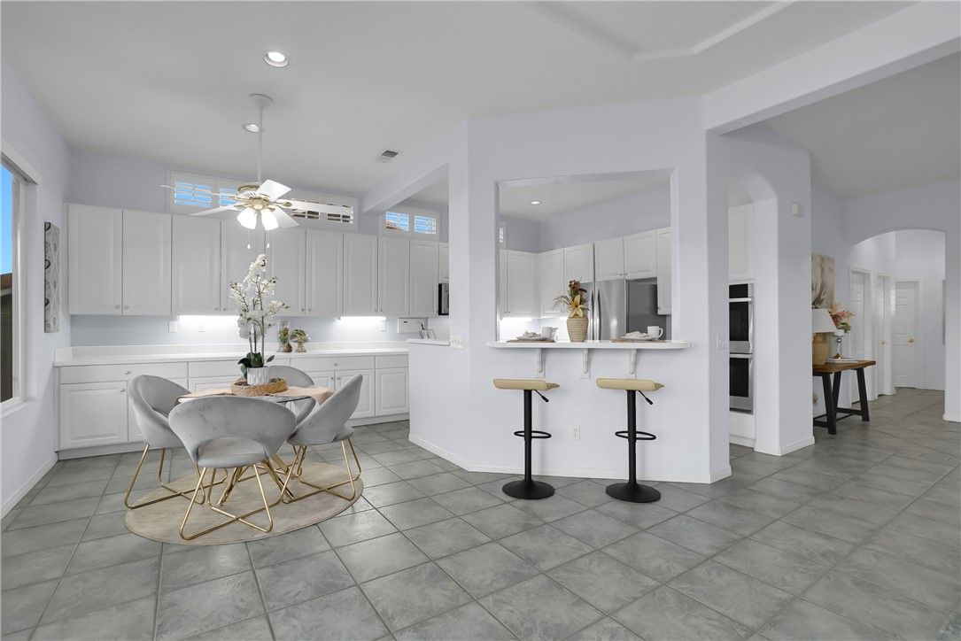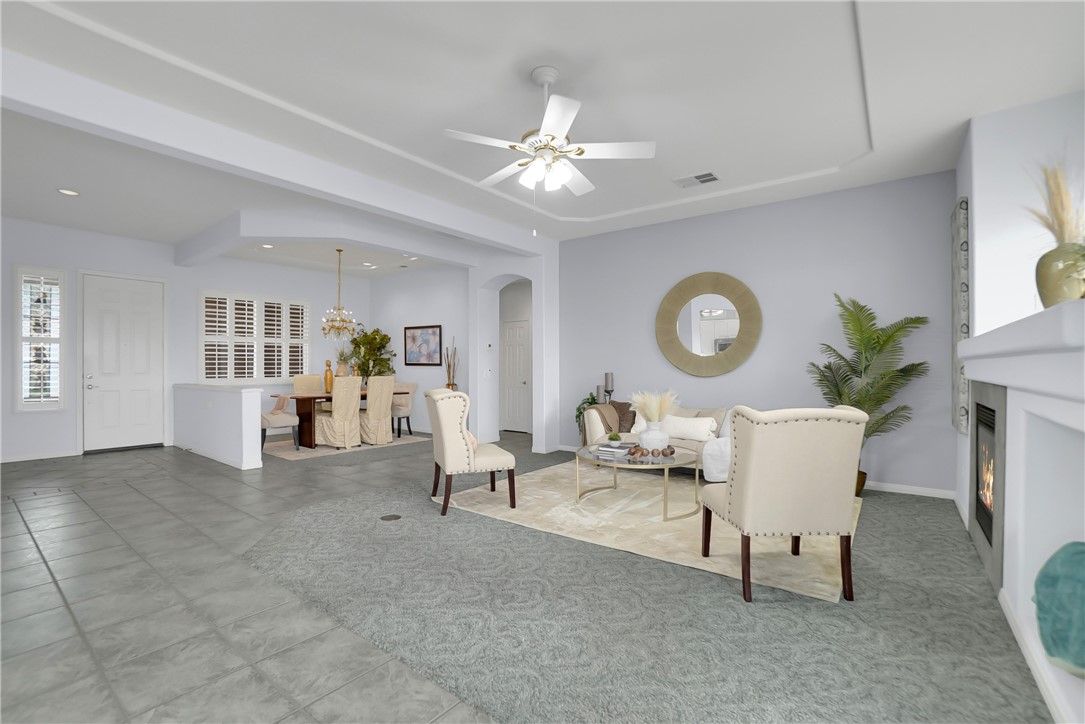 SQ per tax roll. Golf course & mountain View!! No Mello Roos. Welcome to spacious appx. 1,882 sq. home office 3 bedrooms, 2 full baths, inviting floor plan designed for comfort, functionality, and scenic living in beautifully fully furnished home like a model single-story. Step inside to find freshly painted interior, nicely decorated, recessed lighting and a bright, airy living space that flows effortlessly from room to room. The living futures a cozy built-in fireplace, custom cabinetry for TV and decor, and large window Fraiming stunning views of the golf course and mountains. The open kitchen offers ample counter space, abundant storage, and direct sightings to both the living area and backyard perfect for entertaining. A flexible bonus area nearby can serve as a home office, reading nook, hobby space. The primary suite is a private retreat with a walk-in closet, luxurious ensuite bath featuring a walk-in showering jetted soaking tub, and tranquil views of the outdoors. Ceiling fans in every room ensure year-round comfort. Step outside to your own private oasis complete with a covered patio, a putting green, and beautifully landscaped grounds overlooking the lush golf course and natural wash for added privacy. The attached garage provides generous built-in cabinetry, drawers, and a workbench ideal for storage and projects. Enjoy resort-style living with access to Sun Lakes' World-class amenities, including golf courses, swimming pools & Spa (including indoor), fitness centers, clubhouses, restaurants, tennis courts, pickle ball, and many more social activities all in a vibrant, gated community. Ready to move in condition and waiting for you without any stress.