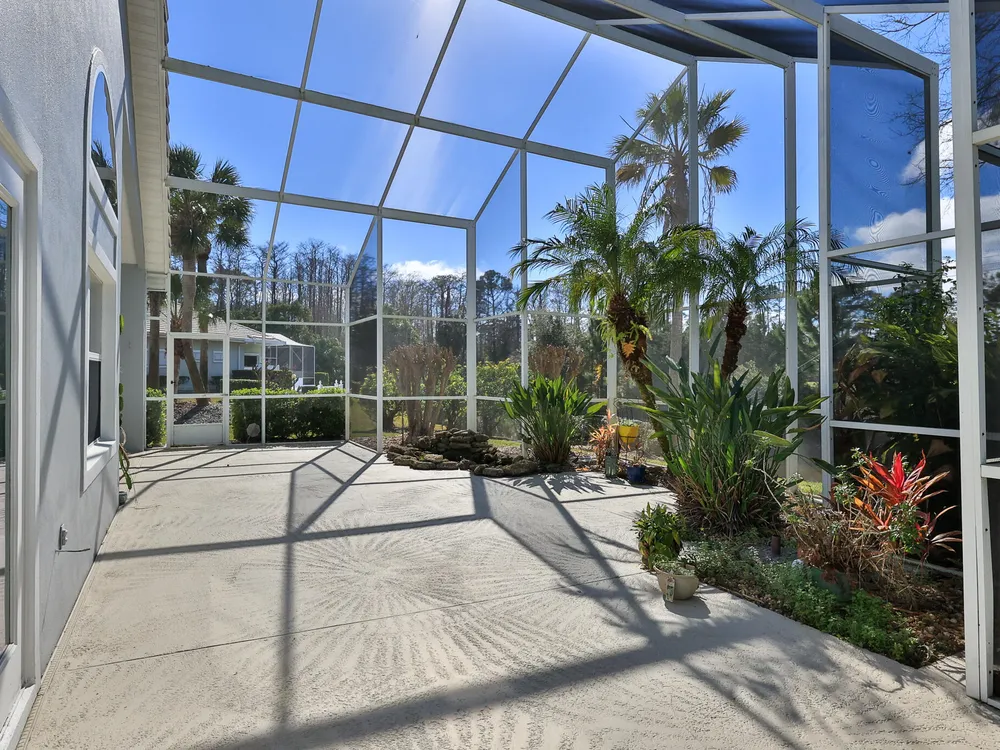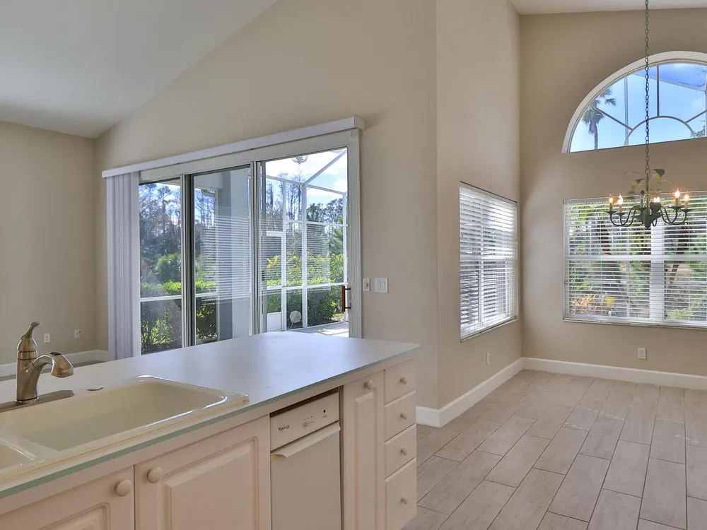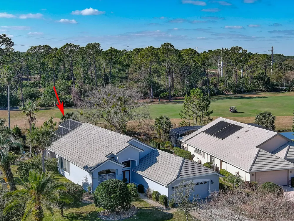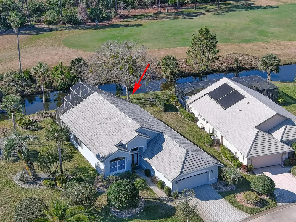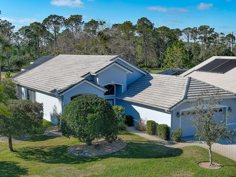 This lovely 3BR 2 BA home is located in the highly desirable Plantation Bay golf community. This spacious home is situated in the heart of the Bay Pointe neighborhood with water and golf course views. The home boasts large rooms with volume ceilings and huge windows for a light and bright home. The large living/dining area opens to lanai, The kitchen has large eating area with views of golf course. The extended screened lanai is perfect for entertainment. The 3rd BR is used as a den with built-in shelves and cabinets. The master suite has doors to lanai and vaulted ceiling and large master bath with double vanity, tub and separate shower and walk in closet. Guest bedroom is oversized with large closet. Guest bath with shower. Oversized garage with sink and tons of storage cabinets. New a/c installed 2024. Exterior painted in 2022. New tile flooring installed in 2021. Located on a cul de sac, close to the fabulous new clubhouse. OWNER FINANCING POSSIBLE.